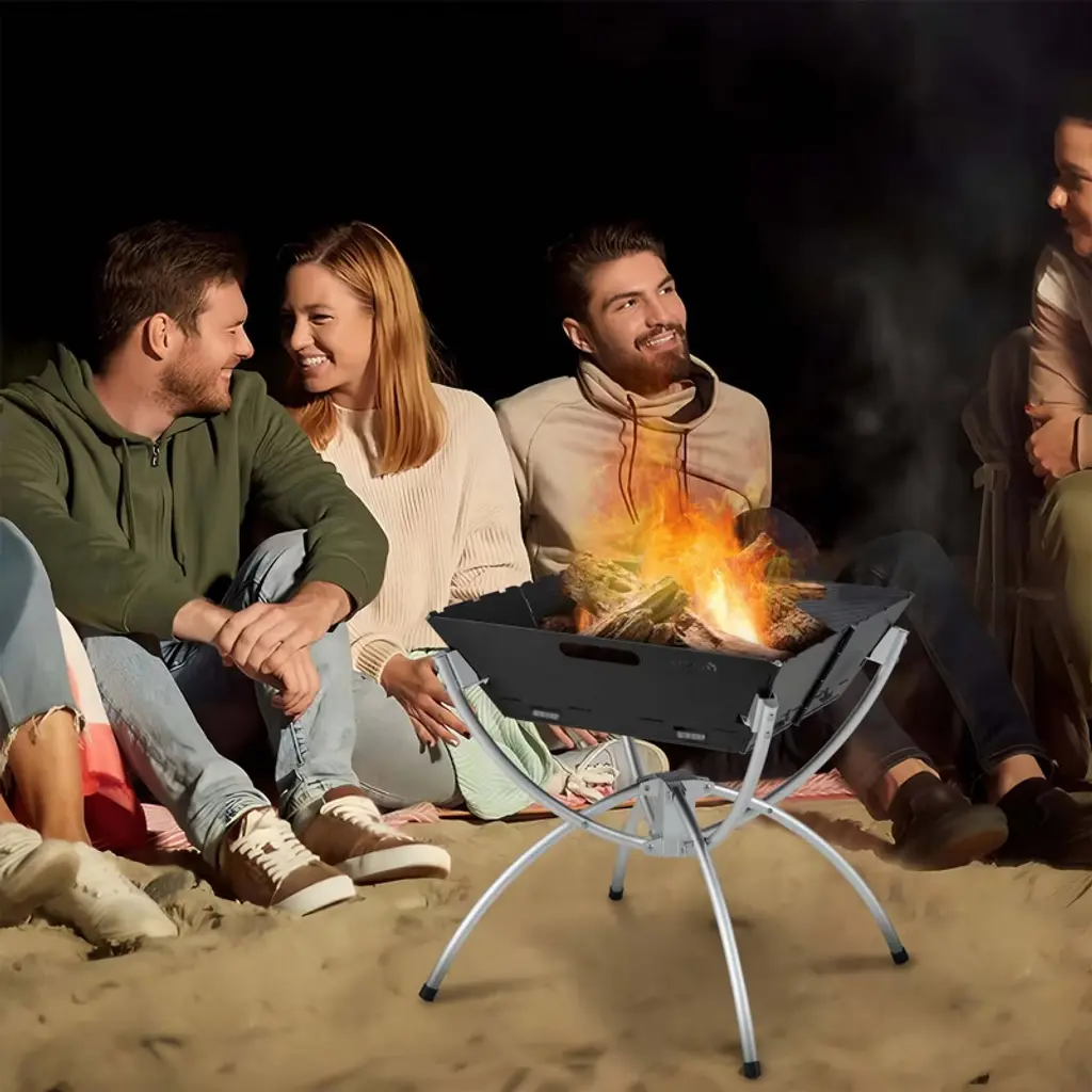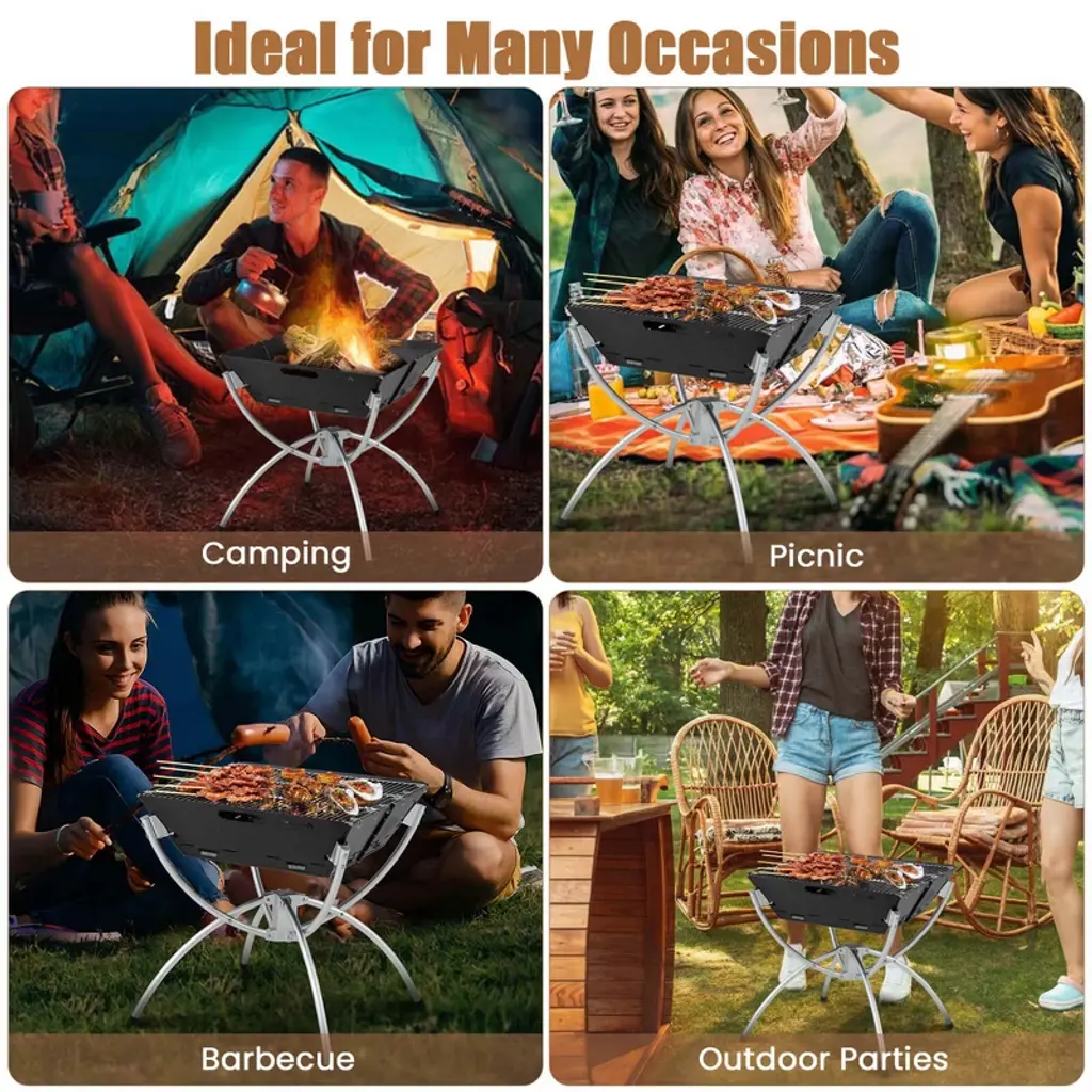 This versatile fire pit will bring you a perfect camping experience. Including 3 pieces of grills, the fire pit is suitable for various fuel options such as carbon, logs, and bio-pellets. Whether you’re in the mood for a campfire, a BBQ, or heating up a meal while camping, this fire pit has got you covered. And the robust 304 stainless steel grill and zinc iron alloy fire bowl is rustproof and heat-resistant for long-time use. The aluminum legs with anti-slip footpads provide sturdy support, ensuring a stable and safe experience. With its well-ventilated design, the fire pit allows for continuous burning thanks to its multiple ventilating holes and raised fire wood racks. Assembly is hassle-free and quick as all parts of the firepit is easy to detach or install. And the carrying bag and gloves included will offer you more convenience. Upgrade your outdoor activities with this versatile and reliable 3-in-1 fire pit. FeaturesTriple Usage meets multiple demands: campfire, BBQ grill, camp stove sturdy with stainless steel and zinc alloy construction Aluminum supporting legs for strong support Excellent ventilation system for efficient and continuous burning Easy to transport with included carrying bag Bonus gloves bring convenience for assembly and disassembly Collapsible design for easy storage and quick assemblyColor:Black/Coffee Material: 304 Stainless Steel, Zinc Iron Alloy, Aluminum Overall Dimension: 18" x 18" x 19.5" (L x W x H) Dimension of Each Grill: 17.5" x 5.5" (L x W) Dimension of Carrying Bag: 24" x 6" x 6" (L x W x H) Net Weight: 9.5 lbs Package Includes: 1 x Outdoor Fire Pit 3 x Grills 1 x Carrying Bag 1 x Pair of Gloves 1 x Instruction