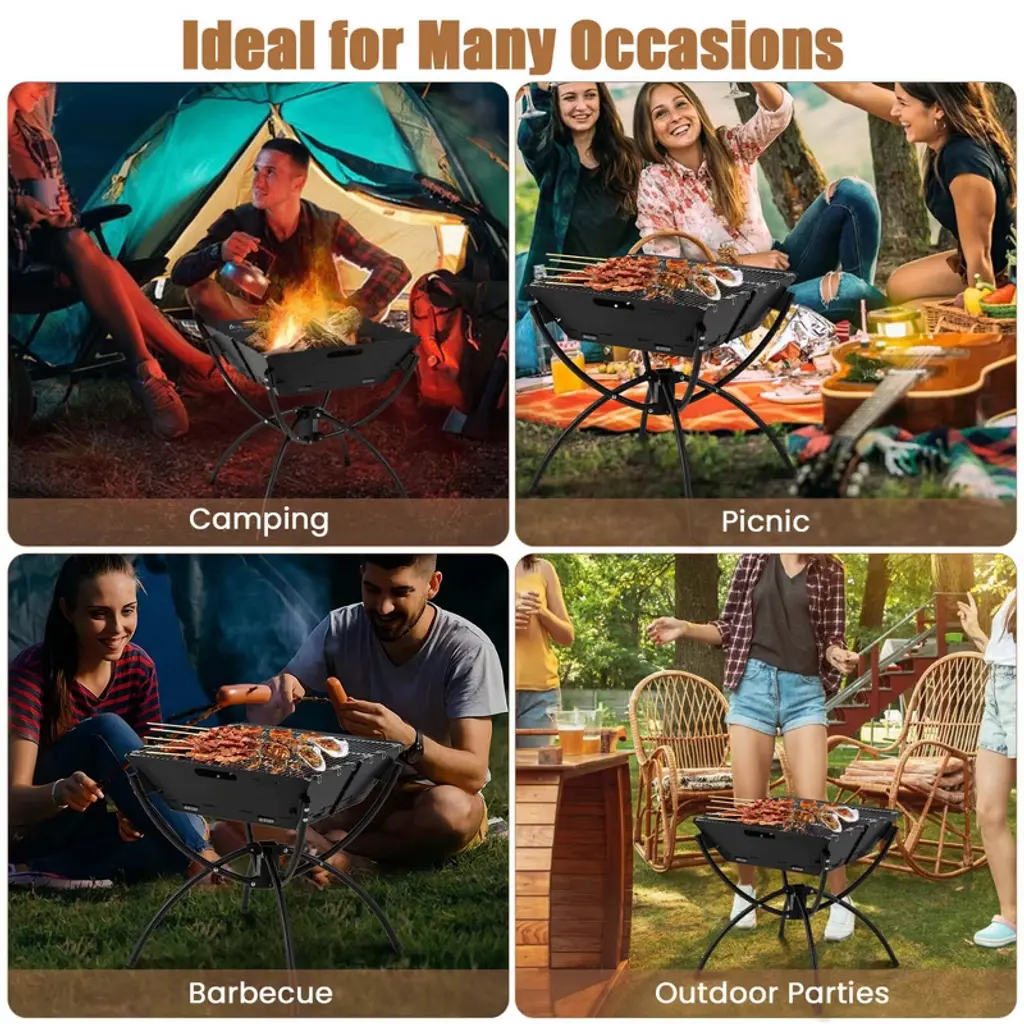 Costway 3-in-1 Portable Charcoal Grill Folding Camping Fire Pit With Carrying Bag & Gloves Coffee