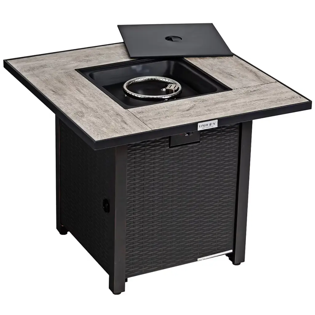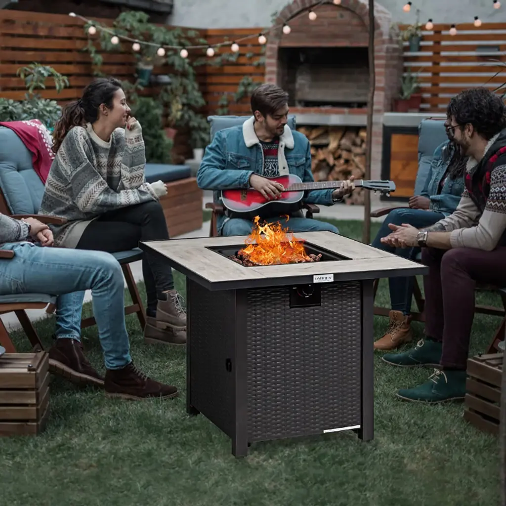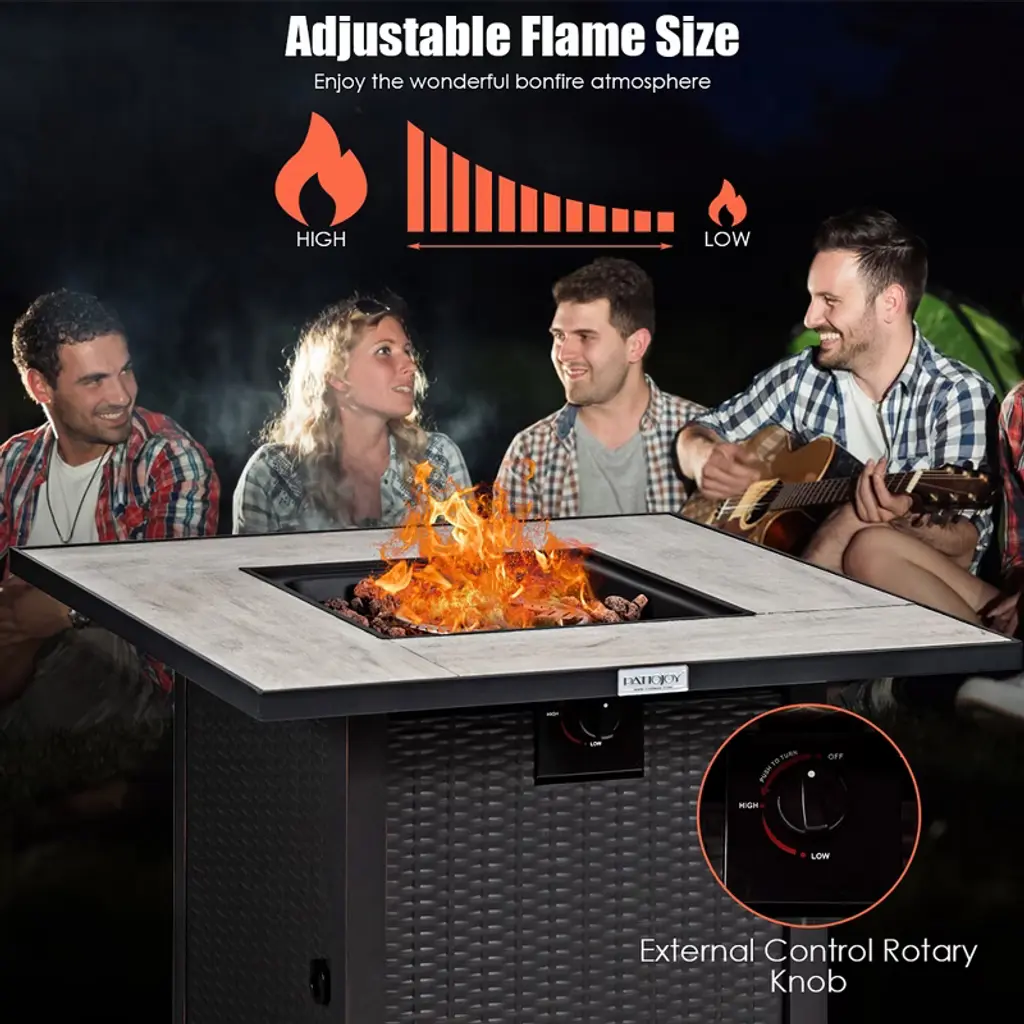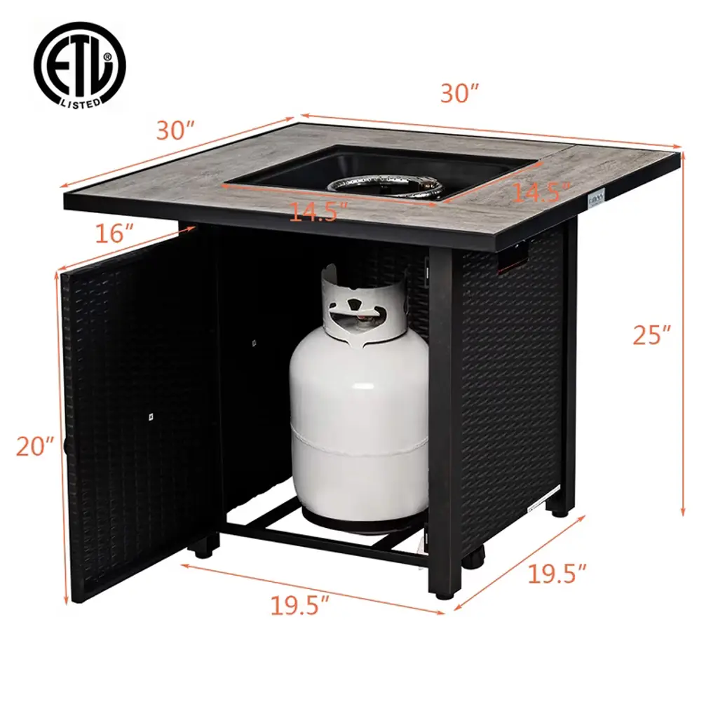 Do you want to have a party outdoors with family and friends on a cold winter day? Our fire pit table has a heat output of 50,000BTU, which can not only bring you warmth, but also increase the atmosphere. Made of heavy-duty steel material, the fire pit table ensures the durability and sturdiness for long servicing life. More, the waterproof PVC cover provided is convenient for outdoor use. Most importantly, our fire pit table uses propane gas to support green burning, so you don't need to worry about any ash that could harm your health. Besides, the multi-functional design allows you to use it as an ordinary coffee table after covering the lid. Elegant appearance can add a unique charm to your outside space. You can put it in the backyard, balcony, garden, etc. Please use our products to create a warm environment and a good time for family or friends. FeaturesMade of sturdy steel frame to ensure the durability and stability CSA certified regulator and ETL certified fire pit table 50,000 BTU heat output can provide sufficient heat outdoors Decorative lava rocks included can make the flame more evenly Adjustable foot pads ensure extra stability The 2-in-1 function can be used as a fire pit table or coffee table The ignition device easily regulates the flame Door with magnetic clasp to hide the internal space Weather resistant PVC cover for better storage Ceramic tabletop and simulated rattan stripes increase aesthetics Easy to assemble, detailed instructions will be provided Ideal for your backyard, garden, balcony, etcColor: Black Material: Steel Overall Dimension: 30'' x 30'' x 25''(L x W x H) Heat Output: 50,000 BTU Propane Stove Capacity: 20 lbs. Net Weight: 61lbs Package includes: 1 x Outdoor Fire Pit Table 1 x PVC Cover 1 x Instruction