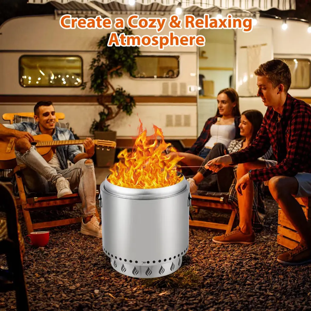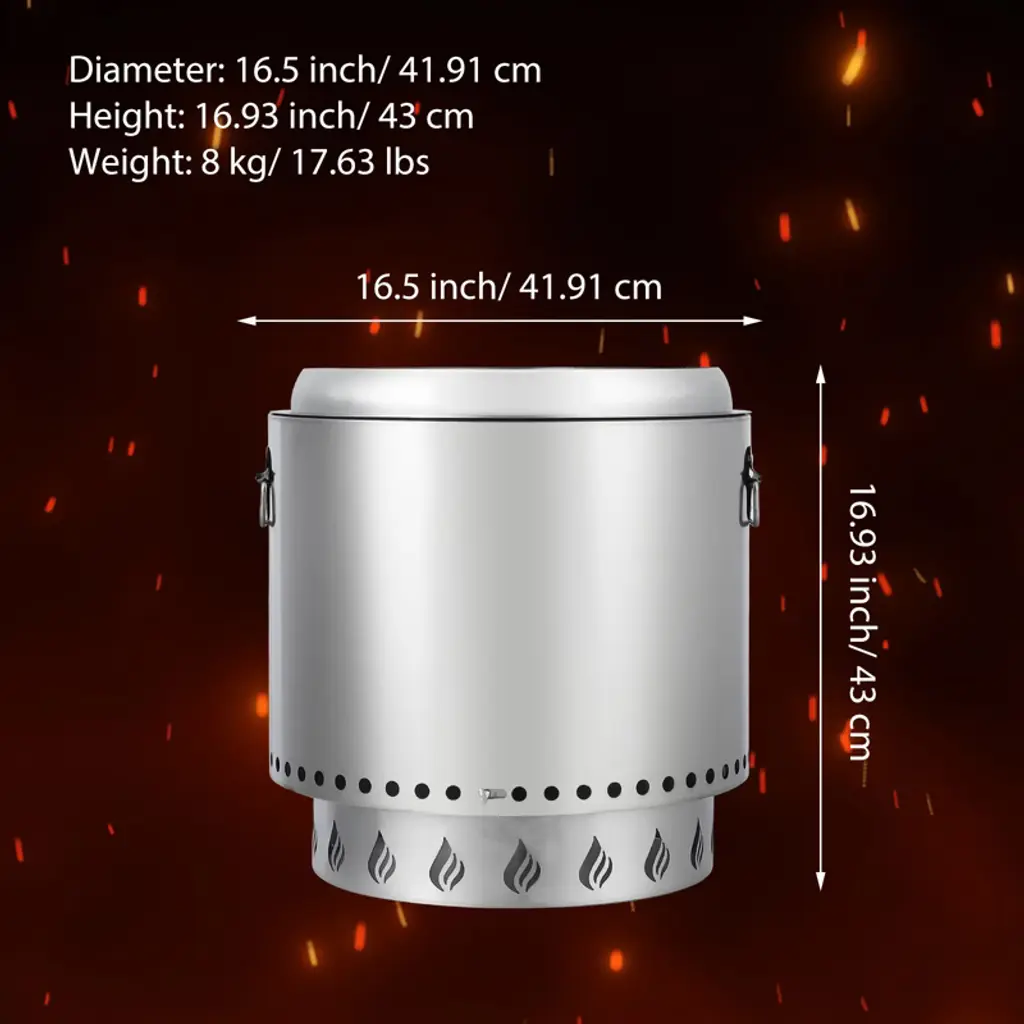Features:Measuring 16.5 inches, this smokeless fire pit is designed for both convenience and portability, making it easy to bring along on your outdoor adventures. Its innovative secondary combustion technology effectively minimizes emissions, ensuring a cleaner and more enjoyable fire experience.With an adjustable flame control air switch, you can easily customize the fire to meet your preferences. Additionally, optional stand and stove hook accessories are available for added convenience.Ideal for family gatherings, this fire pit not only provides warmth but also enhances your outdoor space with a cozy ambiance.Specifications:The Product Dimensions: 16.5" x 16.5" x 12"Material: Stainless SteelFuel Type: WoodColor: SilverNotes:1.When using the fire pit, please ensure that there are no flammable materials nearby and maintain a safe distance from other people.2.If you encounter any issues, our team is here to promptly and efficiently assist you in resolving them. Feel free to reach out to our online service team for any inquiries or support you may need.