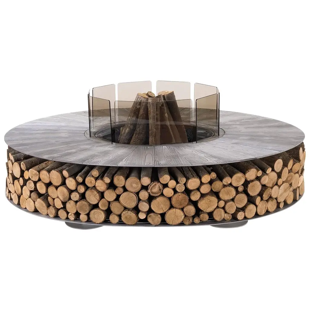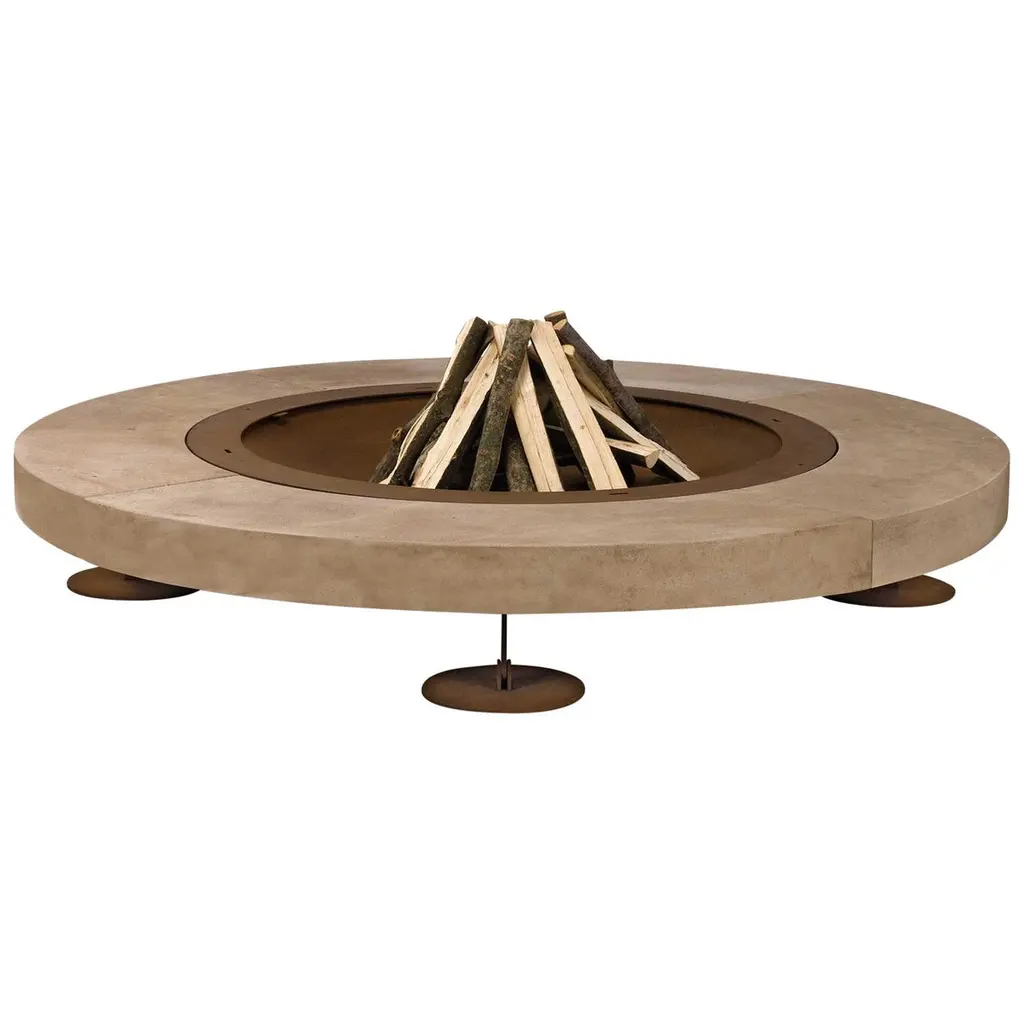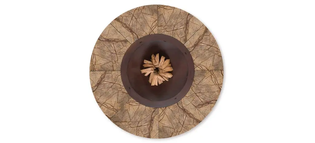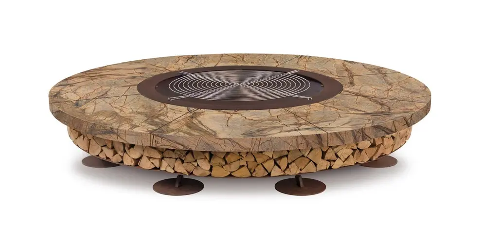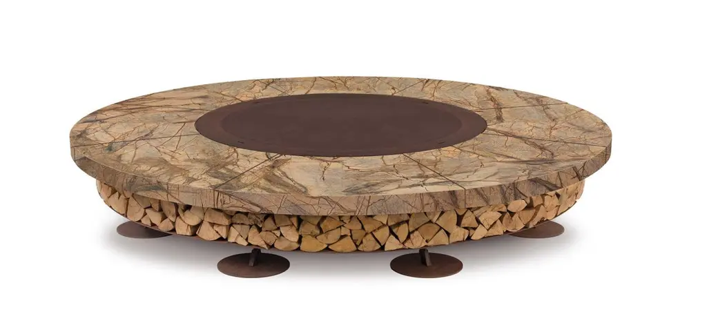 Ercole large Rain Forest brown marble fire pit by AK47 DesignRain Forest brown marble fire pit Ø2500 mm.Ercole is a outdoor wood-burning fire pit.It is born by the union of two raw materials – the steel as a structural element and the marble which decorates and enhances its design.Not a simple hearth, but a decorative outdoor furnishing, strong and statuesque.Many people can gather around Ercole, creating a convivial focal point outdoors that only the light and the warmth of fire can give.Ideal for spaces where nature, rich in its colours, is triumphant.The fire pit is made up of a supporting steel framework with the visible components finished in oxidised steel, which are given a special treatment to prevent corrosion.The upper stone surface is made with Rain Forest green marble, which is brushed to give a gently distressed finish to the stone. Rain Forest green is from India, and is a refined marble with a strong and dominant texture – it displays a green musk background with veins of a brown tone.Being a natural material, the marble’s grain may vary depending on the period of extraction.The lower part of the fire pit is a generously-sized log storage which best defines the object.Ercole is supplied with a steel cover plate to cover the combustion chamber when not in use, in order to prevent the escape of ashes in the wind and rain.When in use, the upper part of the fire pit does not overheat.With the dedicated stainless steel grill kit, the fire pit can also be used as a barbecue.Fire pitØ2500 H400 mmCod. BIA250Z18 Grill kitØ940 mmCod. BAB094Z17 Total weight approx. 1.050 Kg This product may display superficial irregularity and chromatic variations due to the use of materials and finishes which are enhanced by the natural ageing process, thus guaranteeing the uniqueness of Ercole.Provided as an assembly kit.The assembly requires at least two people.Assembly difficulty rating: easy.Includes: Cover plate and grill kitLogs not included.