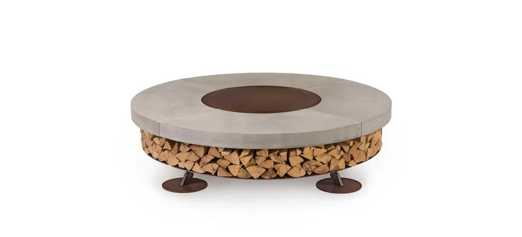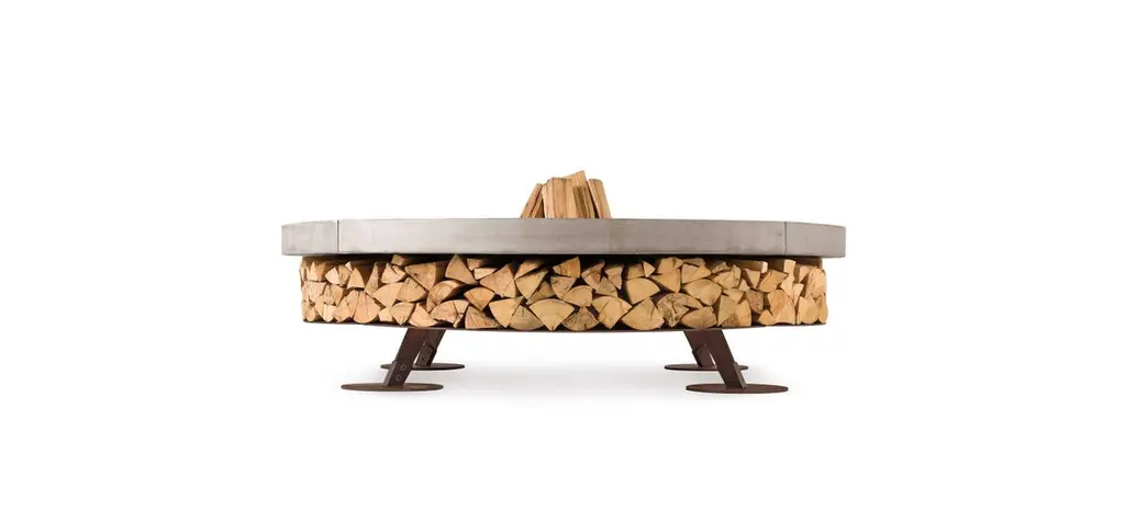Ercole small fire pit by AK47 design.Grey concrete fire pit Ø1500 mm.Ercole is a outdoor wood-burning fire pit.It is born by the union of two raw materials – the steel as a structural element and the concrete which decorates and enhances its design.Not a simple hearth, but a decorative outdoor furnishing, strong and statuesque.A good sized group of people can gather round Ercole, creating a convivial and seductive focal point in the garden.Ideal for places where the space is limited, as gardens, terraces, hotels and common spaces.The fire pit is made up of a supporting steel framework with the visible components finished in oxidised steel, which are given a special treatment to prevent corrosion.The upper concrete surface is handmade with great artisanal skill, and is given a protective sealant treatment to prevent any surface dust.The lower part of the fire pit is a generously-sized log storage which best defines the object.Ercole is supplied with a steel cover plate to cover the combustion chamber when not in use, in order to prevent the escape of ashes in the wind and rain.When in use, the upper part of the fire pit does not overheat.With the dedicated stainless steel grill kit, the fire pit can also be used as a barbecue.Specification:Ø 59" x H 15.7"Includes: Cover plate and grill kit.