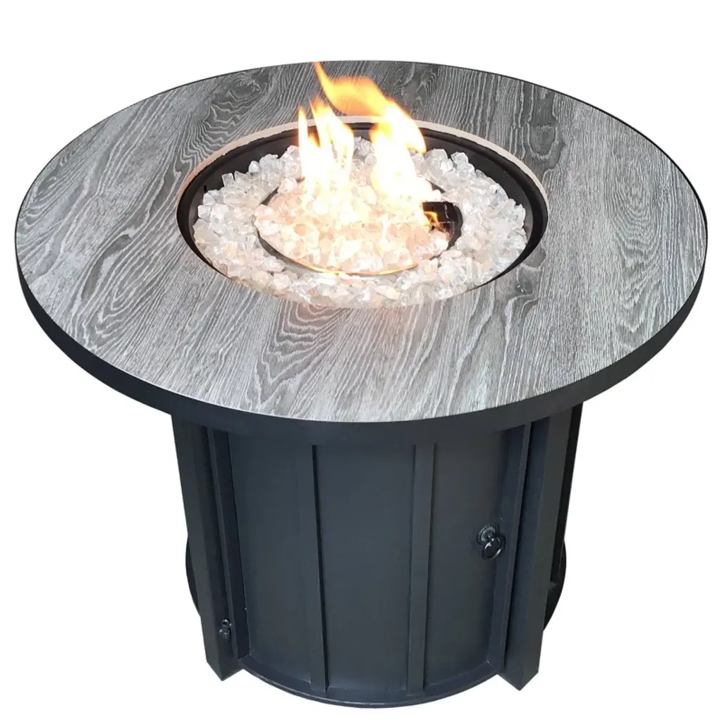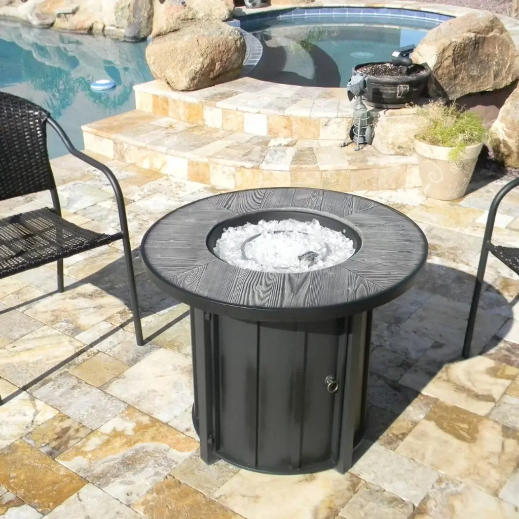 The AZ Patio Heater Propane Faux Wood Tile Top Fire Pit blends in beautifully with your outdoor seating area. The solid steel construction is incredibly durable and a black finish gives it a rustic look that suits outdoor living. An integrated ignition gives way to a propane heater that emits up to 40,000 BTUs of heat. Clear fire glass covers the burner and adds a touch of elegance. An easy access door located at the base allows you to conceal a 20 lb. propane tank (not included). And for your added safety, this fire pit comes with a thermocouple flame failure device. Measures 30L x 30W x 25H inches; CSA approved. Includes cover for burner area.