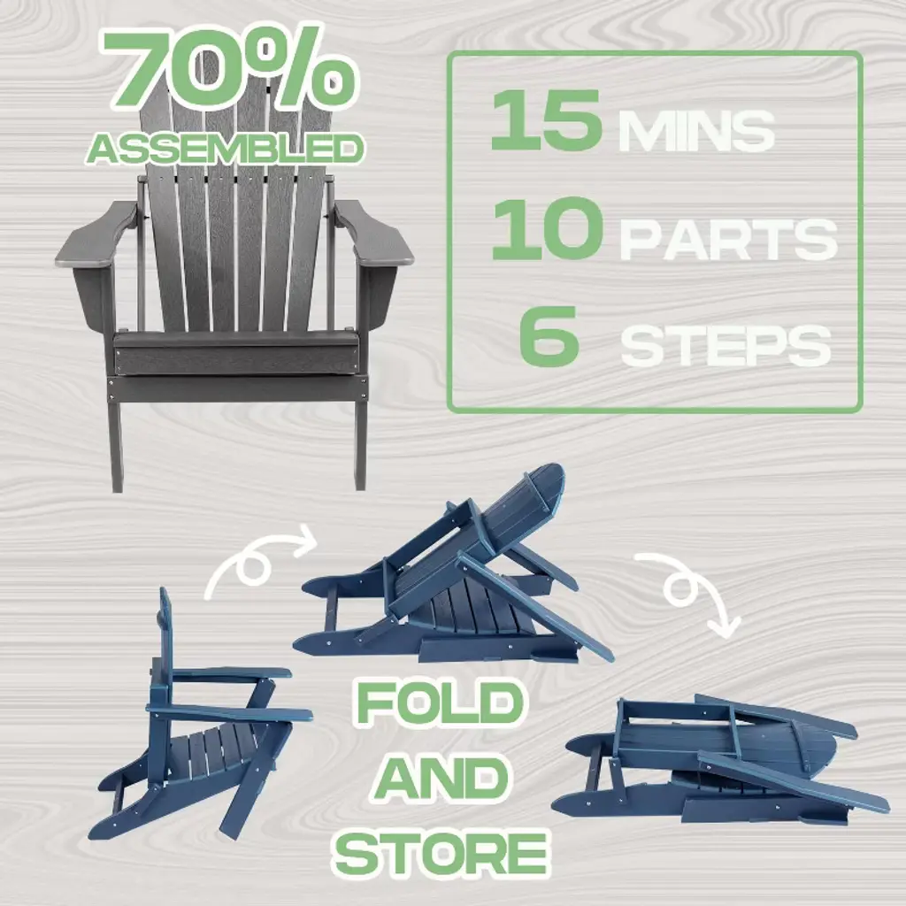 **Heavy-Duty Folding Adirondack Chair with Wood Grain Finish****Product Specifications:**- **Material:** High-Density Polyethylene (HDPE) with Wood Grain Design- **Dimensions:** 32.3"D x 31.5"W x 36"H- **Weight:** 36 lbs- **Weight Capacity:** Oversized (Suitable for Most Body Types)- **Special Features:** Folding, Stackable, Weather-Resistant, Stainless Steel Hardware- **Color:** Navy Blue---**Key Features:**1. **Premium HDPE Wood-Grain Construction** Crafted from high-density polyethylene (HDPE) with an elegant wood grain texture, this chair combines the natural look of wood with modern durability. The smooth, splinter-free surface ensures long-lasting use and comfort.2. **Ergonomic Support and Spacious Seating** Designed with a curved Windsor-style back and deep seat to provide superior lumbar support and full-body comfort. The generously proportioned seat accommodates users of all sizes while reducing spinal pressure during extended relaxation.3. **Quick-Fold Space-Saving Design** Easily folds flat for compact storage and effortless transport. These chairs stack neatly when not in use, making them ideal for patios, decks, poolsides, and small outdoor areas where space optimization is key.4. **All-Weather Durability** Built to withstand sun, rain, and humidity without fading, cracking, or warping. The waterproof HDPE material resists stains and mildew, and the chair can be cleaned easily with soap and water¡ªno maintenance required.5. **Tool-Free Quick Assembly** Comes with only 10 parts and 304 stainless steel hardware for rust-resistant performance. Assemble in just 6 steps within 15 minutes, no specialized tools or experience needed.