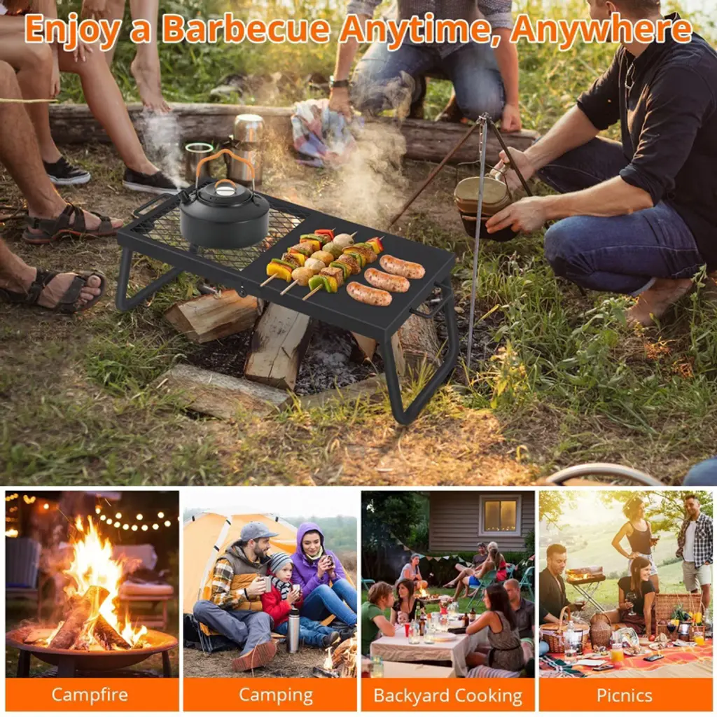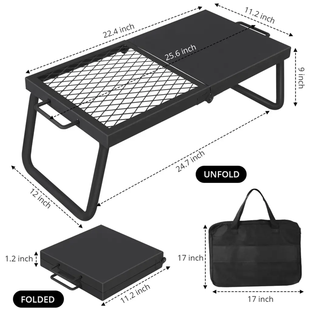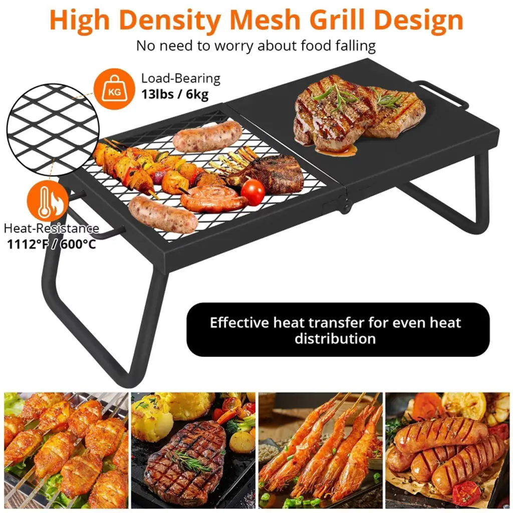 The foldable grill grate's diamond mesh pattern ensures optimal heat distribution for even cooking. Eliminate the problem of unevenly cooked meals and savor perfectly grilled steaks, fish, pizza, and vegetables, all while keeping food securely on the grate. Engineered with foldable capabilities and dual-side handles, this Outdoor Portable Campfire Grill prioritizes portability and easy storage. Set it up in mere seconds for any outdoor escapade or backyard barbecue.