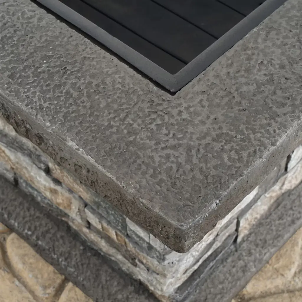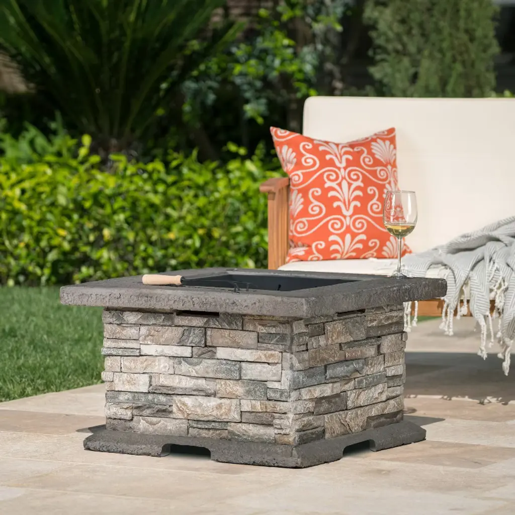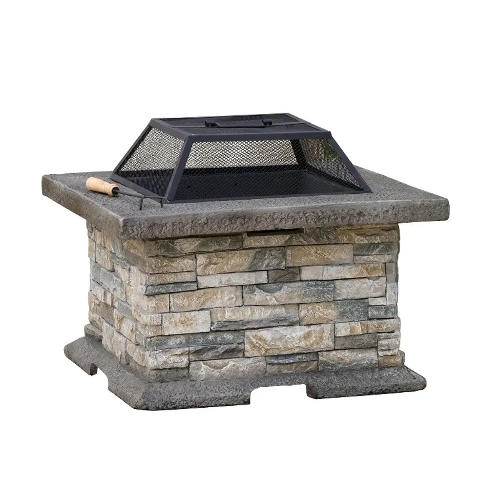Enjoy the outdoors with this fire pit. Constructed with fiber glass reinforced cement, this fire pit is elegantly designed with natural stone and a decorative frame finish. The iron shield offers ample protection to enjoy chats fireside with your guests and is removable for those beloved s'more nights. Adding this piece will bring warmth and elegance to your backyard or patio area, for those summer and winter nights. NOTE: Do not use charcoal, this fireplace is only meant for burning wood. Material: Lightweight Concrete Shield-Lid and Poker Material: Iron Color: Natural Stone Wood Burning Assembly Required Dimensions: 29.00 inches deep x 29.00 inches wide x 17.10 inches high