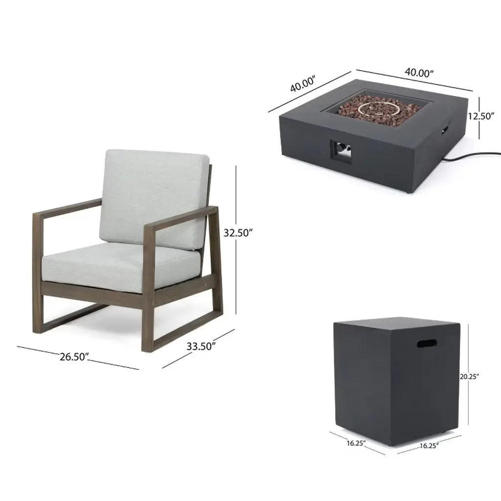 Illuminate your evenings with a stylish club chair and fire pit set, perfect for gathering with friends beneath a starlit sky. Crafted with smooth acacia wood and plush, water-resistant cushions, this set offers both comfort and durability. At the heart of it all, a cozy fire pit creates the perfect ambiance for warm conversations and unforgettable moments. Whether you're enjoying a relaxing night with family or entertaining guests, this fire pit set is designed to enhance your outdoor experience. Chair Material: Acacia Wood Fire Pit Material: Lightweight Concrete Tank Holder Material: Lightweight Concrete Cushion Material: Water Resistant Fabric Cushion Composition: 100% Polyester Multiple Finish Options Multiple Cushion Color Options Multiple Fire Pit and Tank Holder Finish Options Asembly Required Dimensions: 33.50 deep x 26.50 inches wide x 32.50 inches high Seat Dimensions: 24.75 inches deep x 22.75 inches wide x 16.75 inches high Arm Height: 24.00 inches Fire Pit Dimensions: 40.00 inches deep x 40.00 inchew wide x 12.50 inches high Tank Holder Dimensions: 16.25 inches deep x 16.25 inches wide x 20.25 inches high