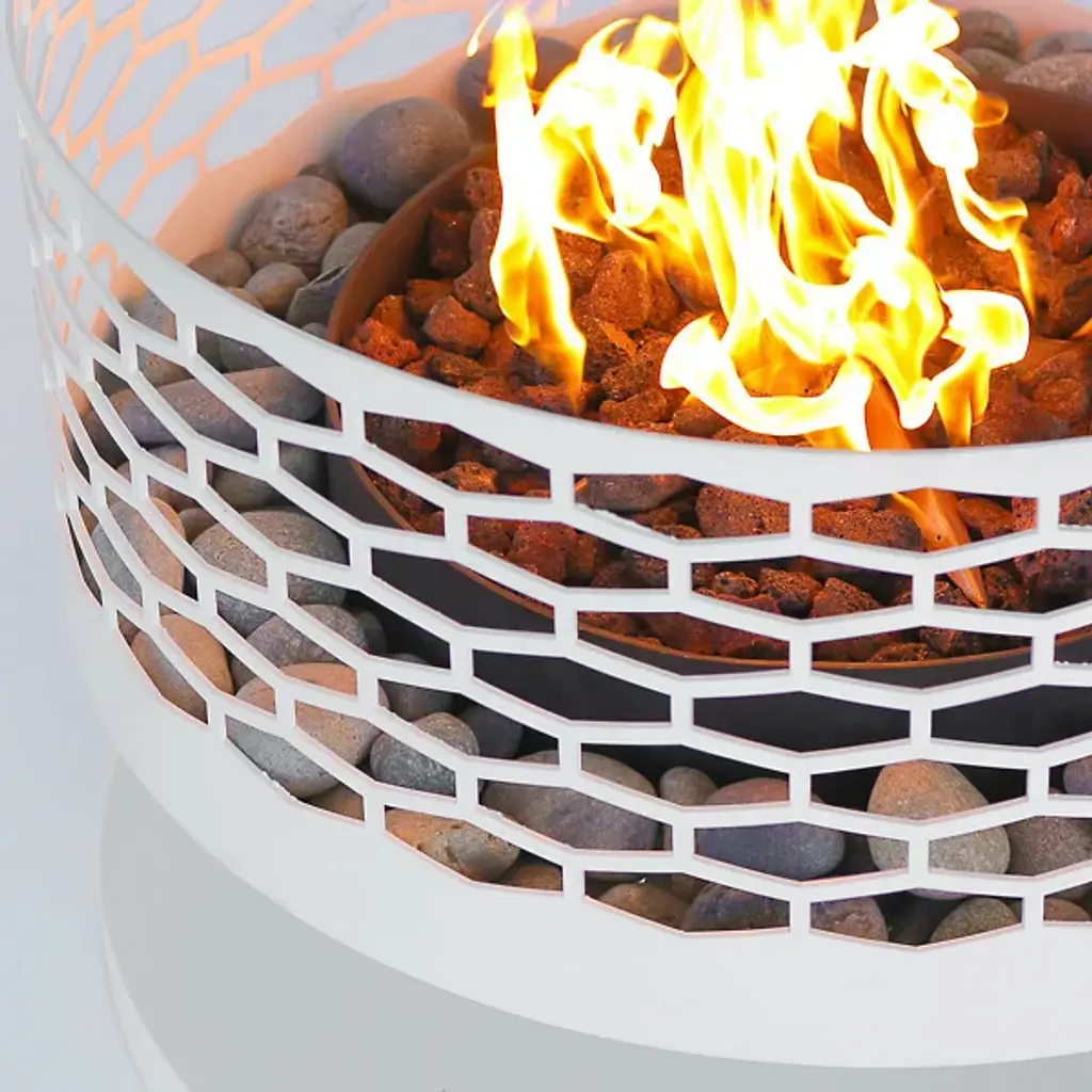 The Hex Solfire Outdoor Fire Pit from Modfire lives up to its name. A gorgeous frame of stainless steel is artfully handcrafted and carved to reveal hexagonal patterning throughout its surface. This profile creates a mesmerizing aura as the fire dances from within the drum-shaped frame. This outdoor fireplace works in tandem with separately sold fiberglass or smooth river rocks. Fueled by propane, Hex’s burn time lasts up to 8 hours.
