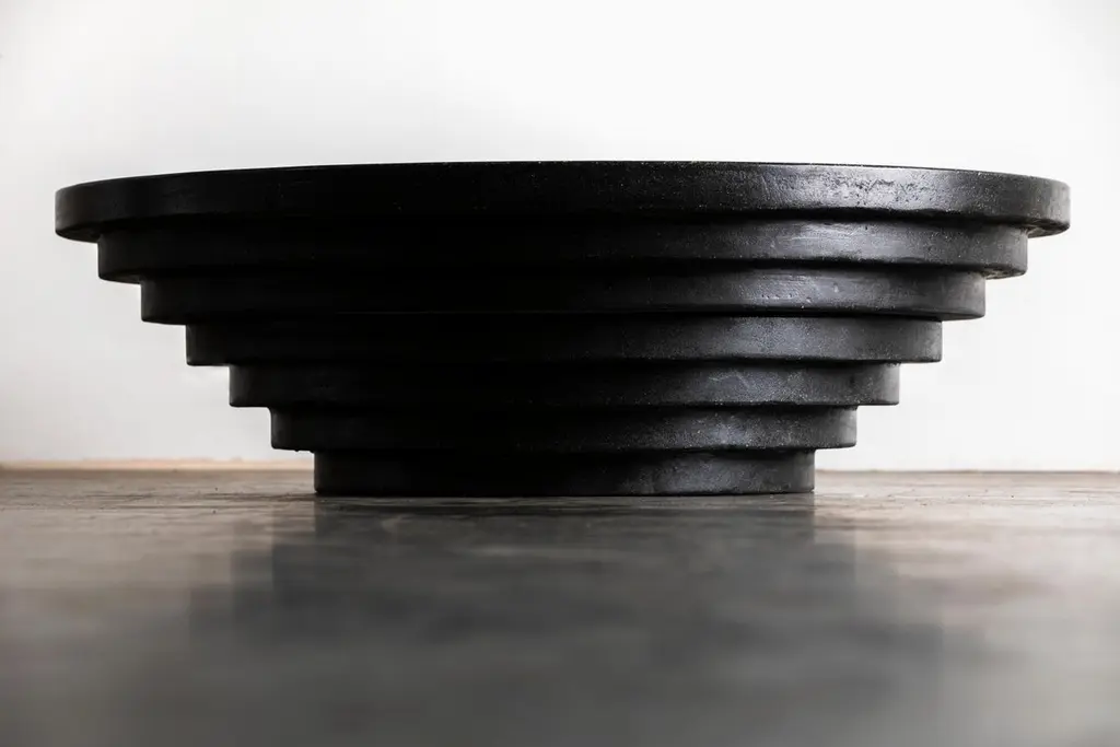 James de Wulf's Stepped Concrete Fire Table is the third design in a series of three different styles. Influenced by the geometry of Scarpa, the Stepped Fire Table sits in graduated circles from a top diameter of 48". Table is polished and sealed for a soft lustre. An ethanol burning kit sits in lava rock, topped with high grade black glass rock. Equal in art and function, the Stepped fire table is an elegant display of symmetry of form and grounded balance.Intended for outdoor use.