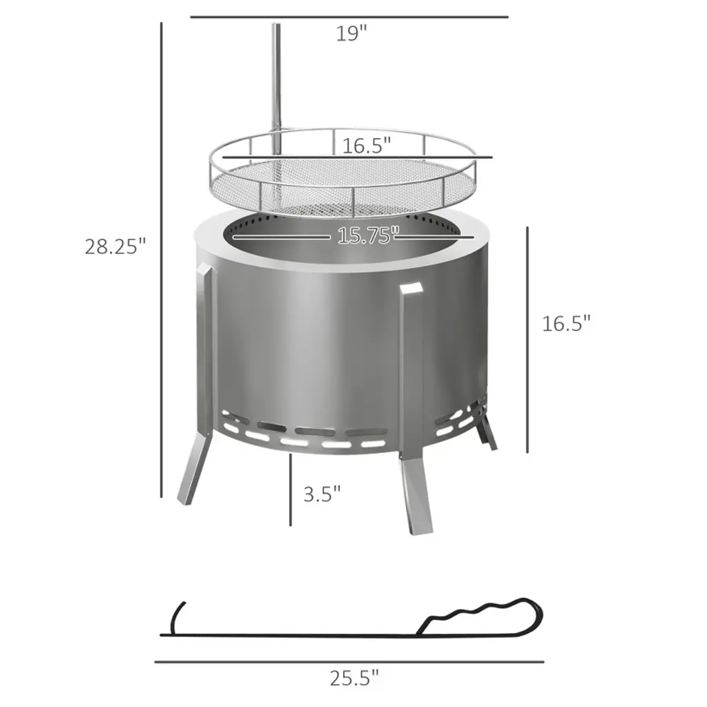 Enjoy the warmth, ambiance, and delicious food of an open fire without the irritation of smoke in your eyes with this 2-in-1 Smokeless Fire Pit and BBQ Grill. Designed with a secondary combustion system, fresh oxygen is fed through bottom vents, heating as it rises to burn away smoke, producing a clean, smokeless flame. Crafted from durable stainless steel, this fire pit withstands rain and outdoor elements season after season. The 19" diameter fire pit includes a spacious 15.75" inner wood-burning area and comes with a 25.5" poker to safely adjust logs and maintain an optimal fire. Perfect for backyard patios, camping, picnics, or any outdoor gathering, it delivers cozy warmth and great grilling all in one portable unit.