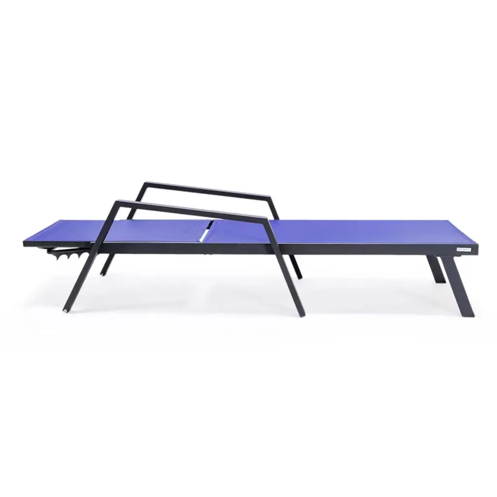 Leisuremod Marlin Modern Patio Chaise Lounge Chair In Black Aluminum Frame With Arms And Square Fire Pit Side Table In Navy Blue