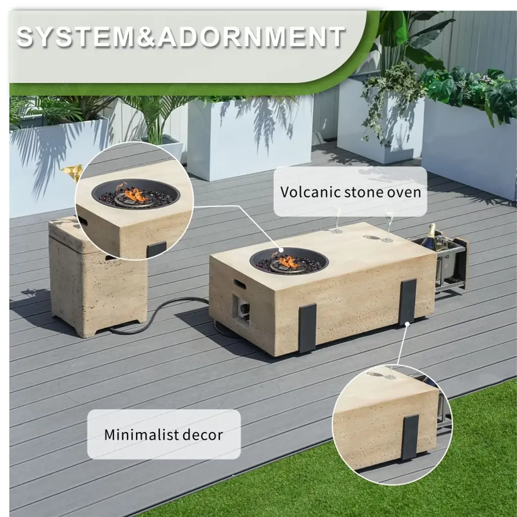 Bring contemporary function and ambiance to your outdoor space with the Moda Furnishings Magnesium Oxide Fire Pit Table. Expertly crafted from durable, weather-resistant magnesium oxide with a realistic stone-textured finish, this sleek rectangular fire pit offers more than just warmth—it features a pull-out stainless steel ice bucket for added convenience during outdoor gatherings. The smooth concrete-style surface provides a modern aesthetic, while the 50,000 BTU stainless steel burner ensures steady heat and easy ignition. A removable lid lets you convert it into a full coffee table when not in use, maximizing functionality on your patio, deck, or garden.