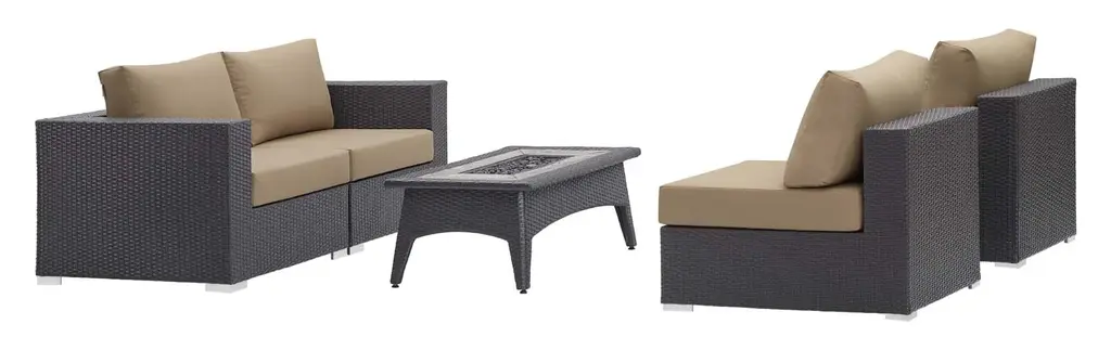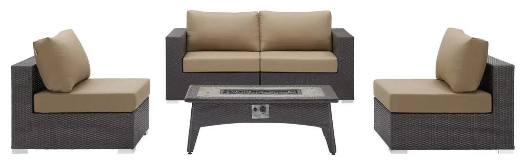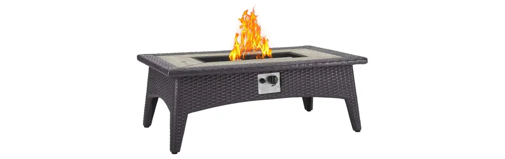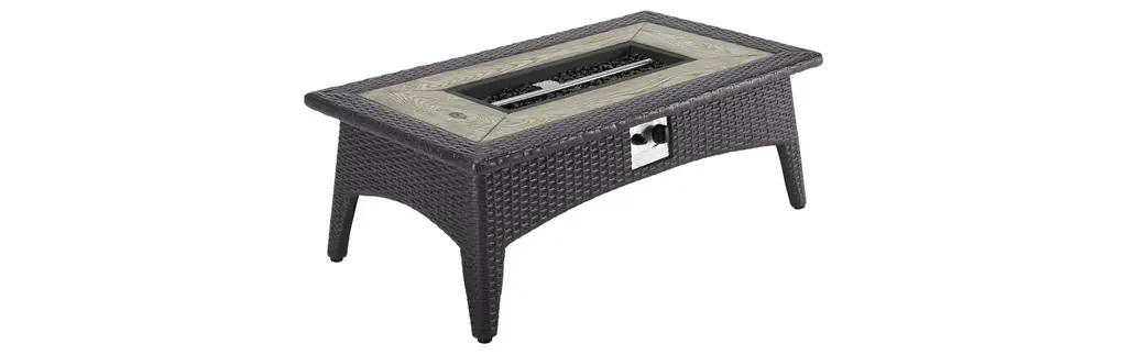 Enjoy the flickering flames of a warm fire or soak up the sunshine with family and friends with the Convene Outdoor Patio Furniture Set and Fire Table. A contemporary update to your outdoor living area, this patio set comes complete with durable aluminum frames wrapped in synthetic wicker rattan and densely padded foam cushions covered in water and UV-resistant covers that offer a serene lounging experience. The propane gas fire pit table features a magnesium oxide molding that mimics the look of rattan and wood with tempered glass beads to fill the center of the rectangular pit. Sturdy and safe, this fire table has a 40,000 BTU burner that creates a smoke-free flame, is CSA certified, easy to control, user-friendly with the turn of a knob and touch of an ignition button, and burns up to 8 hours on high or up to 16 hours on low. Designed for the backyard, patio, or poolside, this outdoor set is perfect for entertainment or relaxation and brings style and modern aesthetics to your outdoor space.Outdoor Patio Seating Collection with Fire TableWater and UV Resistant PE Rattan WeaveMachine Washable All-Weather Cushions100% Smoke Free Flame / CSA CertifiedBurns Up To 8 Hrs On High, 16 Hrs On LowConnects With External Propane Tank (Not Included)Includes:, Protective Cover, LP HoseOverall Armless Dimensions: 35"L x 28.5"W x 25.5 - 33"HCushion Thichkness: 5"HSeat Dimensions: 28.5"L x 28.5"W x 17"HBackrest Dimensions: 6"L x 28.5"W x 13.5"HBase Dimensions: 28.5"L x 28.5"WSeat Cushion Dimensions: 28.5"L x 28.5"W x 5"HBack Cushion Dimensions: 28.5"L x 15.5"W x 4.5 - 6"HOverall Corner Dimensions: 35"L x 35"W x 25.5 - 33"HSeat Dimensions: 22.5"L x 17.5"HArmrest Height: 8"HBackrest Dimensions: 35"L x 6"W x 15.5"HBase Dimensions: 35"L x 35"WFloor to Top of Armrest: 25.5"HCushion Thickness: 5"HSeat Cushion Dimensions: 28.5"L x 28.5"W x 5"HBack Cushion Dimensions: 28.5"L x 15.5"W x 4.5 - 6"HBack Cushion Dimensions: 21"L x 15.5"W x 4.5 - 6"HOverall Fire Pit Dimensions: 24"L x 43.5"W x 16.5"HOverall Product Dimensions: 70"L x 140"W x 25.5 - 33"HWeight (LBS): 248