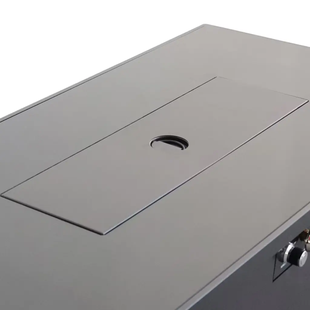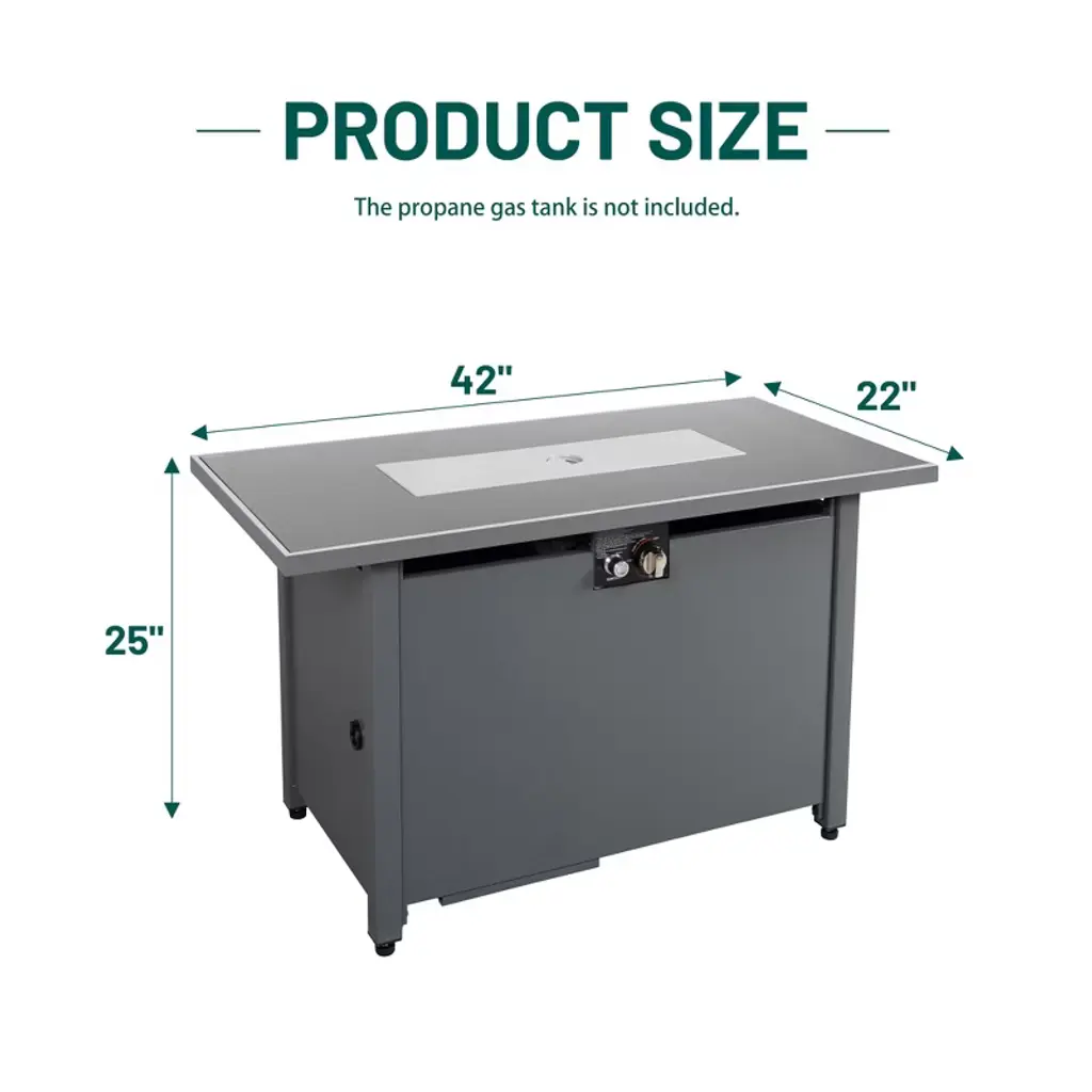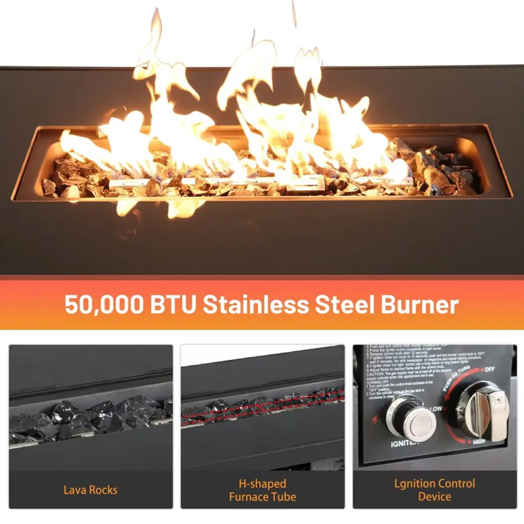 Cozy up your outdoor space with this modern fire pit table, perfect for year-round gatherings. Featuring a rust- and weather-resistant steel base and a sleek stainless steel top, it combines durability with contemporary style. Integrated push-button ignition and included lava rocks make starting and enjoying the fire effortless, while a side-access door conceals the propane tank for a clean, streamlined look. Safe for use on wood decks, this versatile fire pit provides warmth and ambiance with ease. Propane-ready and convertible to natural gas (kit sold separately), it’s a stylish, functional centerpiece for any patio or backyard.