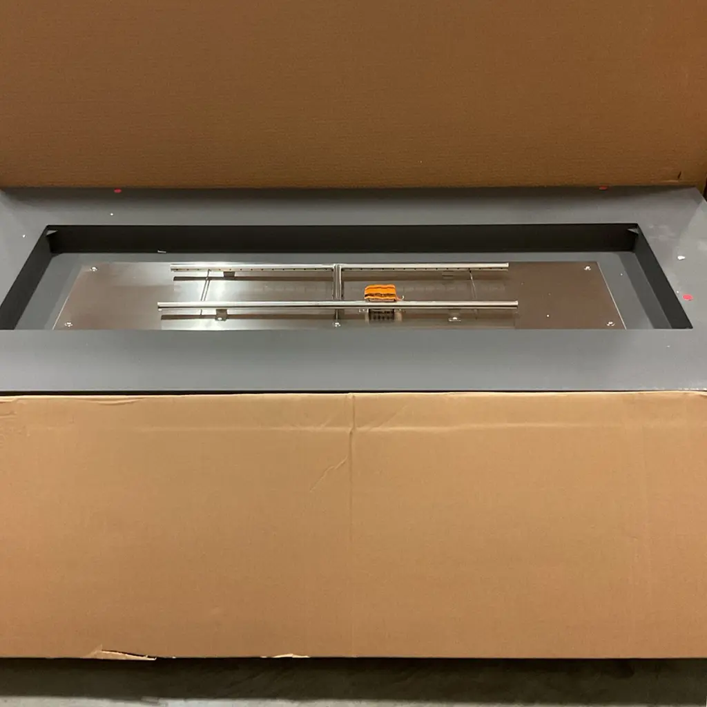 A stylish centerpiece for outdoor lounging. Rectangular shape gives it a contemporary look. Yields a clean flame with the push of a button. Enjoy the cozy, warm embrace of sitting by the fire year-round.