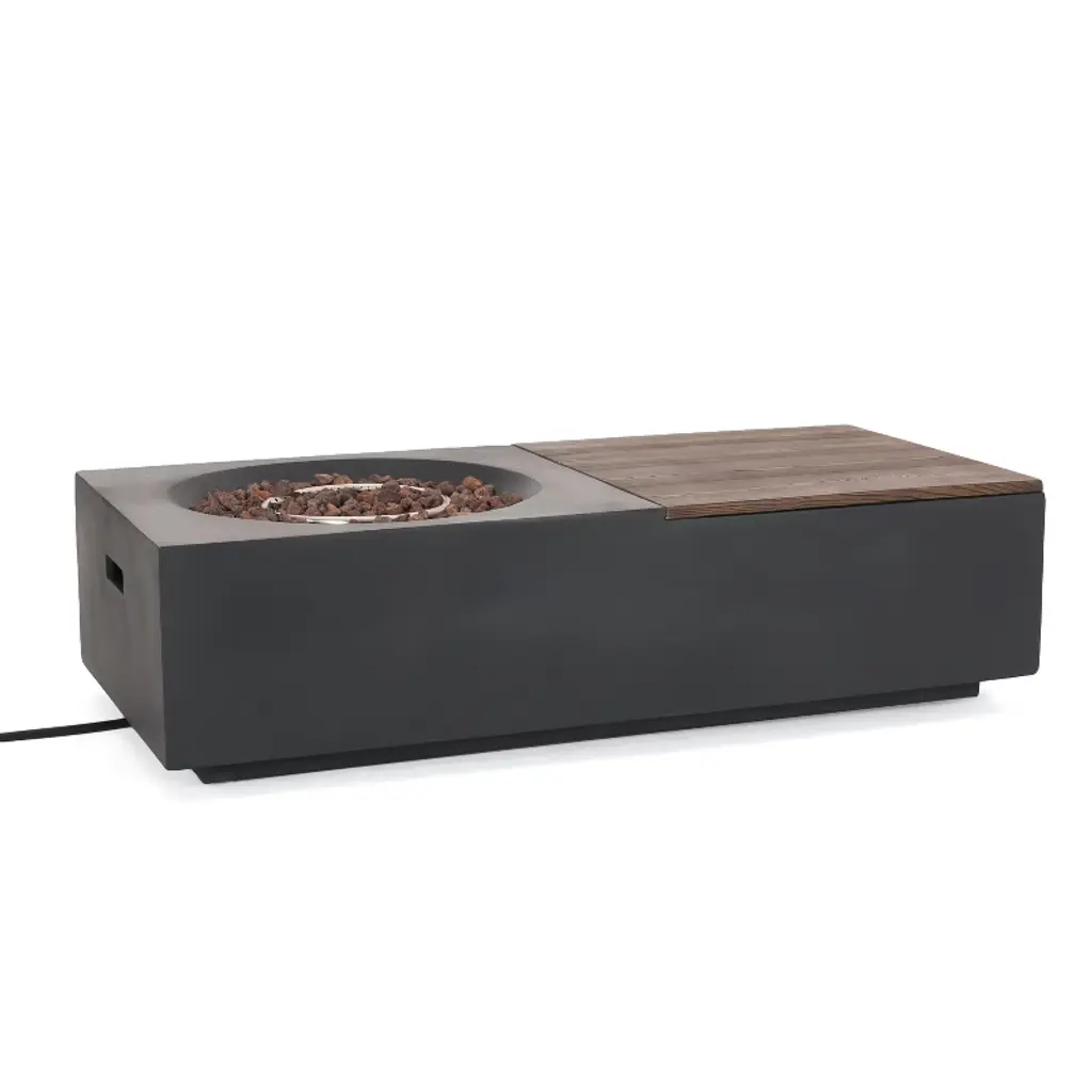 LIGHTWEIGHT CONCRETE: This fire pit is constructed with durable lightweight concrete which can hold a substantial amount of weight. The removable tabletop is finished with a natural wood look.50,000 BTU: Featuring a BTU of 50,000, our fire pit provides plenty of light and warmth. Please note that this fire pit is propane gas only.MULTI-FUNCTIONAL: This accessory includes a removable tabletop on one side, making this both a coffee table and a fire pit. The hidden storage space comes with a drainage hole.WEATHER RESISTANT: This fire pit table is designed and tested to resist mild weather conditions. We always advise covering, storing, or providing other protection to our furniture in the event of heavy or repeated exposure to the elements, including water and UV rays.