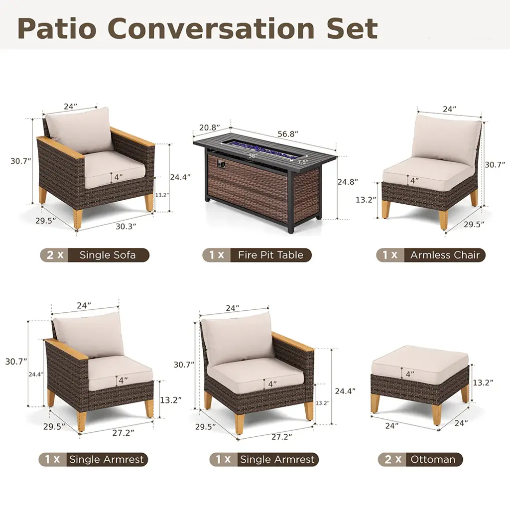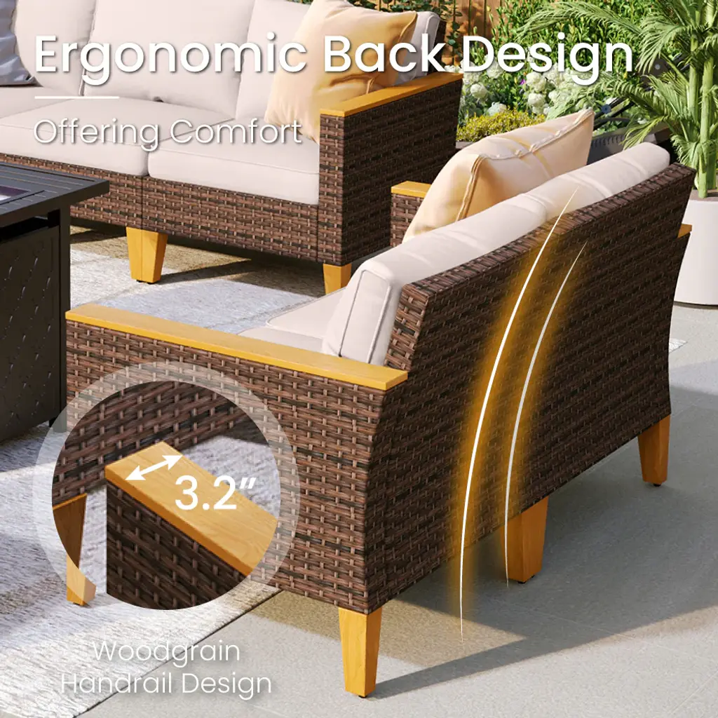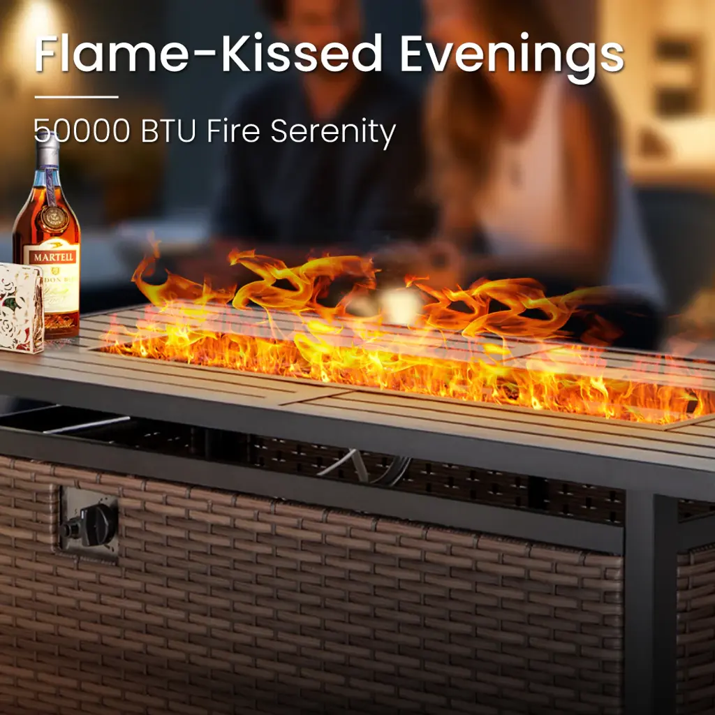 Maximize your corner space with the curved half-moon sofa corner cubes. Create the perfect seating arrangement for gatherings, relaxation, or soaking up the sun. The upgraded seats feature highly deform-resistant sponges in the cushions. Premium fabric from CUSHION PROTM is water-repellent and stain-resistant. The 50,000 BTU fire burner offers a smoke-free, ash-free real fire, perfect for a romantic atmosphere outdoors. PE Rattan adds a natural touch without compromising durability. Ideal for enhancing your outdoor living experience.