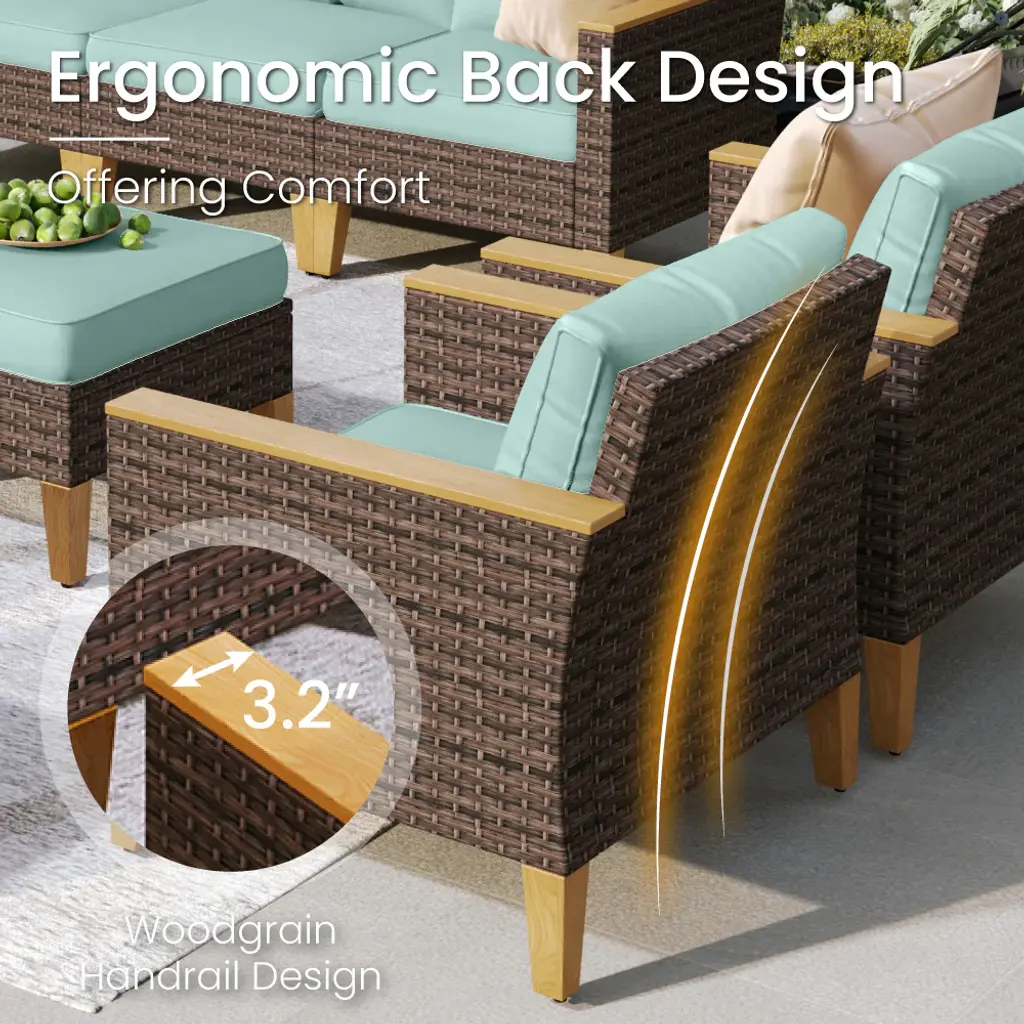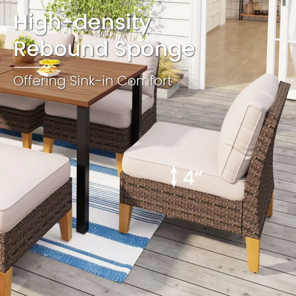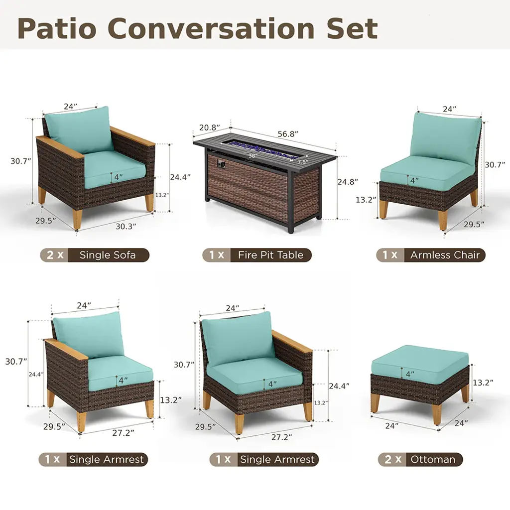 Maximize your corner space with the curved half-moon sofa corner cubes. Create the perfect seating arrangement for gatherings, relaxation, or soaking up the sun. The upgraded seats feature highly deform-resistant sponges in the cushions. Premium fabric from CUSHION PROTM is water-repellent and stain-resistant. The 50,000 BTU fire burner offers a smoke-free, ash-free real fire, perfect for a romantic atmosphere outdoors. PE Rattan adds a natural touch without compromising durability. Ideal for enhancing your outdoor living experience.