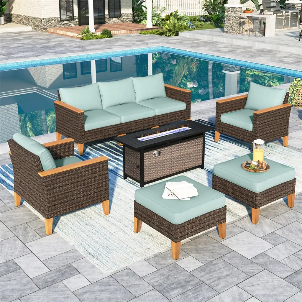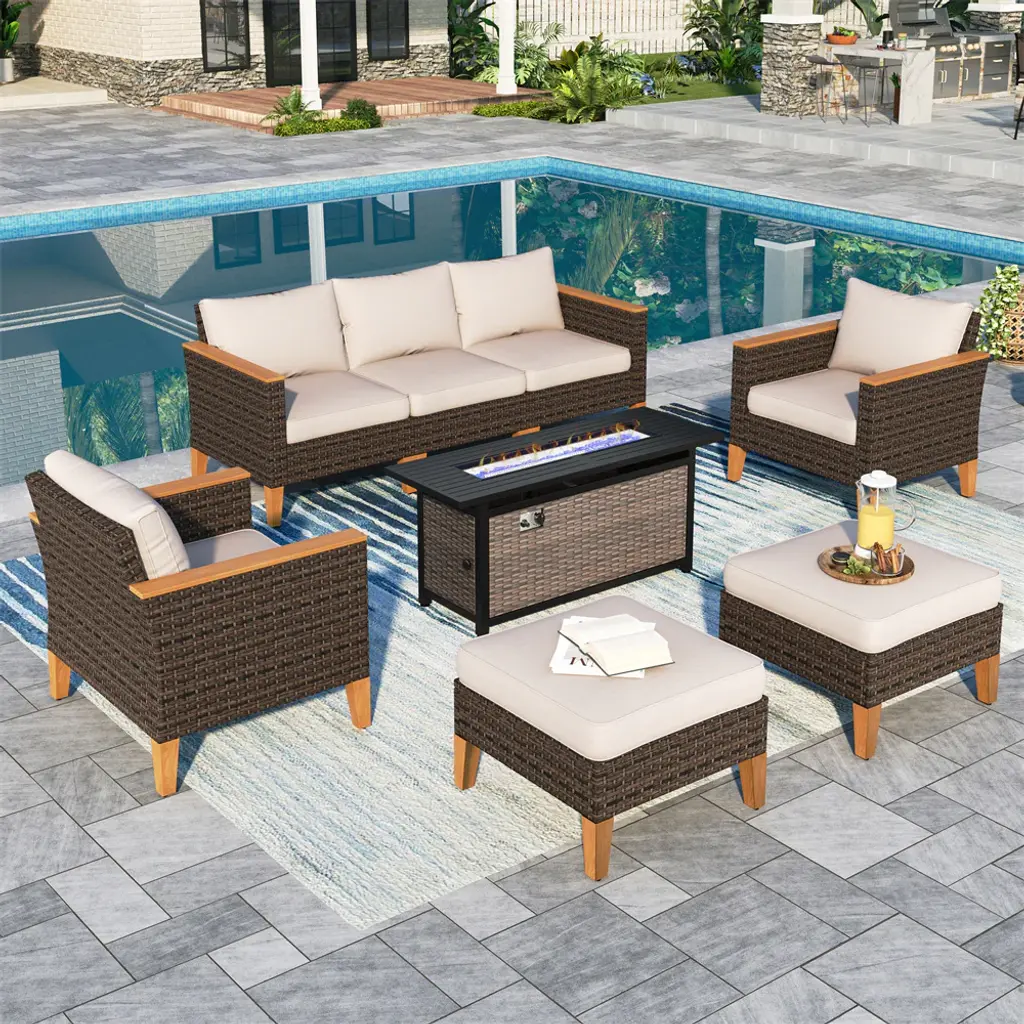 Phi Villa 7-Seat Luxurious Half-Moon Rattan Sofa With 56" Rattan Fire Pit Table