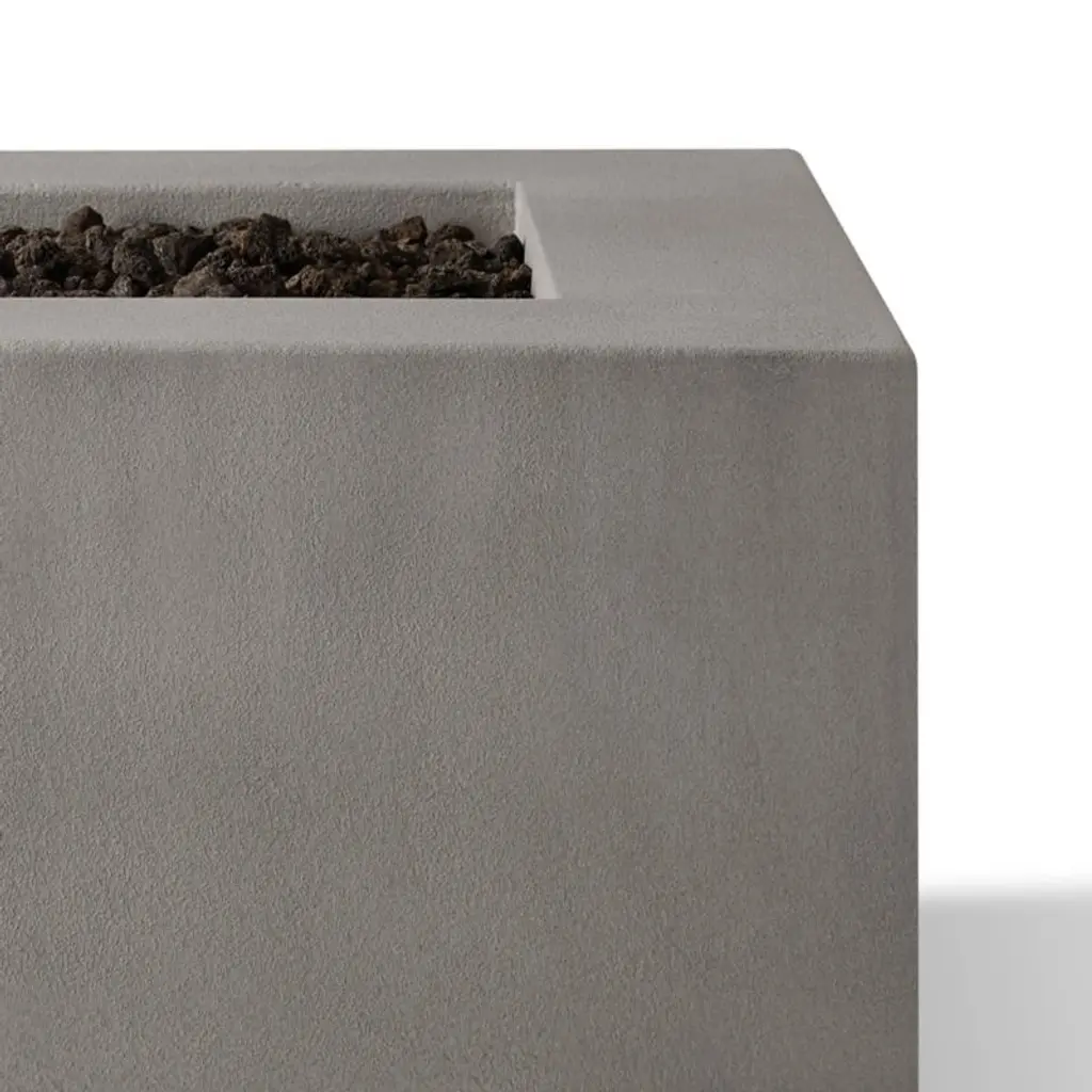 On cool days and chilly nights, this ultra-modern fire table draws you outdoors with the warmth, fascination and allure of dancing flames. Balancing industrial and organic beauty, clean-lined concrete shapes a low square filled with black lava rocks. The molded, glass-reinforced concrete gives the natural gas-fueled outdoor fireplace strength and durability. The firepit's brass burner system uses eight jets to create rich, inviting flames everyone will want to gather around.
