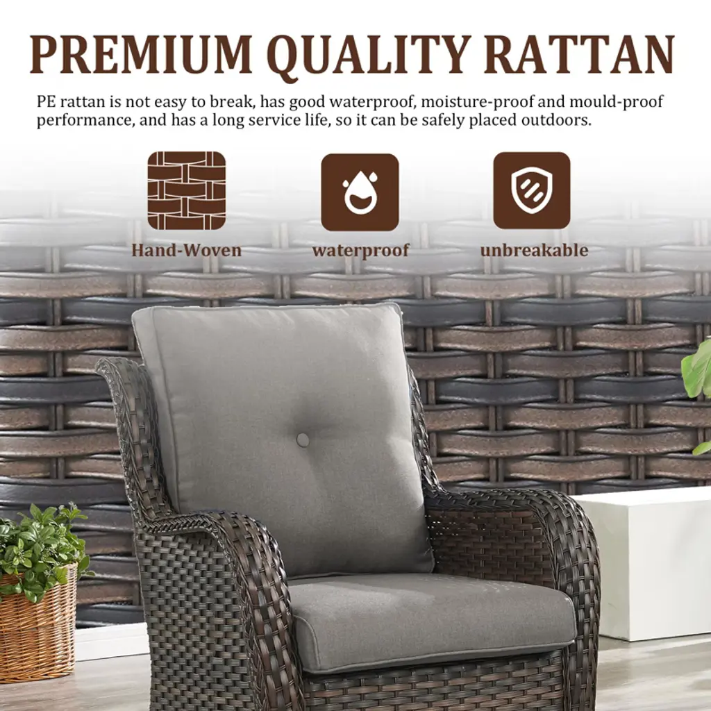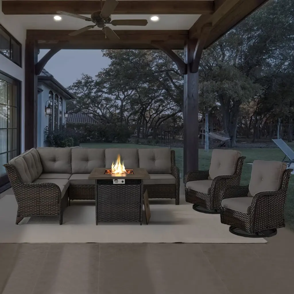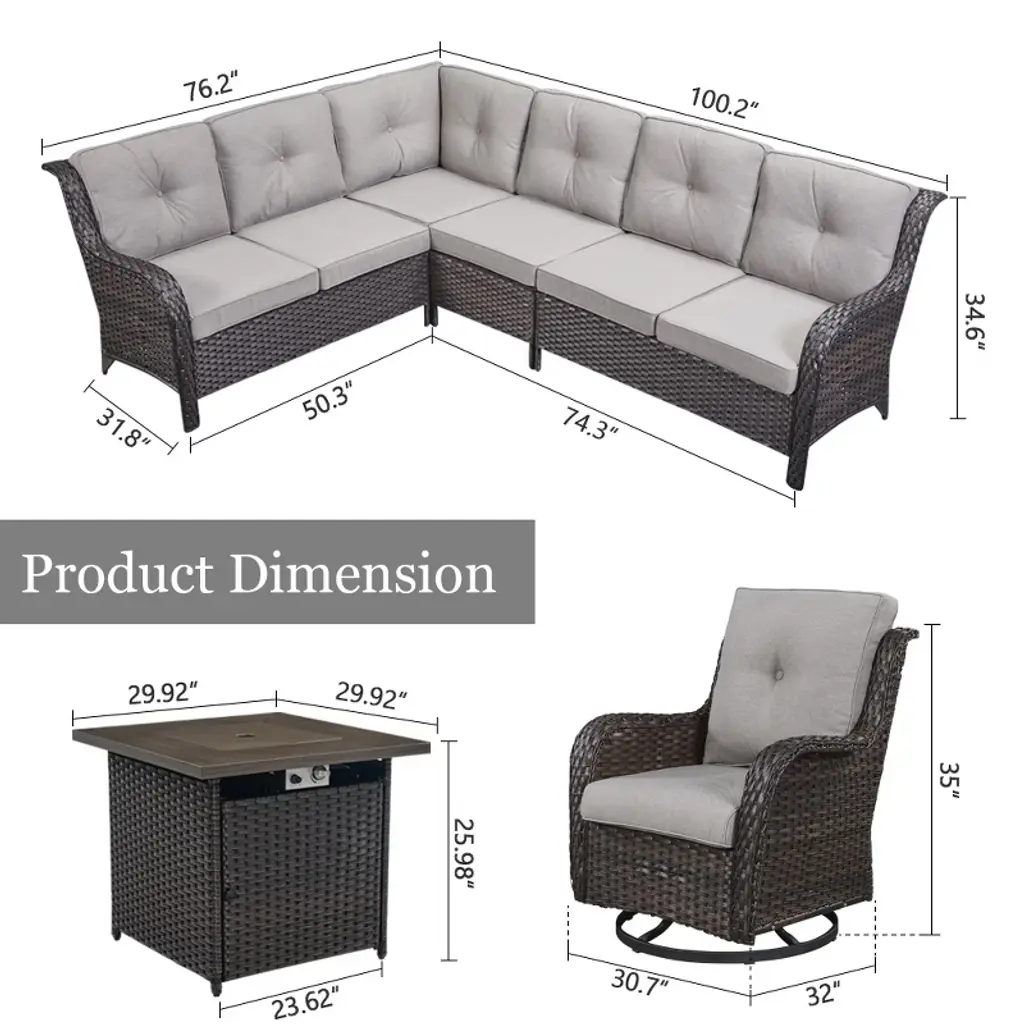 Introducing our stylish and functional POCASSY Outdoor Furniture Set with Fire Pit Table, perfect for enhancing your patio or garden. This set includes a spacious L-Shape sectional sofa, designed for comfort and relaxation, along with two wicker rattan swivel chairs that offer versatile seating and ease of movement. Completing the set is a propane chic fire pit table, ideal for cozy evenings and adding a touch of elegance to your outdoor space. This collection combines modern design with practicality, making it the perfect choice for enjoying your outdoor living area.