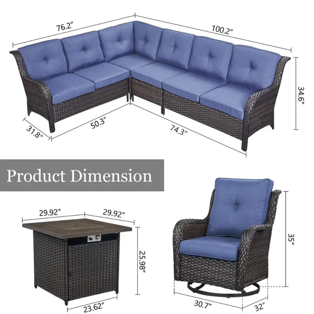 Introducing our stylish and functional POCASSY Outdoor Furniture Set with Fire Pit Table, perfect for enhancing your patio or garden. This set includes a spacious L-Shape sectional sofa, designed for comfort and relaxation, along with two wicker rattan swivel chairs that offer versatile seating and ease of movement. Completing the set is a propane chic fire pit table, ideal for cozy evenings and adding a touch of elegance to your outdoor space. This collection combines modern design with practicality, making it the perfect choice for enjoying your outdoor living area.