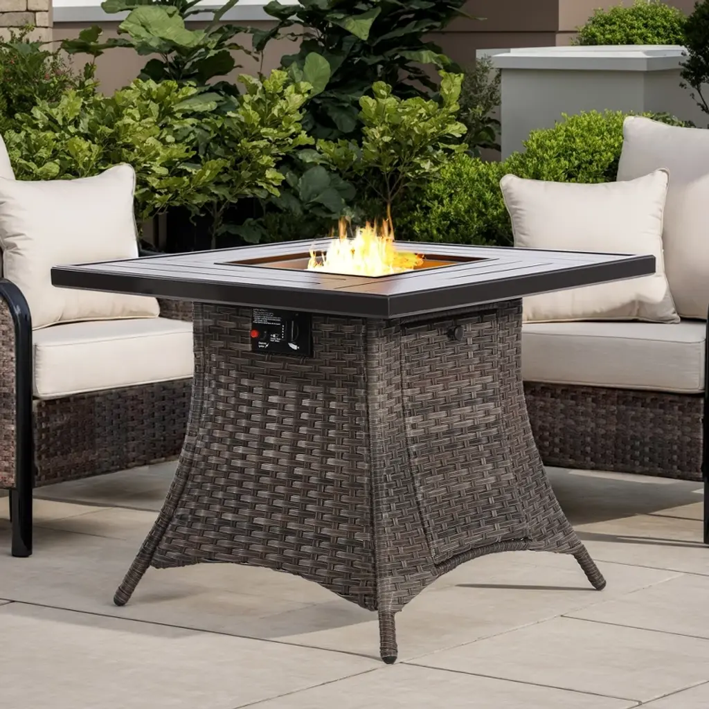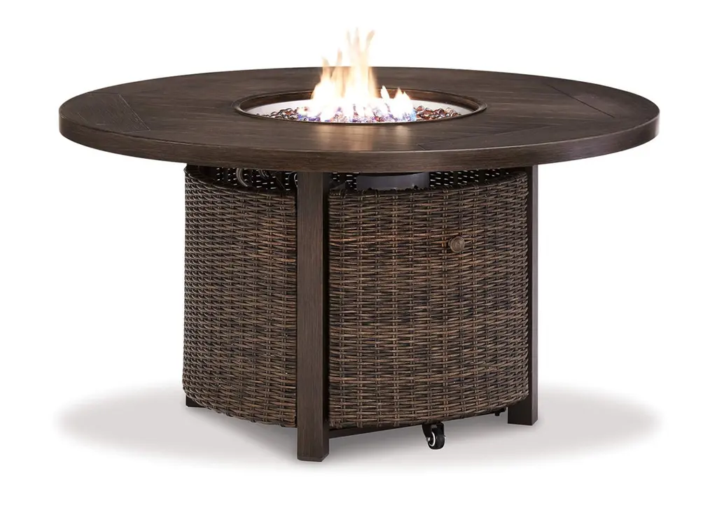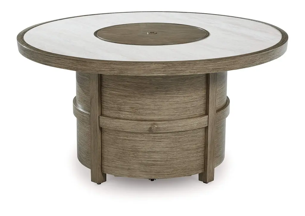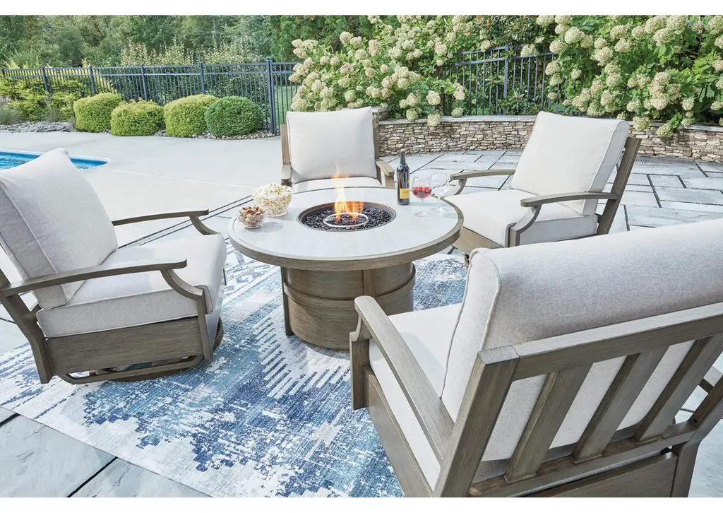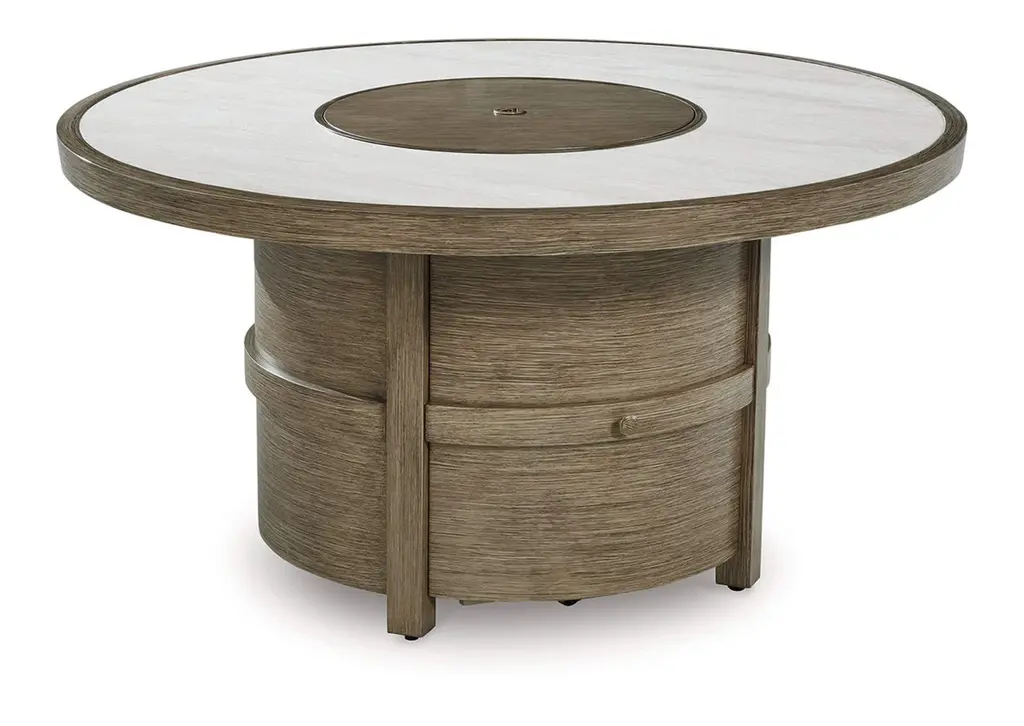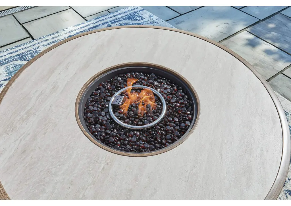 Experience the perfect combination of durability and style with the Rainier Ranch outdoor fire pit table. An aluminum frame with a wood-look finish maintains a sleek, contemporary aesthetic, while the sintered stone tabletop adds an element of natural elegance. A stainless steel burner with glass beads adds a captivating element sure to wow. This delightful addition to your outdoor dining creates an oasis where comfort and beauty thrive. Weight 133.000 lbs. (59.85kgs.)