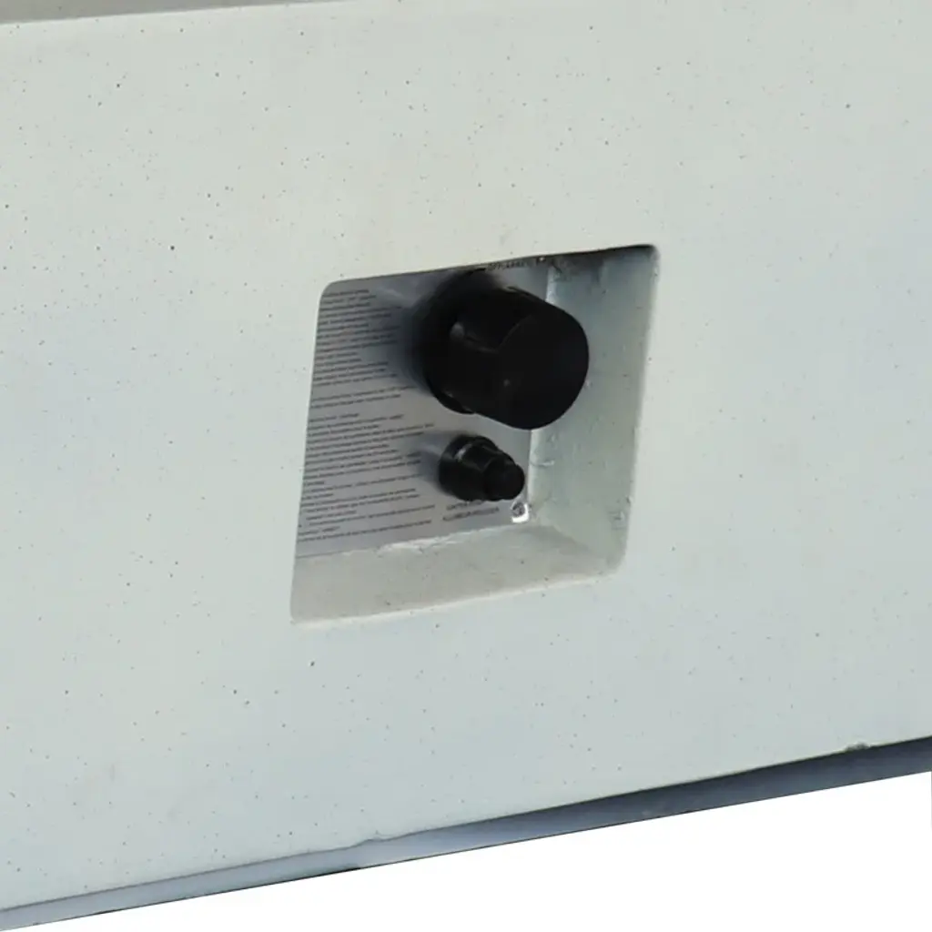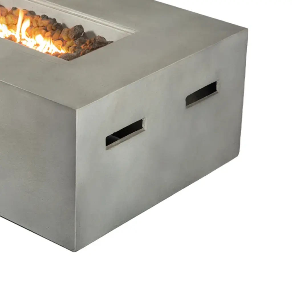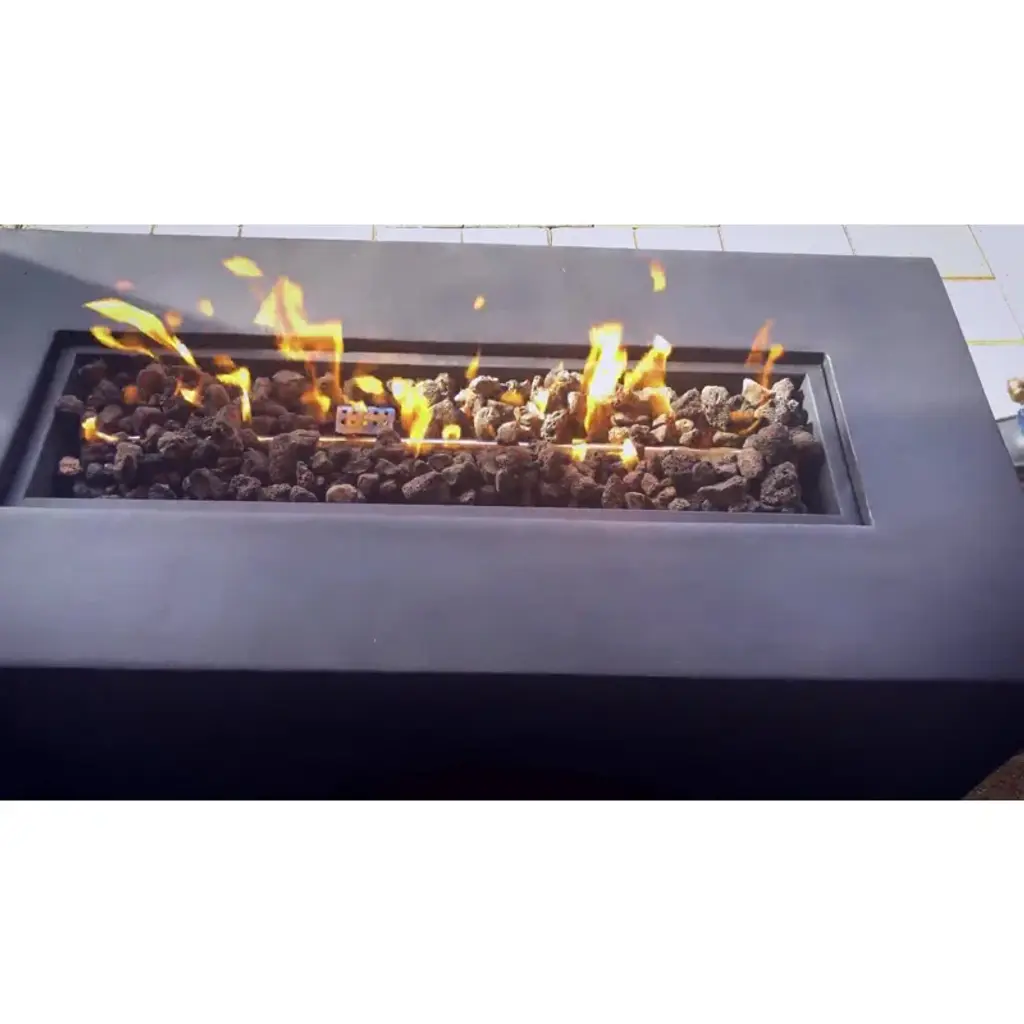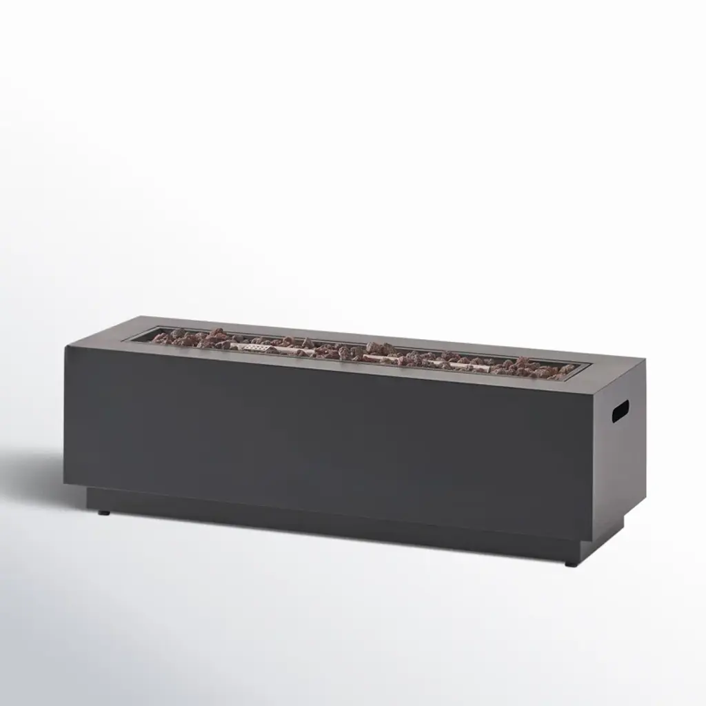 Pairing a long, low footprint with a clean-lined look, this outdoor fireplace warms your patio or deck while complementing a sleek modern look. Crafted from weather-resistant reinforced concrete, it features a low-profile silhouette with a block foot and crisp edges for a modern, minimalist silhouette. This fire pit ignites with a push-button trigger, and features included lava rock filler, so it's ready to be turned on once it arrives.