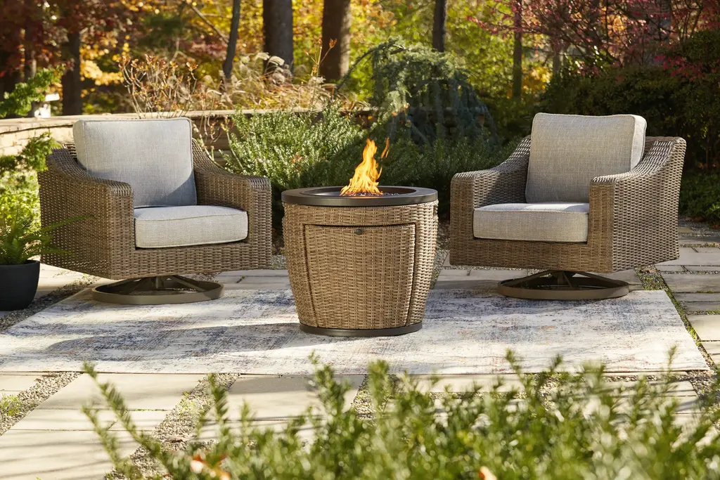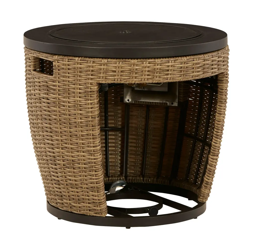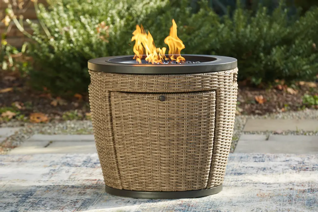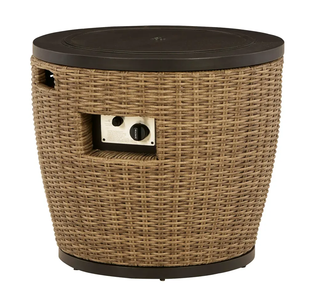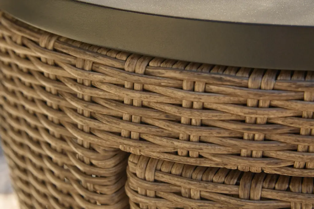 Warm up cool nights with this round fire pit table. Sporting an easy-on-the-eyes look inspired by driftwood, this fire pit table elevates the art of alfresco living. Its chic circular top is paired with all-weather resin wicker over rust-proof aluminum for beauty and brawn. A stainless steel burner with glass beads adds a captivating element sure to wow.Round gas fire pit table with CSA-approved 55,000 BTU burner, glass beads, burner cover and all-weather polyester coverAll-weather, rust-free aluminum framePowder coated brown finishHand-woven resin wicker in driftwood colorStainless steel hardwareBattery-operated ignition system with adjustable flame control; battery includedSide door conceals gas propane tank (not included)Convertible to natural gas