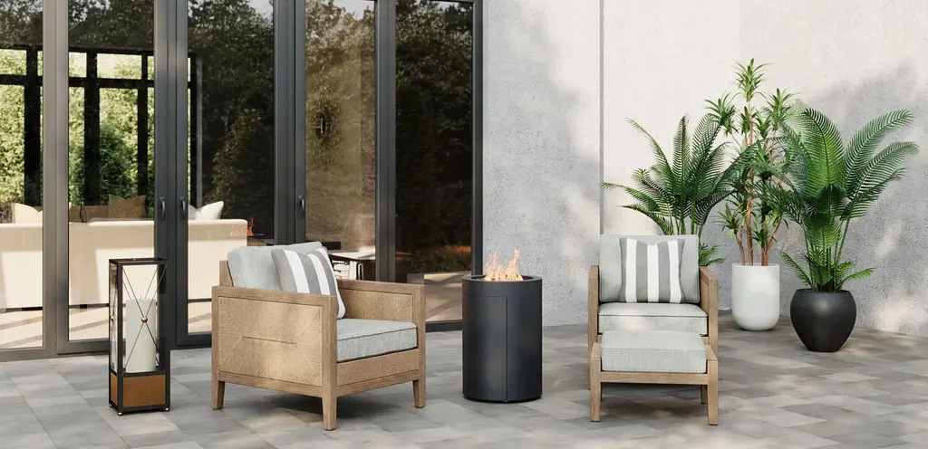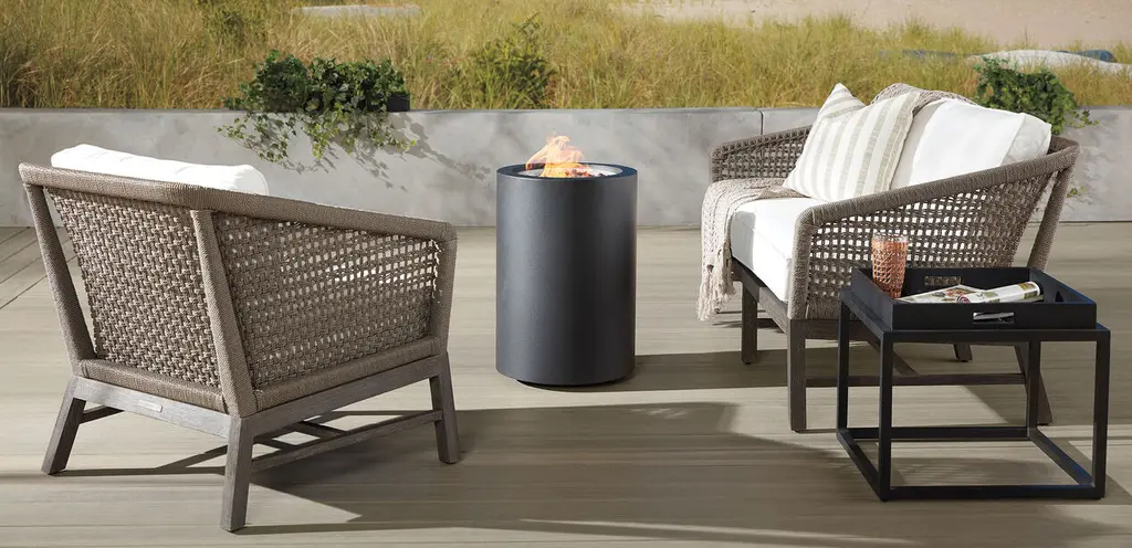 Add warmth and a bit of ambience to starry nights on the patio. Petite enough for even the smallest space, our round fire pit is crafted from powder-coated aluminum and operates using a standard propane tank.