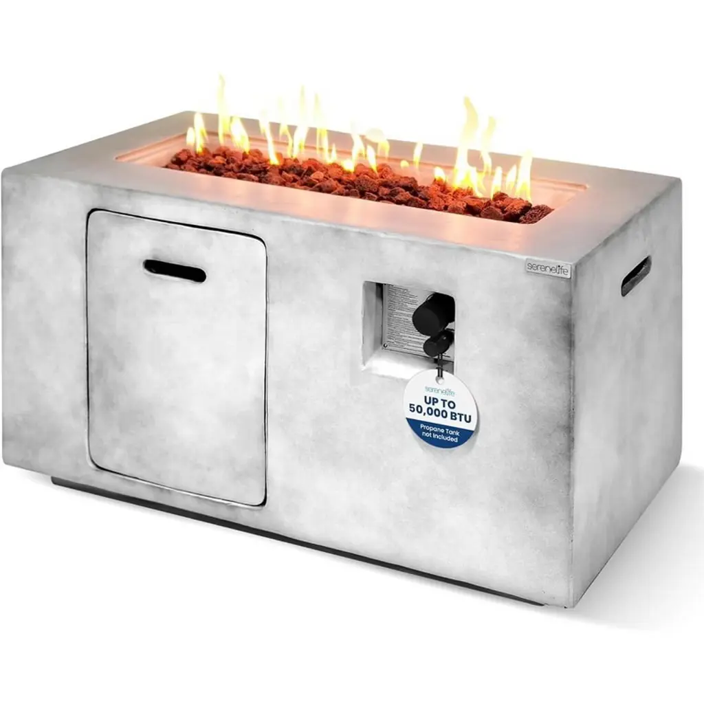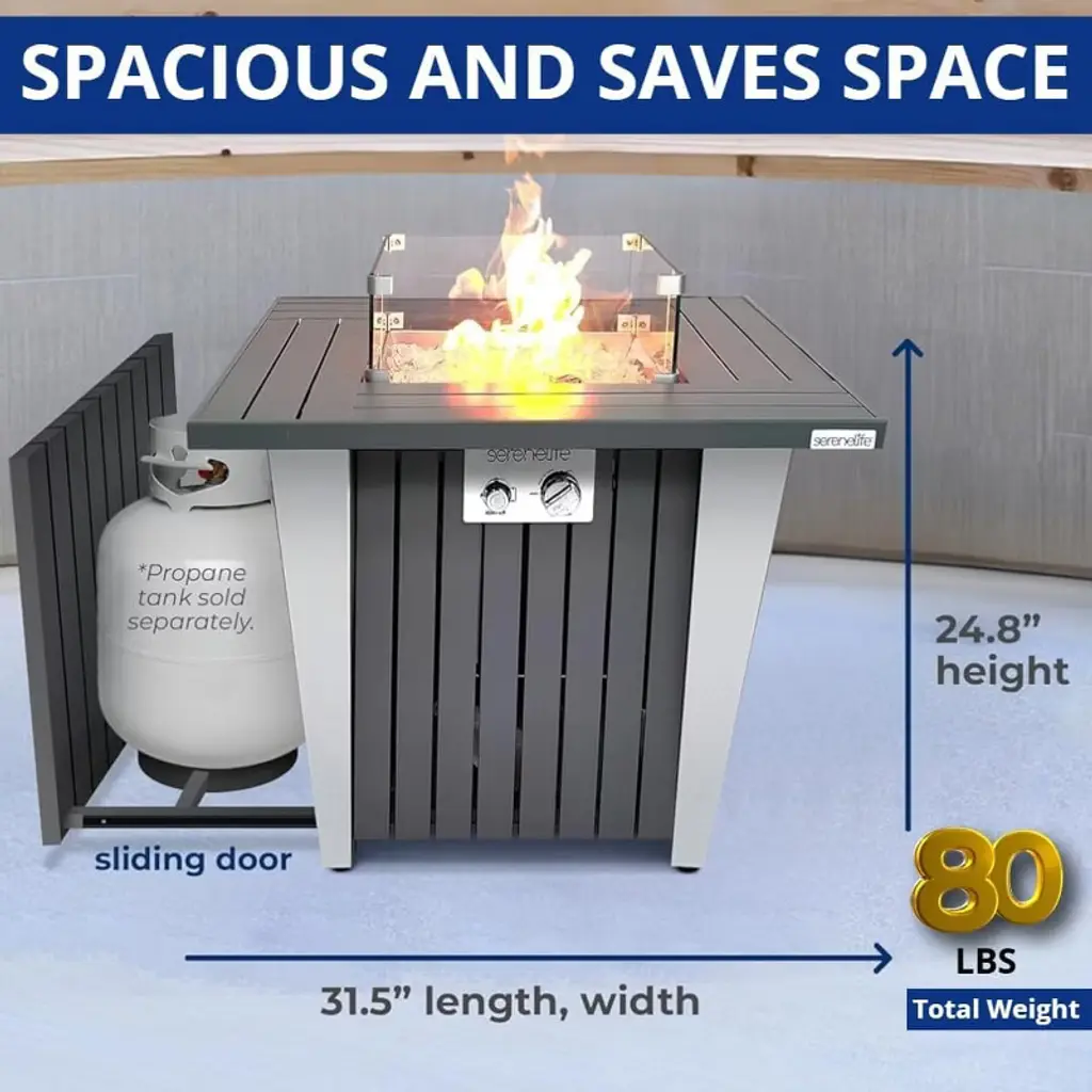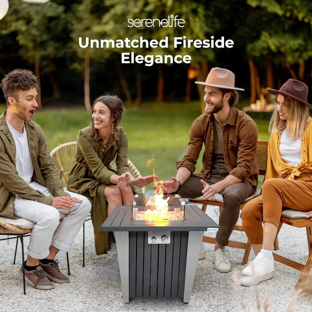 Serenelife Fire Pit Table - 50,000 Btu, Stainless Steel Burner, Tempered Glass Wind Guard, Sliding Door