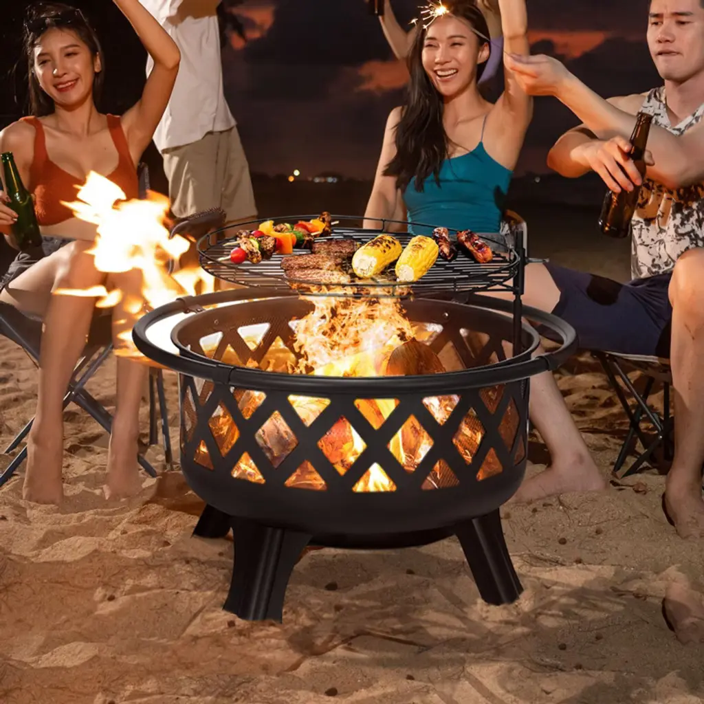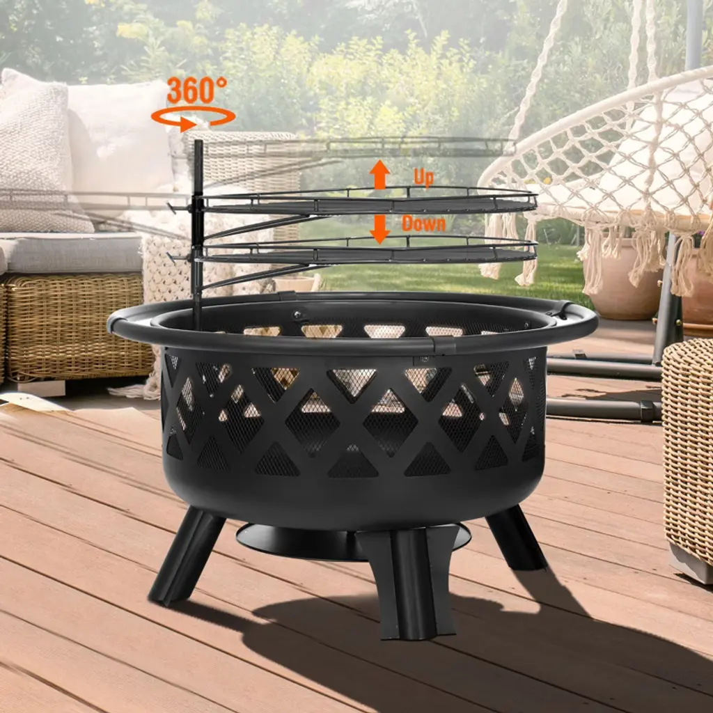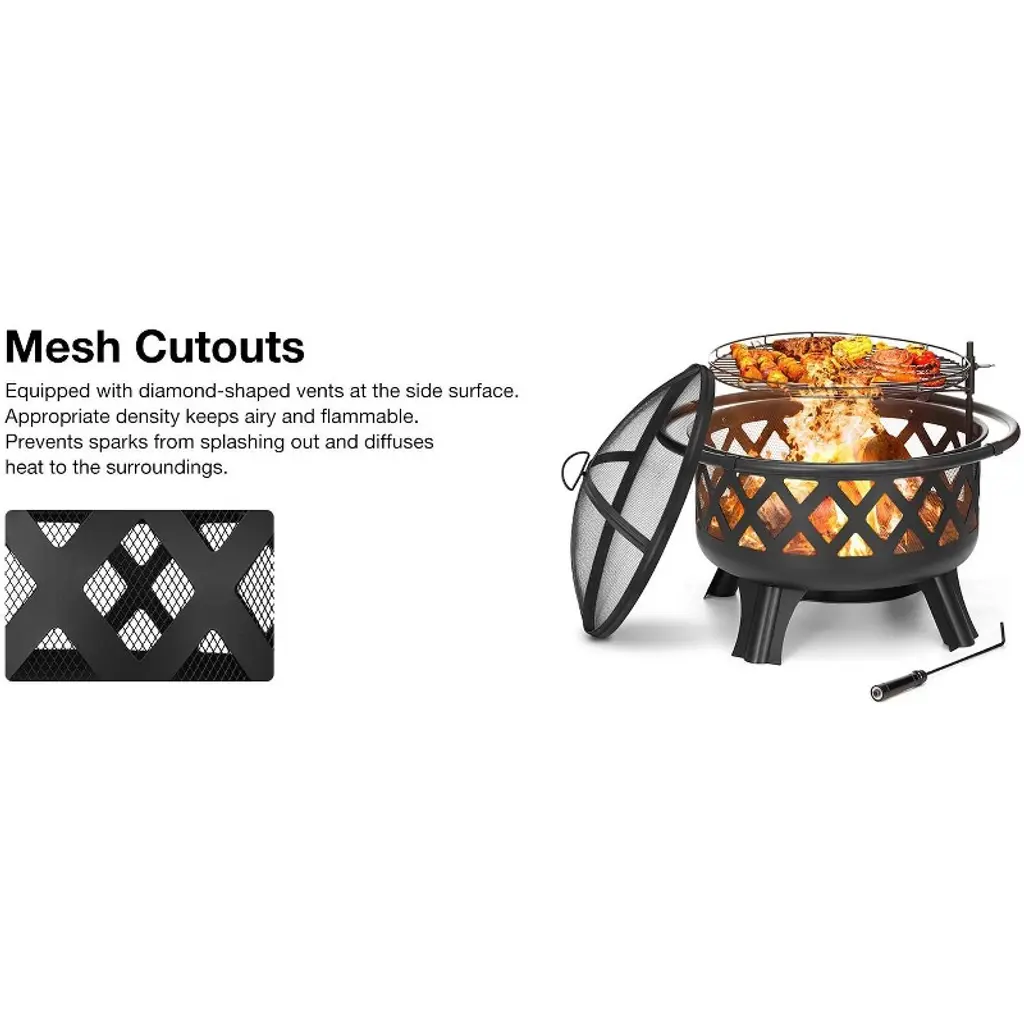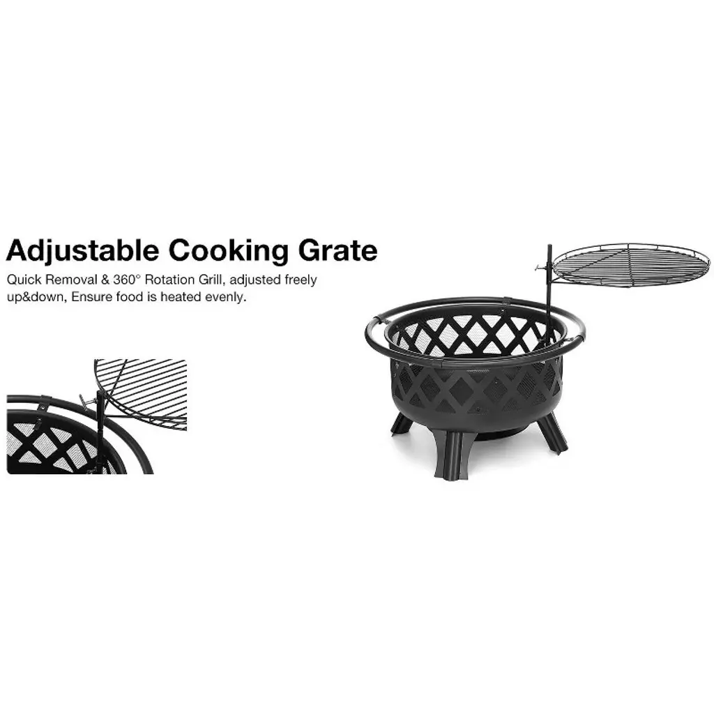 Experience the warmth and charm of outdoor fires with our 30-inch Wood Burning Fire Pit. Crafted from durable alloy steel with a black high-temperature paint finish, it ensures longevity and resistance to harsh weather conditions. The adjustable grill offers versatility in cooking, while the removable heat shield simplifies cleaning. Safety features like the spark screen and stable four-leg design make it perfect for family gatherings and cozy evenings outdoors. Specifications: Product Type: Fire Pit Material: Alloy Steel Finish: Black High-Temperature Paint Heat Resistant Coating: Yes Weather Resistant: Yes Product Shape: Round Location: Outdoor Package Size: 25 x 25 x 13 inches Package Weight: 31 lbs. Package Included: 1 x Fire Bowl 1 x Mesh Spark Screen 1 x Ash Plate 4 x Legs 4 x Outer Handles 1 x Cooking Grate 1 x Fireplace Poker 1 x User Manual