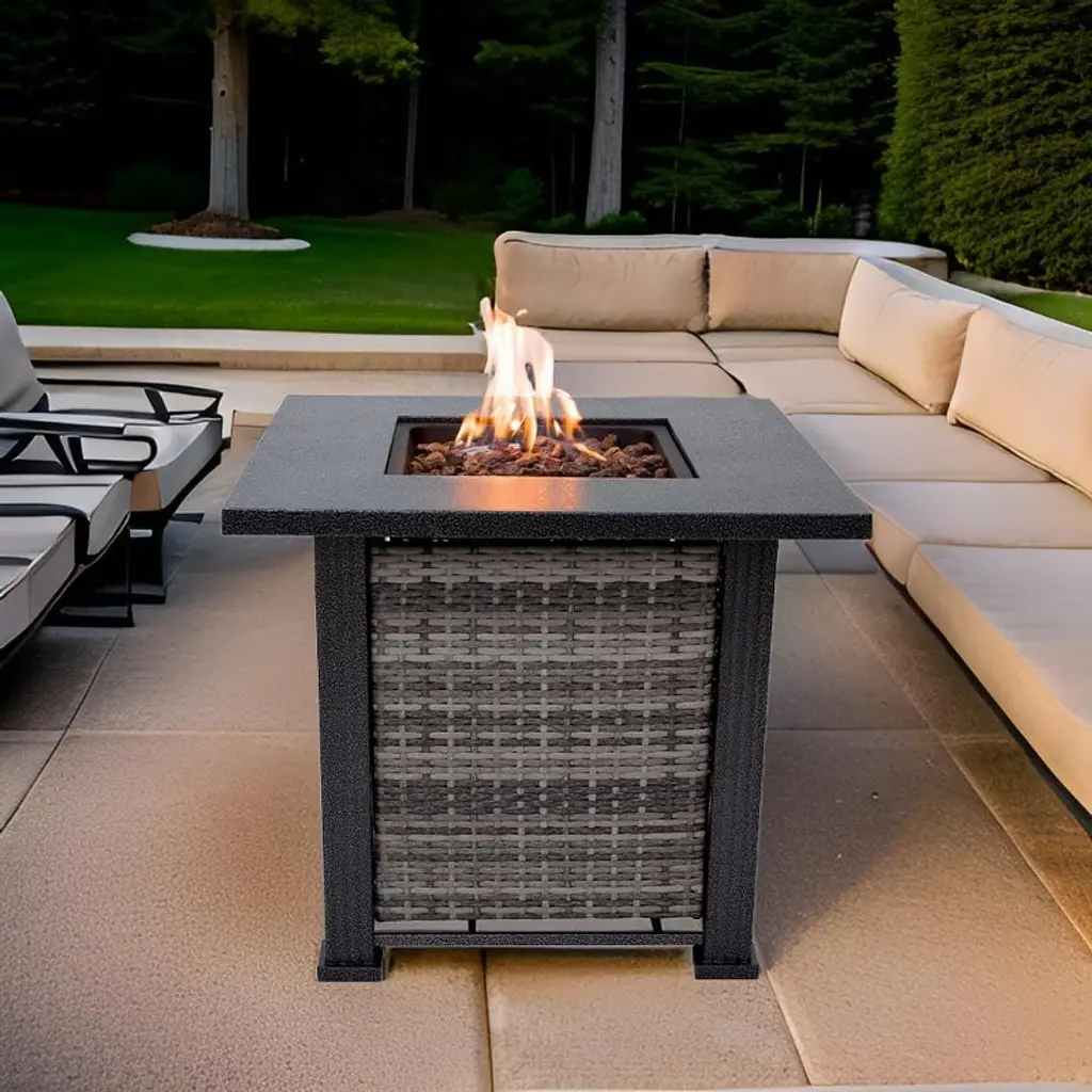 This tabletop firepit is the perfect size for outdoor events, measuring 28 inches in length, 28 inches in width, and 24.4 inches in height, providing ample space for drinks and snacks while fostering a relaxing ambiance. Each unit is rigorously tested to meet high safety standards and is CSA-certified for user ease; simply connect a propane tank (not included), secure it on the metal stand, and enjoy the warmth. The package includes lava rocks, a lid, and a cover for the burner to ensure safety when not in use. Offering a hassle-free alternative to traditional wood-burning fire pits, this model allows you to easily adjust the flame from low to high without dealing with smoke or ash, capable of producing up to 50,000 BTU to keep your surroundings warm. Constructed from strong, high-quality metal, the fire pit boasts durability and weather resistance, making it both a practical and stylish addition to any outdoor space. Its sleek design complements any patio decor, transforming your outdoor area into a cozy retreat perfect for gatherings or quiet evenings under the stars.