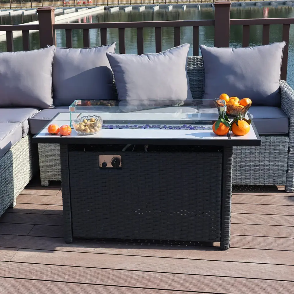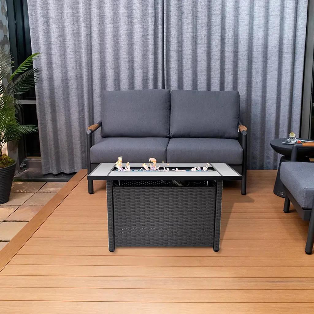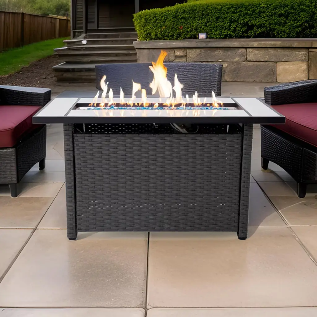 This tabletop firepit is the perfect size for outdoor events, measuring 45 inches in length, 23 inches in width, and 25 inches in height, providing ample space for drinks and snacks while fostering a relaxing ambiance. Each unit is rigorously tested to meet high safety standards and is CSA-certified for user ease; simply connect a propane tank (not included), secure it on the metal stand, and enjoy the warmth. The package includes glass beads, a lid, burner cover, fire pit cover, and a metal stand for securing your propane tank. Offering a hassle-free alternative to traditional wood-burning fire pits, this model allows you to easily adjust the flame from low to high without dealing with smoke or ash, capable of producing up to 50,000 BTU to keep your surroundings warm. Constructed from strong, high-quality metal, the fire pit boasts durability and weather resistance, making it both a practical and stylish addition to any outdoor space. Its sleek design complements any patio decor, transforming your outdoor area into a cozy retreat perfect for gatherings or quiet evenings under the stars.