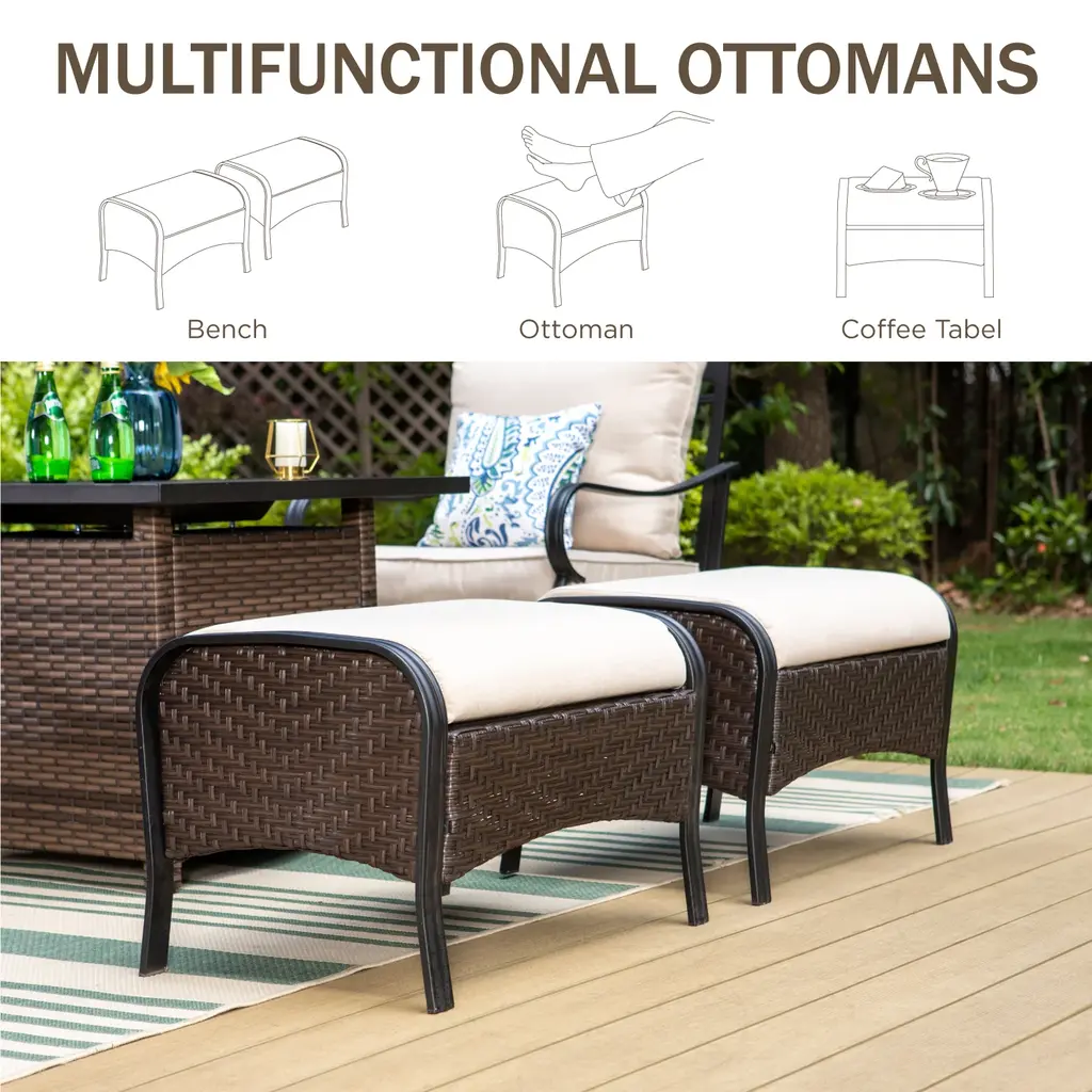 Seat cushions are filled with deform-resistant high-density sponges. Water-resistant cushion covers ensure easy cleaning and maintenance, enhancing your outdoor living experience with style and functionality. The 50,000 BTU fire burner offers a smoke-free, ash-free real fire, perfect for creating a romantic atmosphere outdoors. PE Rattan adds a natural touch to the design without compromising durability.
