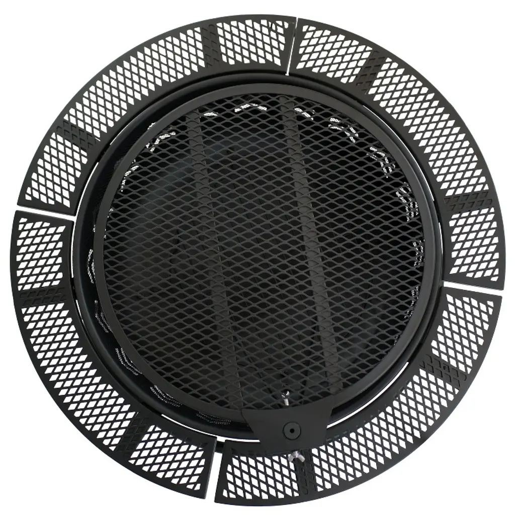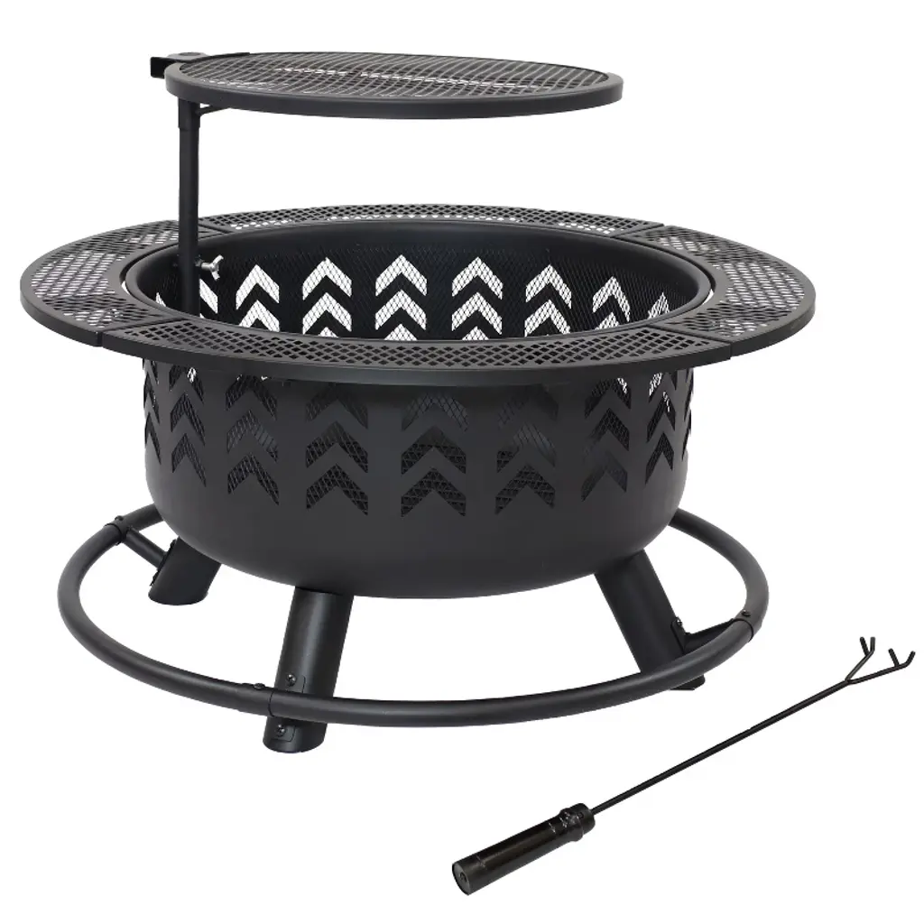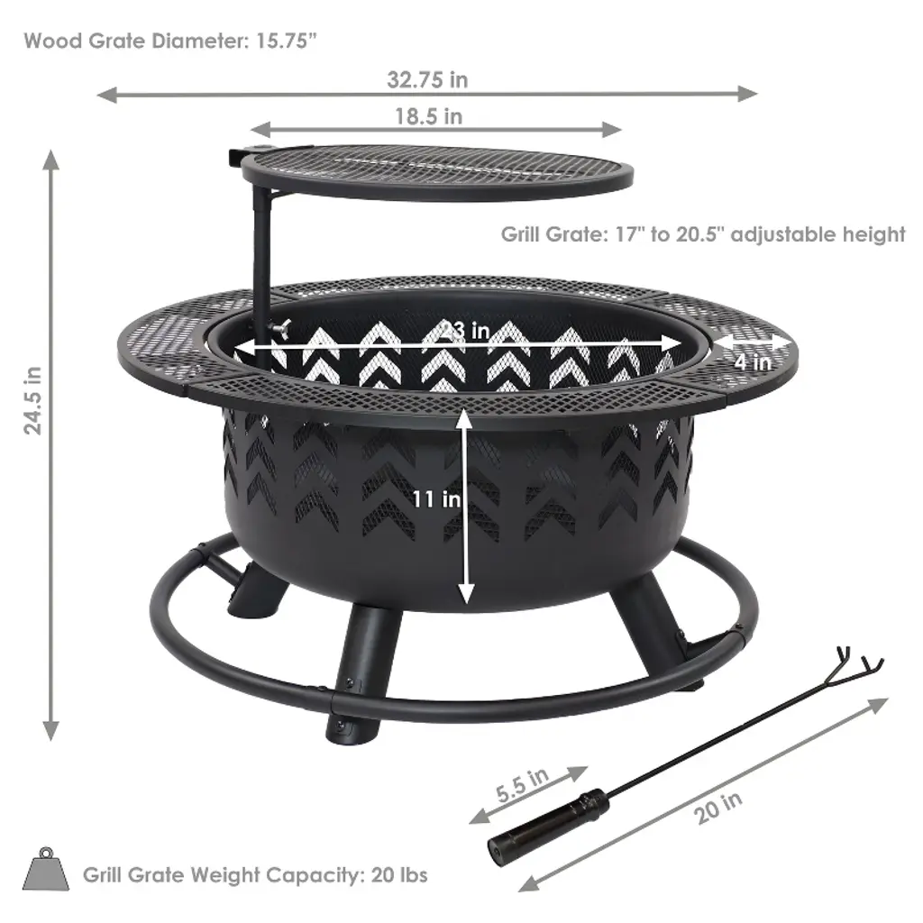 Add this modern fire pit to the backyard and invite friends and family over for tasty, roasted food. This large wood fire pit provides plenty of room for everyone to gather around. Plus, it features a convenient grill system to cook up a variety of campfire favorites. This round fire pit features a contemporary arrow pattern that will complement any outdoor decor style. Made of sturdy steel, this fire pit features a heat-resistant paint finish in classic black. Its durable construction ensures that its strength and beauty will last season after season. A protective cover is also included. It is made of tough PVC to protect the fire pit when not in use. After ensuring that the fire is completely extinguished and the unit is cool to the touch, place the protective cover over the steel fire pit to help keep it safe from the outdoor elements.• GREAT FOR GROUP GATHERINGS: This outdoor wood-burning fire pit measures 32.75" in diameter x 24.5" H and weighs 25.6 lbs. The inner bowl measures 23" in diameter x 24.5" H and a 4" W ledge wrapped around it. It includes an 18.5" round cooking grate that is capable of supporting up to 20 lbs of food. The grate has an adjustable height between 17" and 20.5" H. The fire pit has a clearance height of 5.5" H. A 20" L poker with a 5.5" handle is included.• HEAVY-DUTY CONSTRUCTION: This sturdy patio fire pit is made from durable steel with a black, heat-resistant paint finish that is sure to last fire after fire. Plus, a tough PVC fire pit cover is included to protect the fire pit from the outdoor elements when not in use.• INCLUDES COVER, WOOD GRATE, AND COOKING GRATE: This product comes complete with everything needed to enjoy an outside fire pit. Use the wood grate to place the firewood at the right height for optimal airflow for a burning fire. Cook up tasty meals on the swivel grill. Once the fire is extinguished and completely cool, cover the metal fire pit with a durable cover to protect it against the outdoor elements.• STYLISH BACKYARD CENTERPIECE: This contemporary fire pit bowl features a striking design that is sure to impress. Create a cozy place where guests can gather in the backyard or on the patio.• WORRY-FREE PURCHASING: Sunnydaze Decor backs its products with a 1-year manufacturer's warranty.