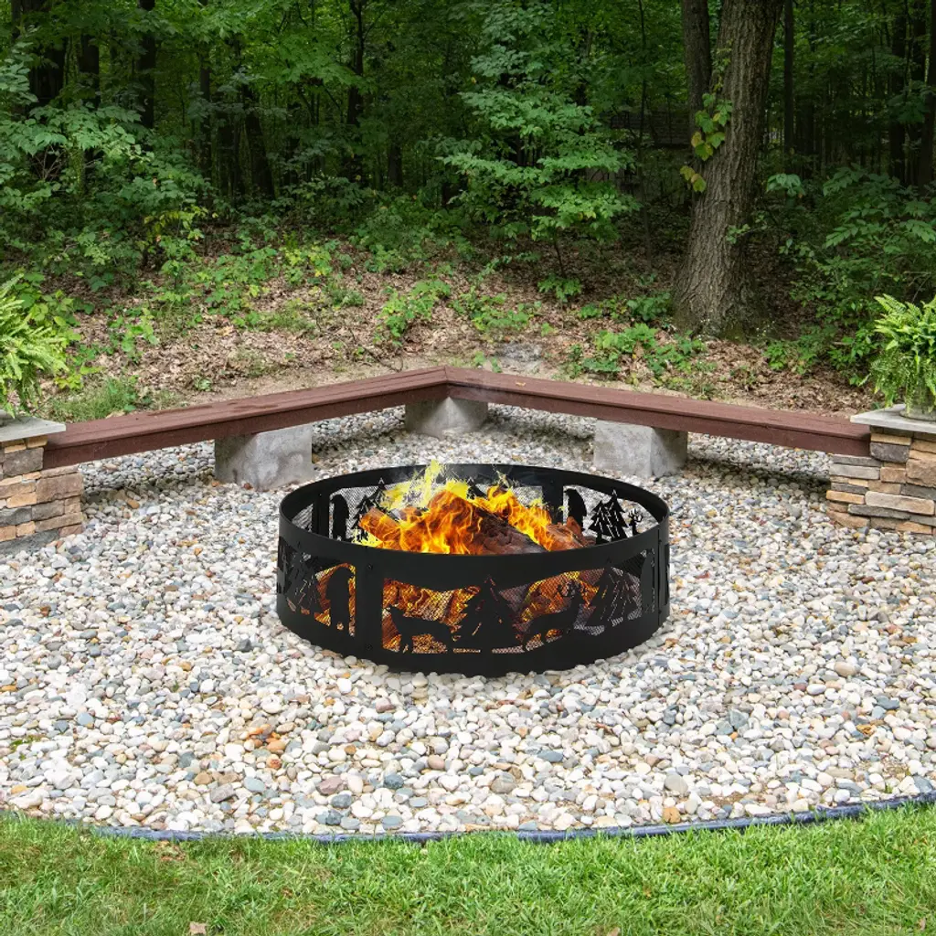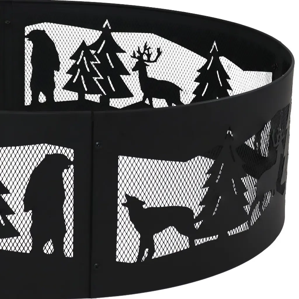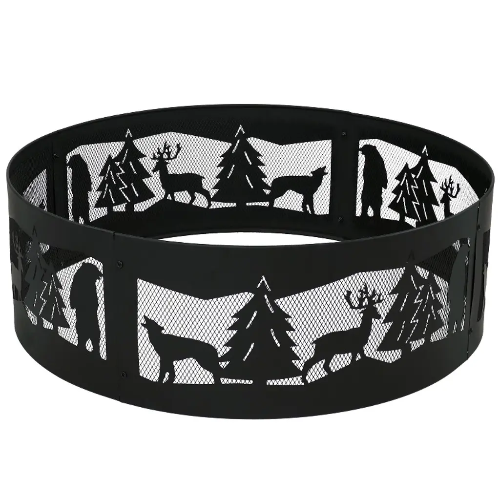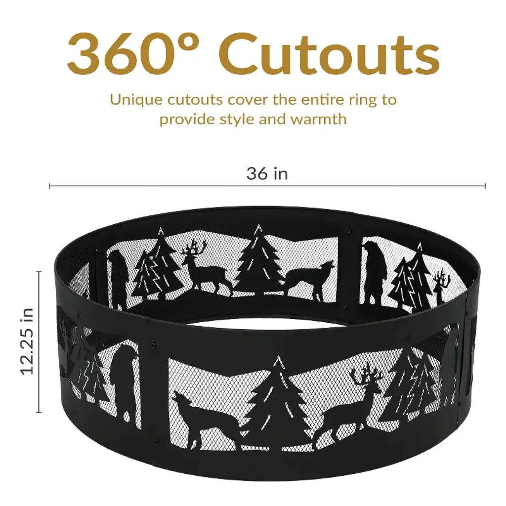 Capture the wild beauty of the great outdoors with this heavy-duty fire pit ring. Featuring a 360-degree design and a black finish, this firepit ring has an intricately carved design of a rugged outdoor scene with forest plants and creatures. Its open design makes it wonderful for roasting marshmallows and hot dogs over an open fire. This durable bonfire fire pit is made of dependable steel for a long-lasting product life. Plus, it is easy to assemble. Simply connect the four pieces together and the fire ring is ready to use. Its lightweight design makes it easy to move from place to place in the backyard. It’s also easy to pack up and take along during the next camping trip or day trip. This unique backyard fire pit makes a wonderful gift for the hunter, outdoorsman, or fisherman in anyone’s life.• PORTABLE OR PERMANENT DESIGN: This fire ring for outside wood burning measures 36" in diameter x 12.25" H and weighs 13.2 lbs. The fire pit kit's lightweight design makes it easy to take along during camping trips while still providing plenty of space for people to gather or have friends and family over for a bonfire in the backyard. The ring is 1.5 mm thick. • HEAVY-DUTY CONSTRUCTION: The portable fire pit for camping is made from steel with a high-temperature paint finish for long-lasting quality and added resistance to rust. It is designed to withstand the elements outdoors. It can be used as an above- or in-ground fire pit.• EASY TO ASSEMBLE: Spend less time assembling and more time enjoying the fire. The bonfire pit comes in 4 pieces and can be easily assembled right out of the box. No additional tools or hardware are required.• IMPROVED AIRFLOW: The 360-degree cutouts on this steel fire pit ring depict a rugged yet beautifully detailed forest scene that can be seen from any angle, making it a great gift for outdoorsmen everywhere. The mesh design allows the fire to burn steadier for long-lasting fires with less smoke and more heat. Enjoy hours sitting around this camp fire pit with family and friends (Note: There is no bottom to this ring).• WORRY-FREE PURCHASING: Sunnydaze Decor backs its products with a 1-year manufacturer's warranty.