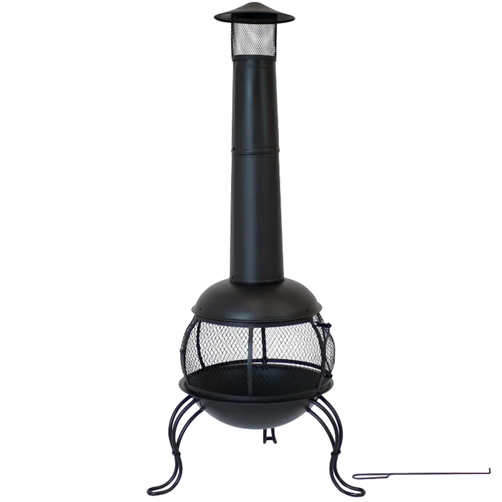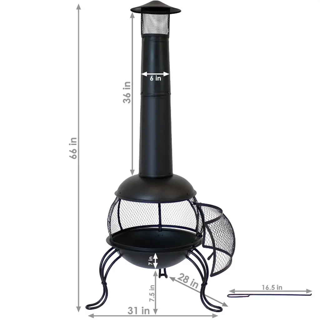 Bring style and warmth to the patio or backyard with this outdoor wood-burning chiminea fire pit. First utilized 400 years ago in Spain and Mexico, chimineas were a staple in every home. They were used for cooking, baking, and heating, all in one place. This modern chiminea features a durable steel construction with a high-temperature black paint finish so it is sure to last through many seasons. This fire pit also includes a poker to stir the logs and coals to keep the fire going without having to worry about burning hands. This chiminea fire pit also features a log grate for the fire area that is removable when needed. The chiminea also includes a rain cap to keep water out of the chiminea's interior. With its unique design and sleek, contemporary aesthetic, this fire pit is sure to bring fun and functional heat to the patio, deck, yard, cabin, or any other outdoor space with ease.• 360-DEGREE FIRE VIEW: This chiminea measures 31" W x 28" D x 66" H and weighs 20.8 lbs. The bowl measures 24" in diameter x 7 " D. It sits 7.5" off the ground. It has 3 steel legs. Each leg measures 17" long (curved) x 3" W x 2.75" front-back. The door opening measures 20" W x 10" H. The flue measures 6" in diameter x 36" H. The cap measures 10" in diameter. The wood grate measures 11.5" diameter x 1.5 " off the bowl bottom.• DURABLE CONSTRUCTION: This outside chiminea fire pit is made from heavy-duty steel for added quality with a black high-temperature paint finish for a sleek modern look. The metal fire pit is designed to withstand the elements outdoors.• SIMPLE ASSEMBLY: This chiminea includes everything needed for assembly, including hardware, a cover, and tools. The chiminea fire pit comes with 16.5" poker and can be placed in any yard for instant warmth and conversation.• GREAT ON THE PATIO: The chiminea fireplace provides a central gathering place for any outdoor living space. This modern fire pit adds a stylish touch to any backyard.• WORRY-FREE PURCHASING: Sunnydaze Decor backs its products with a 1-year manufacturer's warranty.