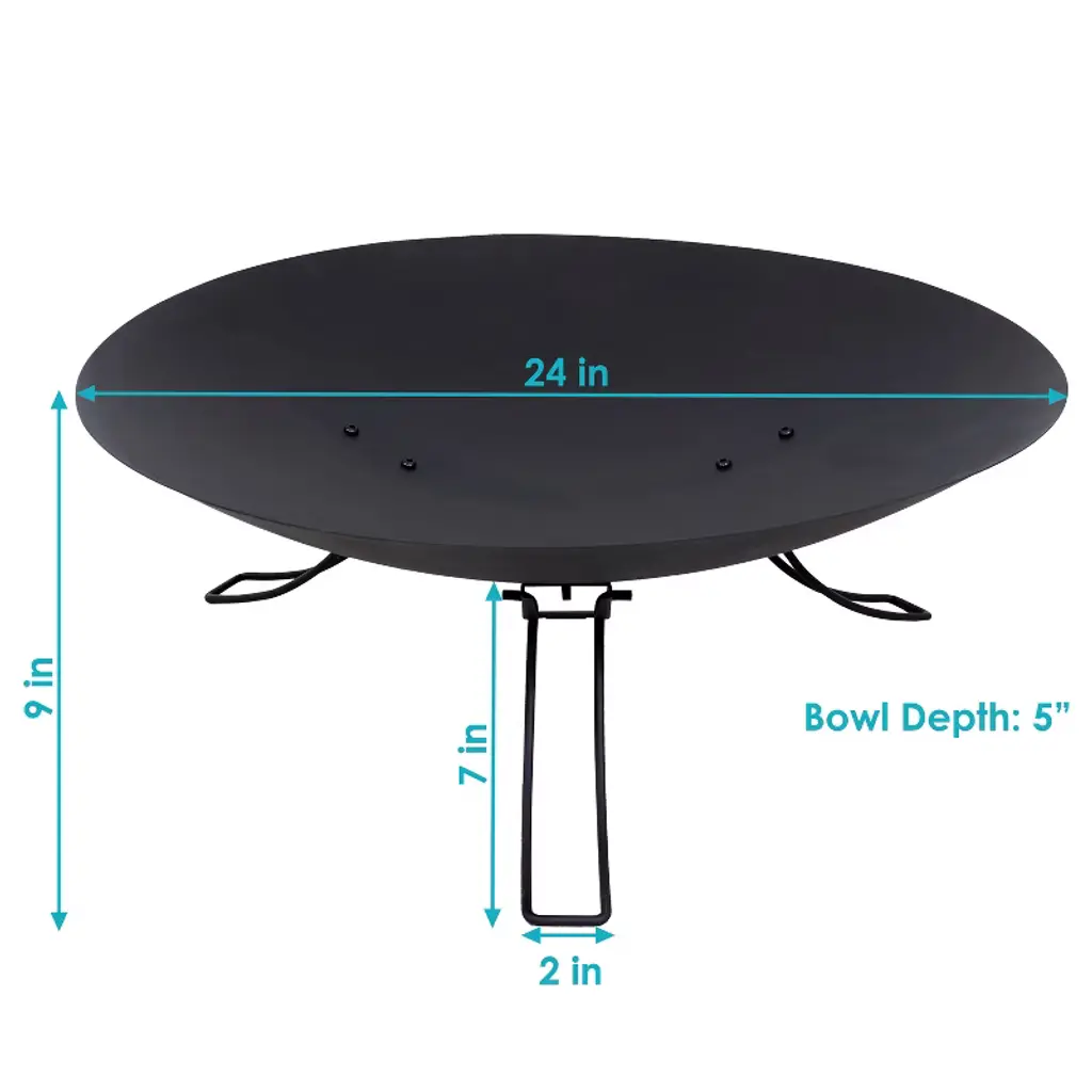 Add warmth and style to outdoor spaces with this modern, portable fire pit. Designed for convenience, it features three foldable legs that tuck neatly against the bowl for compact storage in a garage, shed, or camper. This space-saving design also makes it easy to transport, making it a practical option for campsites, cabins, or backyard gatherings. The fire pit is constructed from durable powder-coated steel with a high-heat resistant finish to help ensure lasting performance across multiple seasons. Its open bowl shape offers easy access to flames, making fire tending simple and efficient. Whether placed on a patio or packed up for a weekend trip, this fire pit adds a striking, functional element to outdoor environments. With a sturdy frame and modern profile, it blends reliability and portability for a dependable wood-burning experience in any setting.• SPACE-EFFICIENT SIZE: This wood-burning fire pit is a great size for the backyard or campsite. This fire pit is 24" in diameter x 9" H overall and weighs 8.8 lbs. The fire bowl is 24" in diameter x 5" H and sits 4" off the ground. The foldable legs are 2" W x 7" H. The fire pit has a weight capacity of 20 lbs.• COMPACT AND PORTABLE DESIGN: Foldable legs and the lightweight design allows the fire pit to collapse for easy transport and space-saving storage in sheds, campers, or garages.• DURABLE CONSTRUCTION: This round fire pit is made from durable 1.5 millimeter thick powder-coated steel with a high-heat protective finish for lasting use.• NO ASSEMBLY REQUIRED: This fire pit is ready for use right out of the box. Simply unfold the legs from beneath the fire bowl, set in on the ground, and build a fire to enjoy.• WORRY-FREE PURCHASING: Sunnydaze Decor backs its products with a 1-year manufacturer's warranty.