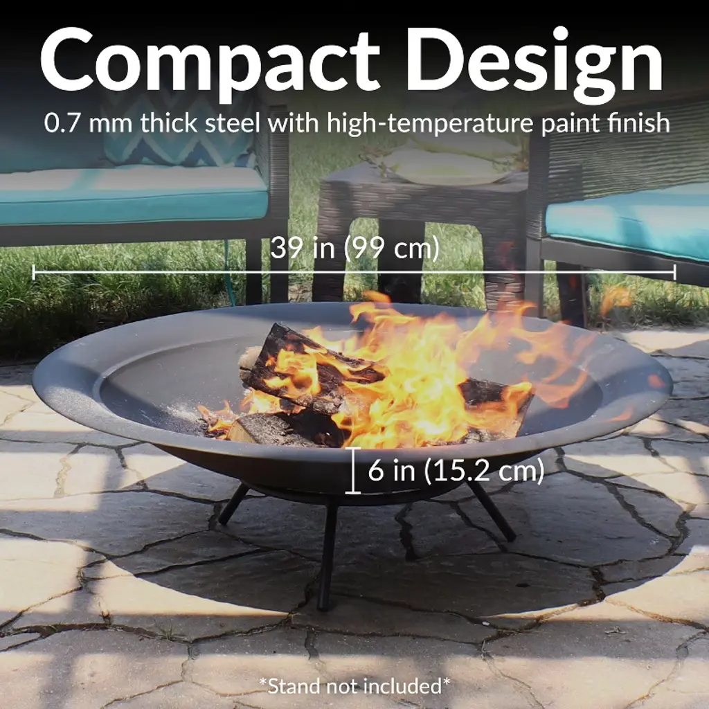 Build a custom firepit for outside gatherings with friends on cool evenings, or replace an existing bowl to keep the bonfires going for years to come with this fire pit bowl for outside. Place the firepit insert in an existing stand or design a custom DIY stand for the bowl to give a fire pit a personal touch. Each package includes one steel fire pit bowl. The outdoor firepit bowl features steel construction with a high-temperature paint finish that can easily withstand the heat of the fire and even harsh weather conditions for long-lasting use. Keep the fire going all night long in any backyard or campsite.• LIGHTWEIGHT AND PORTABLE SIZE: This round fire pit insert has an outer diameter of 39" (30" inner diameter) x 6" H and weighs 8 lbs. It has a 5" bowl depth. Its convenient, lightweight design makes it easy to pack up and use with a portable stand on day trips.• BUILT TO LAST: The DIY fire bowl for outside features durable steel construction with a high-temperature paint finish for long-lasting strength. The classic black color will complement any stand or custom-built fire pit, and its durable design ensures lasting strength and beauty.• VERSATILE DESIGN FOR CUSTOM FIRE PITS: This wood fire pit kit can be used for a variety of replacement or customization purposes. Use it to replace a worn-out fire bowl on a stand or build a custom patio fire pit around the bowl.• EASY TO USE: Simply place the wood-burning fire pit liner bowl in a stand and it is ready for use (stand is not included).• WORRY-FREE PURCHASING: Sunnydaze Decor backs its products with a 1-year manufacturer's warranty.