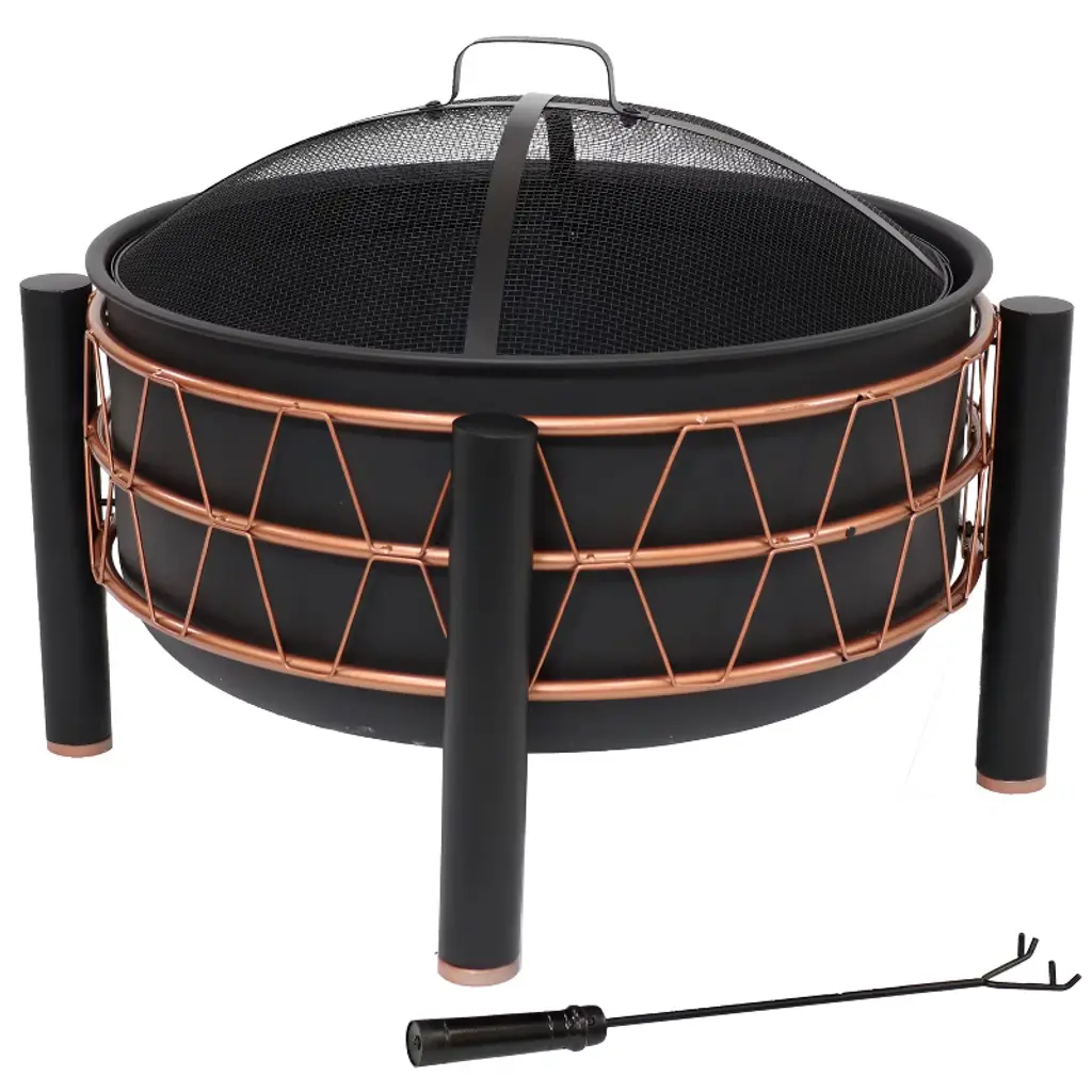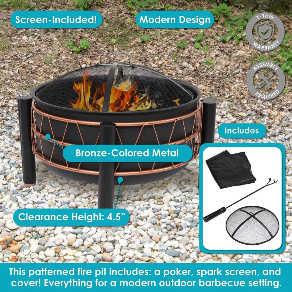 Gather family and friends around this elegant patio fire pit for a fun-filled bonfire. This sophisticated metal fire pit is a wonderful centerpiece for the backyard or the patio. The open design makes it a great option for roasting marshmallows and hot dogs. This stylish backyard fire pit features contemporary flair with a unique, bronze-colored metal trapezoid design surrounding the bowl. The rest of the fire bowl features a high-temperature paint finish in classic black for lasting beauty even after dozens of bonfires. It features a sturdy 4-leg design, and its large diameter ensures that there is enough room for everyone to gather around the fire. The heavy-duty fire pit is constructed of durable steel for strength that will last season after season. Plus, this fire pit includes a durable PVC protective cover. After the fire pit has been completely extinguished and is cool to the touch, use the cover to protect the fire pit.• GREAT FOR COZY GATHERINGS: This outdoor fire pit measures 32" W x 32" D x 15" and weighs 21.8 lbs. The bowl measures 24.5" in diameter x 15" H. It has a clearance height of 4.5" H and each leg measures 13.75" H. It includes a 20" L poker with a 5.5" L handle. The smoke screen measures 22.5" in diameter x 7" H and has a 4.25" W x 1.75" H handle on top.• HEAVY-DUTY CONSTRUCTION: This sturdy wood fire pit is made from durable steel with a black, heat-resistant paint finish that is sure to last fire after fire. The bowl is surrounded by a contemporary repeating trapezoid pattern with a bronze finish. The durable protective cover is made from PVC.• INCLUDES COVER, BUILT-IN WOOD GRATE, AND SPARK SCREEN: This product comes with a durable cover to help prolong the fire pit's life as well as a sturdy metal spark screen. The spark screen will help keep stray sparks and embers safely contained within the fire pit bowl. The built-in wood grate places the firewood at the right height for optimal airflow. Once the fire is extinguished and completely cool, cover the fire pit with the durable cover to protect it against the outdoor elements.• STYLISH BACKYARD CENTERPIECE: This contemporary round fire pit features a striking design that is sure to impress. Create a cozy place where guests can gather in the backyard or on the patio.• WORRY-FREE PURCHASING: Sunnydaze Decor backs its products with a 1-year manufacturer's warranty.