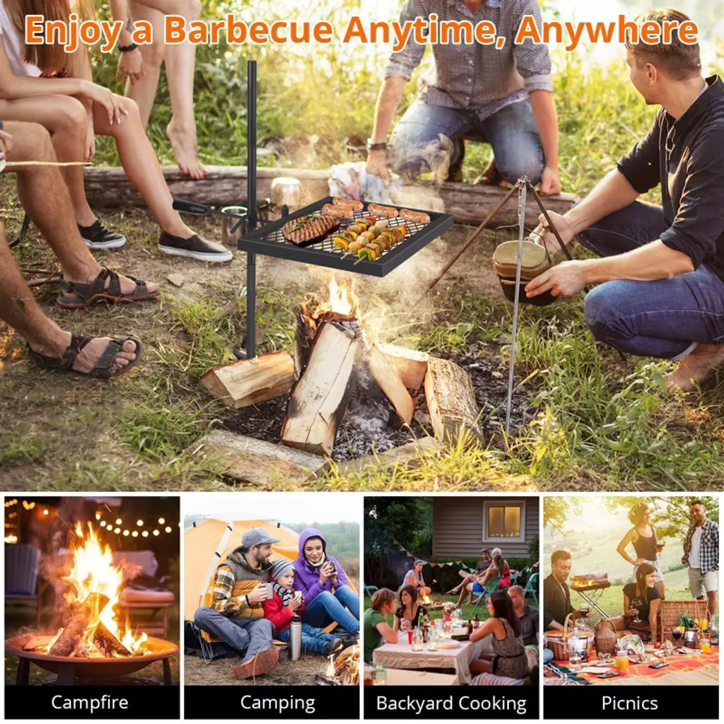 This heavy-duty steel fire pit grate is designed for durable, versatile outdoor cooking. Featuring a rust-resistant coating, adjustable height, and smooth 360° rotation, it offers effortless grilling and seamless transitions between cooking styles. Its foldable design with handles ensures easy portability and storage, while the diamond mesh surface promotes even heat distribution for perfectly cooked meals. Ideal for a wide range of outdoor settings, this grill performs reliably over various fuel sources.