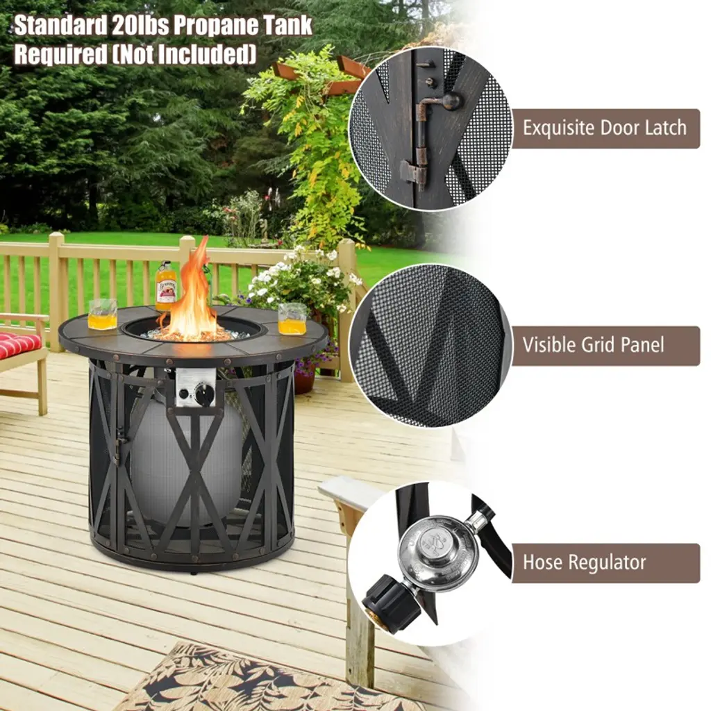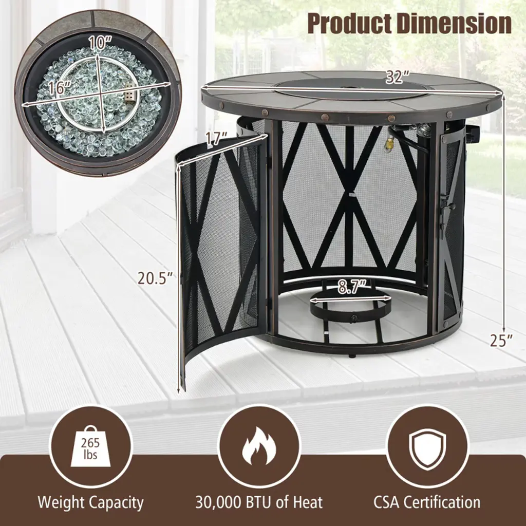 Create an ideal outdoor gathering place with this 32" fire pit table! It includes a removable lid that allows it to be used as an outdoor coffee table or a gas fire pit table. This outdoor fire pit table is constructed of a powder-coated metal frame to ensure a long service life. A rainproof cover is supplied to protect it from outdoor elements. The base of the fire pit table can perfectly accommodate a 20 lbs propane tank (not included). What's more, it is equipped with an ignition control device, stainless steel burner and glass stones for a quick fire-up and beautiful flames. Designed with 30,000 BTU of heat and a trendy look, this fire pit table is definitely a good choice for your patio, deck, garden, backyard and more.Features2-in-1 design, serve as a fire pit table or a coffee table30,000 BTU heat output promises sufficient warmthStandard 20lbs propane tank required (not included) Ignition device for easy ignition and flame adjustmentBuilt-in glass stones bring beautiful and vivid flamesPowder-coated metal frame for long-term outdoor useSupplied with an extra PVC cover to prolong its lifespanSpecifications: Color: Black, Gray Material: Metal, Stainless Steel, Ceramic Tile Overall Dimension: 32" x 25" (Dia x H) Dimension of Lid: 16" x 16"(W x D) Diameter of Fixing Ring: 8.7" Weight Capacity of Tabletop: 265 lbs Net Weight: 69 lbs Heat Output: 30,000 BTU Package Includes: 1 x Propane Fire Pit Table 1 x Box of Fire Glasses 1 x PVC Cover 1 x Instruction