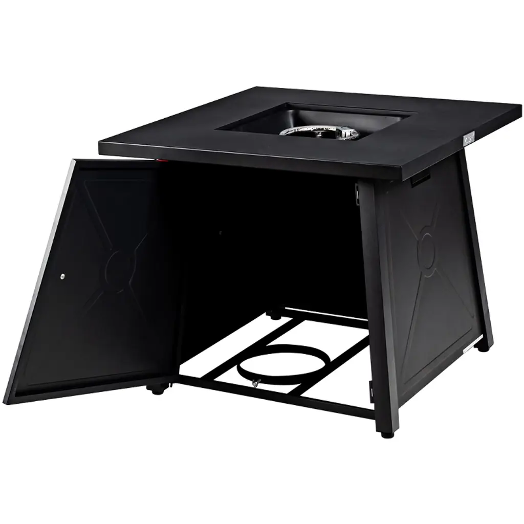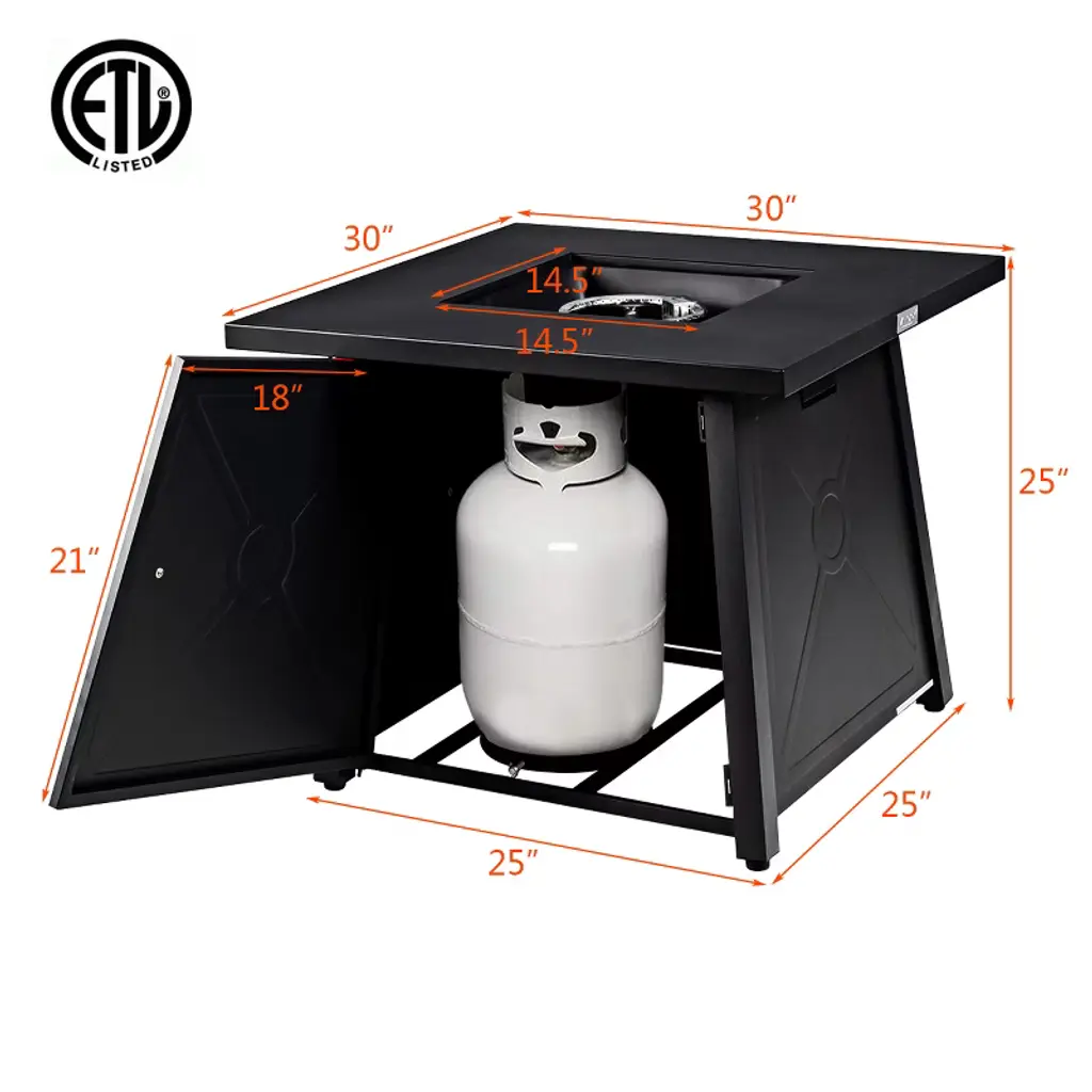 Our fire pit table is made of heavy-duty steel material, which ensures the durability and sturdiness for long servicing life. Unlike the traditional fire pit using firewood, our fire pit table uses propane gas to provide stable and clean combustion, which can protect you from ash and smog. In order to increase functionality, the fire pit table also provides a lid, which can be easily converted into an outdoor coffee table, a casual bar or a simple storage table. When you don't need to use the heating function, just cover the lid and you can have a spacious table for snacks, drinks. It is perfect for garden, balcony, and courtyard!FeaturesPit table is ETL certified and the regulator is CSA certified to ensure safety Stainless steel burner can prevent rusting even in outdoor humid environment Waterproof PVC cloth cover for outdoor storage in rainy days 50,000 BTU heat output can provide sufficient heat Can be used as a coffee table, a casual bar or a simple storage table Adjustable foot pads to adapt to uneven ground Easy to assemble with detailed instruction Specifications Color: Black Material: Steel Overall Dimension: 30'' x 30'' x 25'' (W x D x H) Heat Output: 50,000 BTU Propane Stove Capacity: 20 lbs. Net Weight: 47lbs Package includes: 1 x Outdoor Fire Pit Table 1 x PVC Cover 1 x Instruction