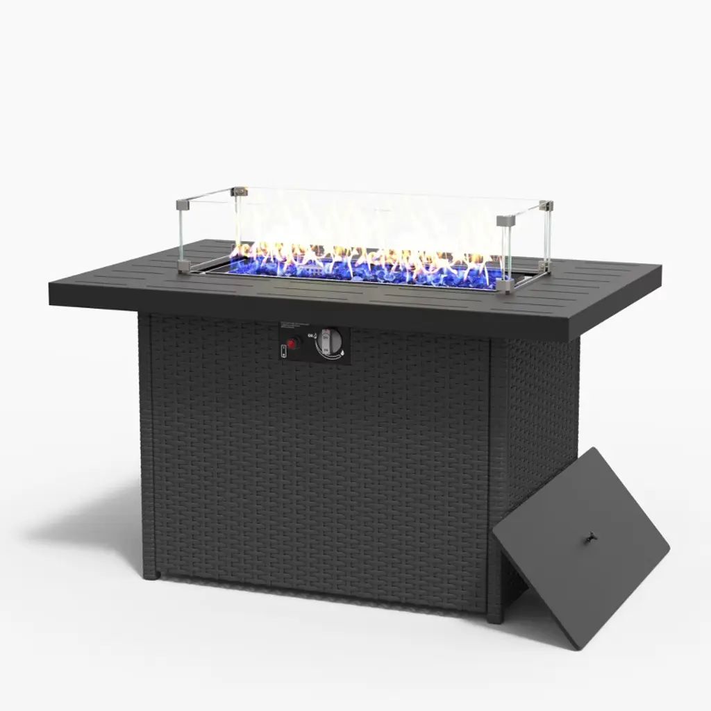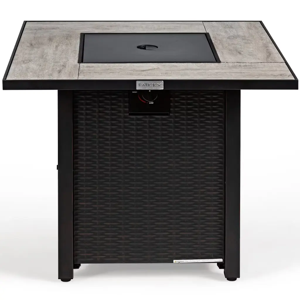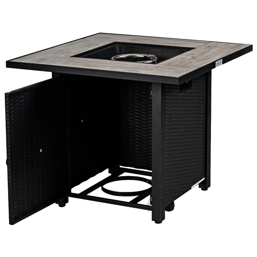 Our fire pit table is made of heavy-duty steel and strong ceramic tile tabletop, which ensures the durability and sturdiness for long servicing life. Unlike the traditional fire pit using firewood, our fire pit table uses propane gas to provide stable and clean combustion, which can protect you from ash and smog. In order to increase functionality, the fire pit table also provides a lid, which can be easily converted into an outdoor coffee table, a casual bar or a simple storage table. Combining a simulated wood grain tabletop and steel panel with rattan look, this elegant fire pit table is a great addition to your outdoor space!FeaturesPit table is ETL certified and the regulator is CSA certified to ensure safety Wood grain tabletop and steel panel with rattan look is perfect for outdoor Waterproof PVC cloth cover for outdoor storage in rainy days 50,000 BTU heat output can provide sufficient heat Can be used as a coffee table, a casual bar or a simple storage table Adjustable foot pads to adapt to uneven ground Easy to assemble with detailed instruction Specifications Color: Black Material: Steel Overall Dimension: 30'' x 30'' x 25'' (W x D x H) Heat Output: 50,000 BTU Propane Stove Capacity: 20 lbs Net Weight: 61lbs Package includes: 1 x Outdoor Fire Pit Table 1 x PVC Cover 1 x Instruction