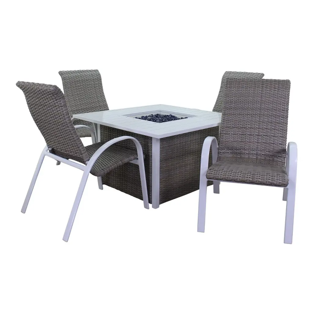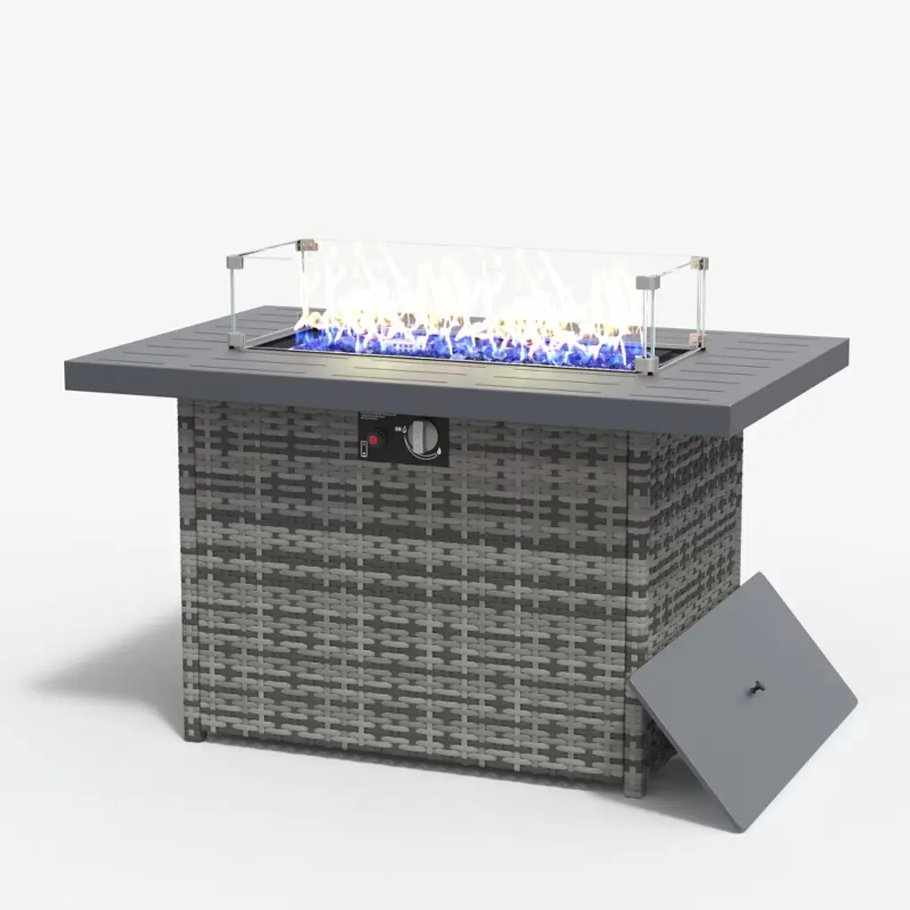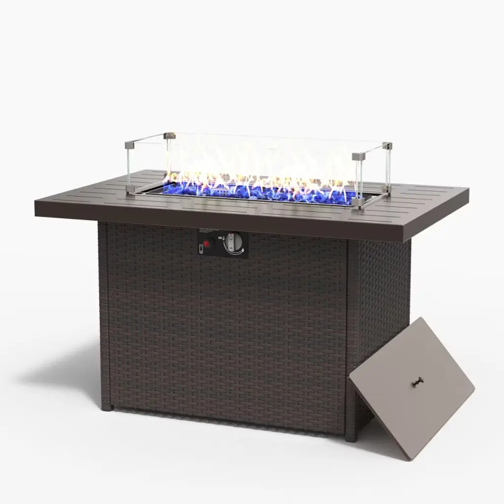 Our fire pit table is made of heavy-duty steel and strong ceramic tile tabletop, which ensures the durability and sturdiness for long servicing life. Unlike the traditional fire pit using firewood, our fire pit table uses propane gas to provide stable and clean combustion, which can protect you from ash and smog. In order to increase functionality, the fire pit table also provides a lid, which can be easily converted into an outdoor coffee table, a casual bar or a simple storage table. Combining a simulated wood grain tabletop and steel panel with rattan look, this elegant fire pit table is a great addition to your outdoor space!FeaturesPit table is ETL certified and the regulator is CSA certified to ensure safety Wood grain tabletop and steel panel with rattan look is perfect for outdoor Waterproof PVC cloth cover for outdoor storage in rainy days 50,000 BTU heat output can provide sufficient heat Can be used as a coffee table, a casual bar or a simple storage table Adjustable foot pads to adapt to uneven ground Easy to assemble with detailed instruction Specifications Color: Black Material: Steel Overall Dimension: 30'' x 30'' x 25'' (W x D x H) Heat Output: 50,000 BTU Propane Stove Capacity: 20 lbs Net Weight: 61lbs Package includes: 1 x Outdoor Fire Pit Table 1 x PVC Cover 1 x Instruction