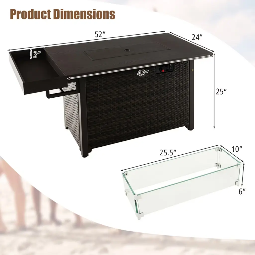 This versatile fire pit table serves multiple outdoor functions, which is perfect for patio relaxation. When the lid is on, it functions as a cozy propane fire pit, keeping you warm in any weather. Remove the lid and it transforms into a spacious coffee table, perfect for entertaining friends and family. An additional storage shelf offers ample space for food and beverages. Furthermore, igniting and adjusting the flame is effortless thanks to the secure ignition system, while the included wind guard ensures uninterrupted burning. Plus, the protective cover allows it to be left outdoors without worry. This gas fire pit table is designed with standard tank seat and gas regulator, and compatible with a standard 20 lbs propane gas tank.FeaturesWind guard for continuous burning Sparkling glass stones for a beautiful flame Protective cover for all-weather protectionSpecifications:Color: Brown Material: PE Rattan, Metal, Stainless Steel, Tempered Glass Overall Dimension: 52" x 24" x 25" (W x D x H) Dimension of Wind Guard: 25.5" x 10" x 6" (L x W x H) Net Weight: 68 lbs Output: 50,000 BTU Weight Capacity of Tabletop: 110 lbs Weight Capacity of Side Shelf: 22 lbs Package Includes: 1 x Propane Fire Pit Table 1 x Wind Guard 1 x Bag of Glass Stones 1 x Protective Cover 1 x Instruction