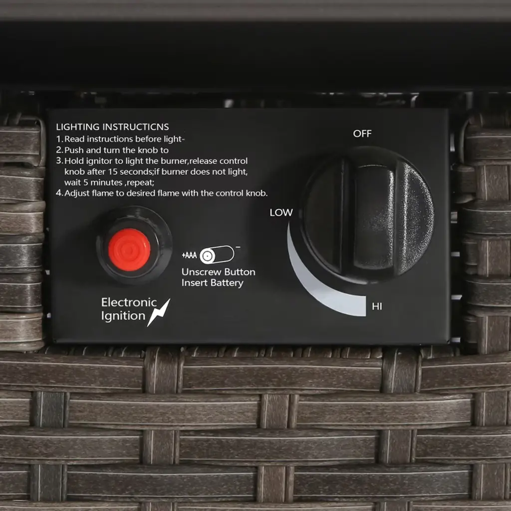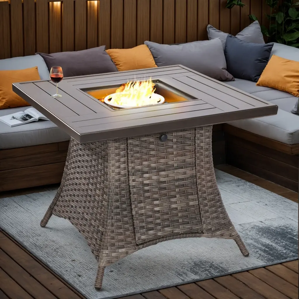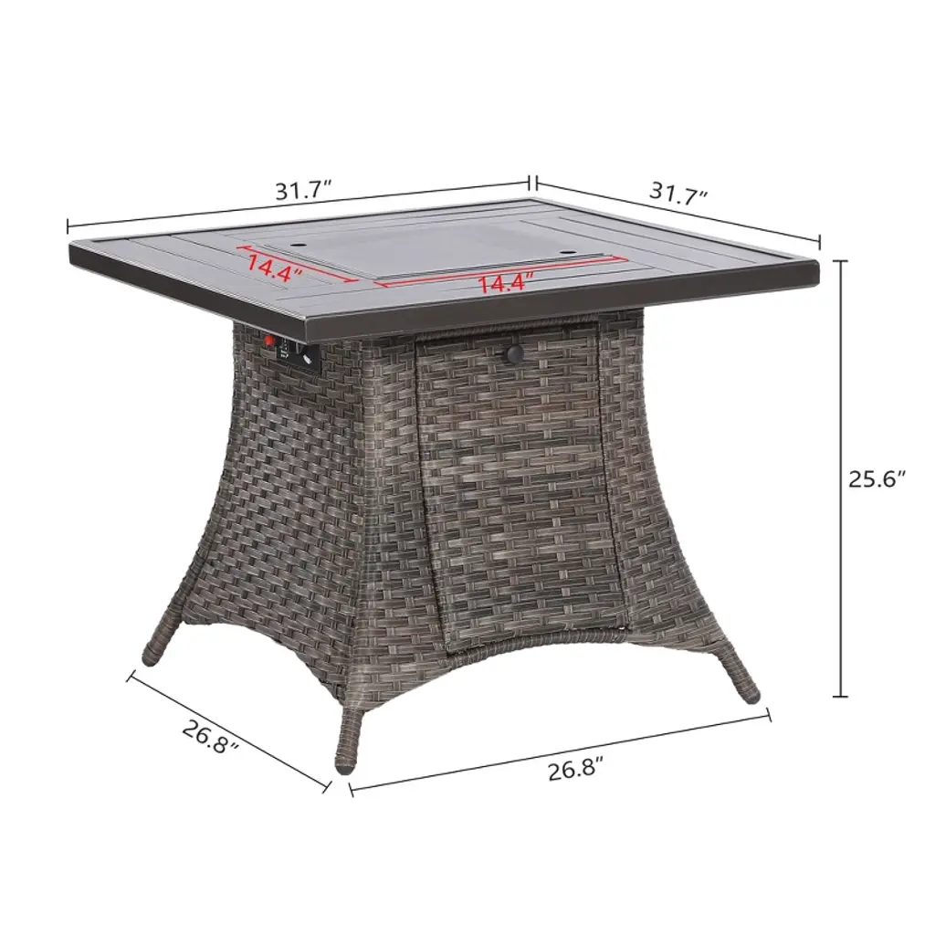 Introducing our 31.7" square fire pit table, a versatile centrepiece for year-round outdoor entertaining. Whether used as a dining table, conversation hub or coffee table, this stunning square propane-fired fire pit adds warmth and ambience. The all-weather top rests on a durable, hand-woven dark brown synthetic wicker base, concealing sturdy steel frames for lasting support. Easily converted into a traditional table, this multi-functional piece will enhance your outdoor space with style and functionality.