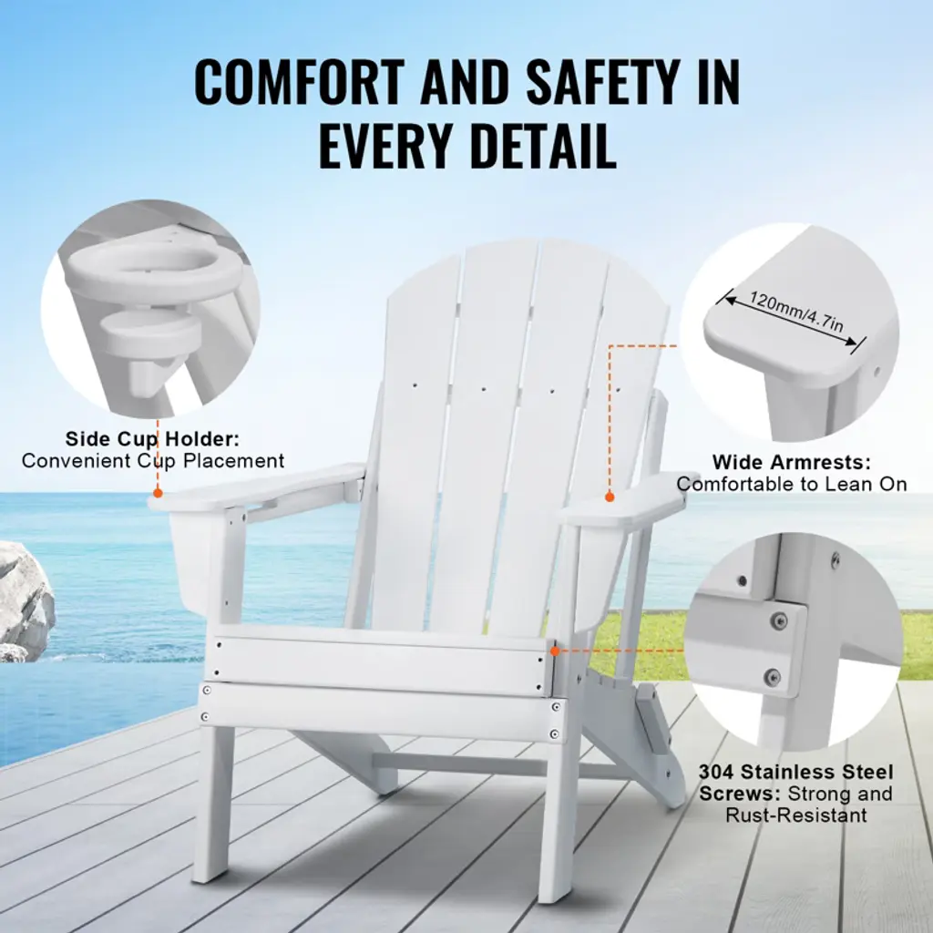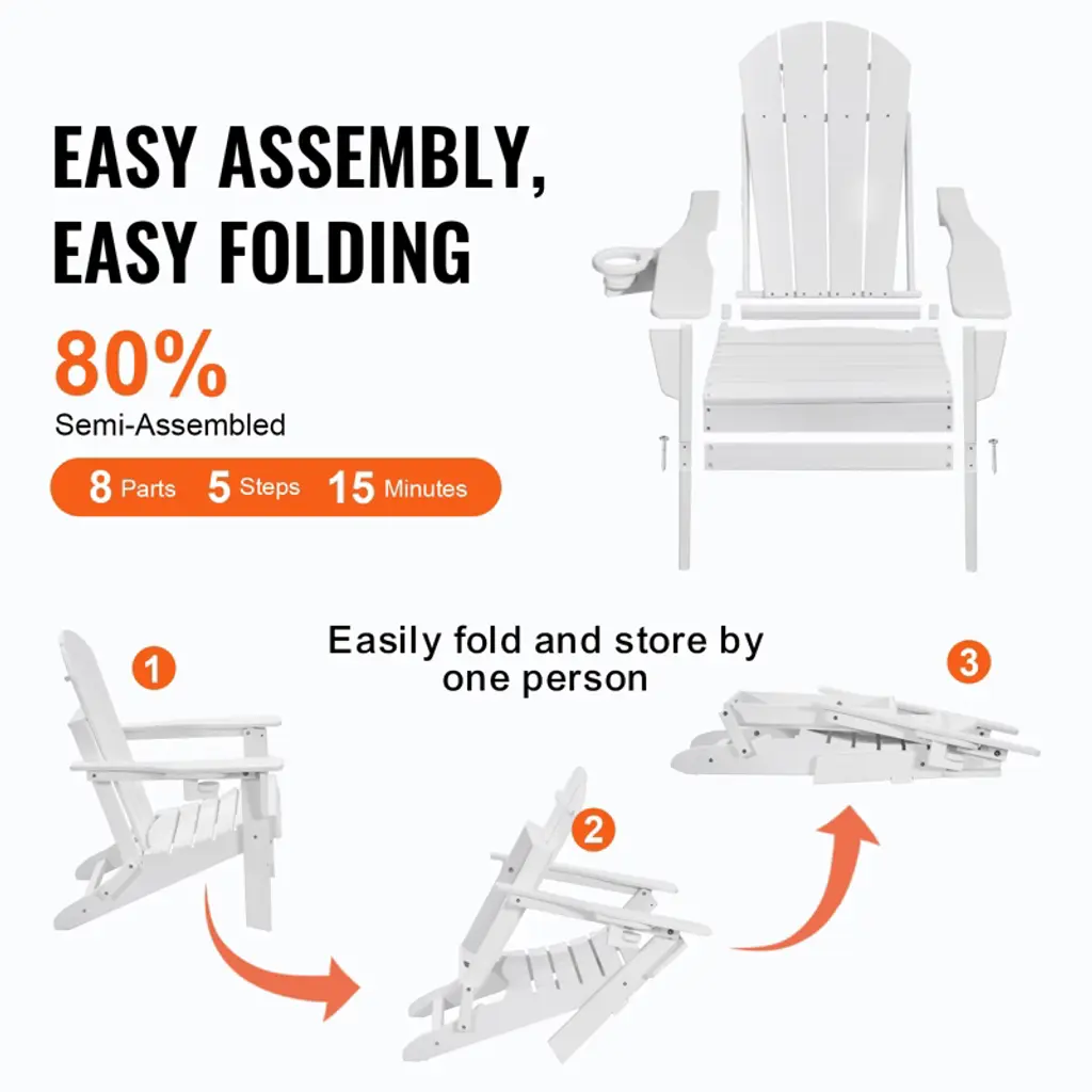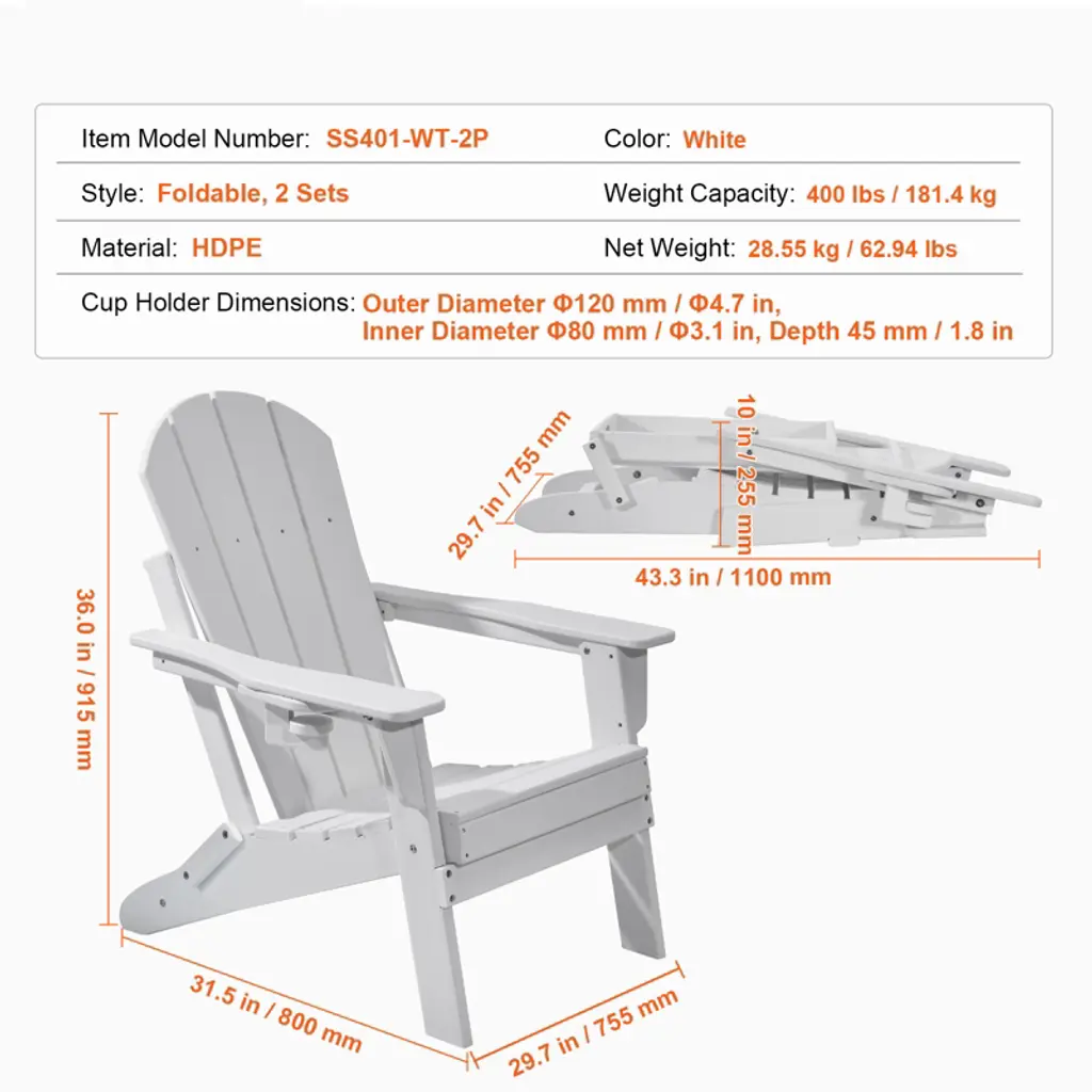 Feature: Foldable Design: This plastic Adirondack chair folds for easy storage and transport, fitting neatly into garages, storage rooms, and more. Note: Color may slightly vary in different lighting. Easy Assembly: With precise pre-drilled holes (tolerance ≤0.019in), assembly takes just 15 minutes using a power screwdriver. Includes 8 parts and 2 accessory packs with clear instructions. Heat and Water Resistant: The folding adirondack chairs are made from high-quality HDPE plastic, it resists heat, water, and various weather conditions without warping, cracking, or rotting. Perfect for patios, gardens, pools, beaches, and porches. Spacious Comfort: Measures 31.5×29.7×36.0 inches, with a wider seat and curved backrest. The 105° tilt angle offers deep seating for effective spine relaxation and fatigue relief. Supports up to 400 lbs, suitable for adults and larger individuals. Thoughtful Details: The wide armrests provide natural arm support, and the built-in cup holder accommodates most outdoor cups for convenience. For easy cleaning, simply wipe with a cloth to keep it looking like new, making it perfect for long-term outdoor use. Package Content 2 x Backrests 2 x Seats 2 x Armrests 2 x Cup Holders 2 x Accessory Boxes 2 x User Manuals