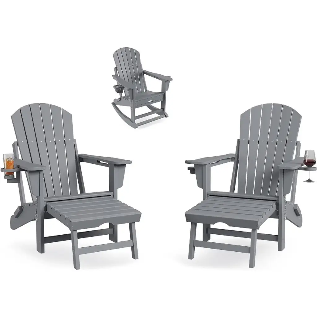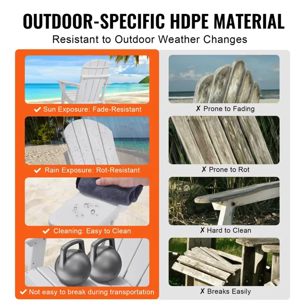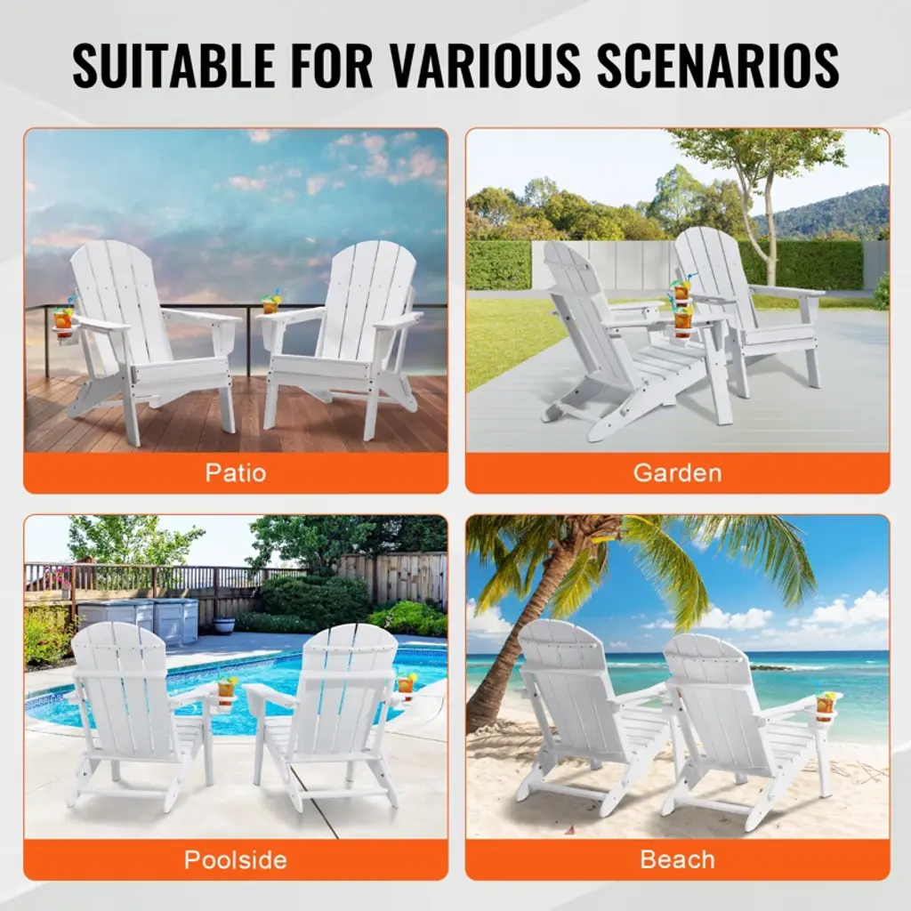 Feature: Foldable Design: This plastic Adirondack chair folds for easy storage and transport, fitting neatly into garages, storage rooms, and more. Note: Color may slightly vary in different lighting. Easy Assembly: With precise pre-drilled holes (tolerance ≤0.019in), assembly takes just 15 minutes using a power screwdriver. Includes 8 parts and 2 accessory packs with clear instructions. Heat and Water Resistant: The folding adirondack chairs are made from high-quality HDPE plastic, it resists heat, water, and various weather conditions without warping, cracking, or rotting. Perfect for patios, gardens, pools, beaches, and porches. Spacious Comfort: Measures 31.5×29.7×36.0 inches, with a wider seat and curved backrest. The 105° tilt angle offers deep seating for effective spine relaxation and fatigue relief. Supports up to 400 lbs, suitable for adults and larger individuals. Thoughtful Details: The wide armrests provide natural arm support, and the built-in cup holder accommodates most outdoor cups for convenience. For easy cleaning, simply wipe with a cloth to keep it looking like new, making it perfect for long-term outdoor use. Package Content 2 x Backrests 2 x Seats 2 x Armrests 2 x Cup Holders 2 x Accessory Boxes 2 x User Manuals